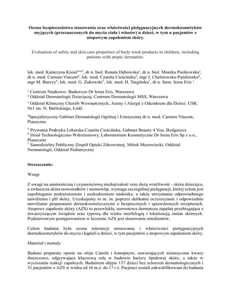 Ocena bezpieczeństwa stosowania oraz właściwości pielęgnacyjnych dermokosmetyków myjących (przeznaczonych do mycia ciała i włosów) u dzieci, w tym u pacjentów z atopowym zapaleniem skóry. Evaluation of safety and skin care properties of body wash products in children, including patients with atopic dermatitis. lek. med. Katarzyna Kisiel¹'²'3, dr n. biol. Renata Dębowska¹, dr n. biol. Monika Pasikowska¹, dr n. med. Carmen Vincent4, lek. med. Czanita Cieścińska5, mgr J. Chełstowska-Paździorko6, mgr M. Burczy6, lek. med. G. Żukowski7, lek. med. H. Targińska7, dr n. farm. Irena Eris ¹ ¹ Centrum Naukowo- Badawcze Dr Irena Eris, Warszawa ² Oddział Dermatologii Dziecięcej, Centrum Dermatologii MSS, Warszawa ³ Oddział Kliniczny Chorób Wewnętrznych, Astmy i Alergii z Odcinkiem dla Dzieci. USK Nr1 im. N. Barlickiego, Łódź 4 Specjalistyczny Gabinet Dermatologii Ogólnej i Estetycznej dr n. med. Carmen Vincent, Piaseczno 5 Prywatna Praktyka Lekarska Czanita Cieścińska, Gabinet Beauty 4 You, Bydgoszcz Dział Technologiczno-Wdrożeniowy, Laboratorium Kosmetyczne Dr Irena Eris Sp z o.o., Piaseczno 7 Samodzielny Publiczny Zespół Opieki Zdrowotnej, Mińsk Mazowiecki, Oddział Neonatologii, Oddział Pediatryczny 6 Streszczenie: Wstęp Z uwagi na anatomiczną i czynnościową niedojrzałość oraz dużą wrażliwość - skóra dziecięca, a zwłaszcza skóra noworodków i niemowląt, wymaga szczególnej pielęgnacji, której celem jest zapobieganie podrażnieniom i uszkodzeniom naskórka, a także utrzymanie odpowiedniego nawilżenia i pH skóry. Uzyskujemy to m. in. poprzez delikatne oczyszczanie i odpowiednie nawilżanie preparatami dermokosmetycznymi o bezpiecznych i sprawdzonych recepturach. Atopowe zapalenie skóry (AZS) to przewlekła, nawrotowa dermatoza zapalna przebiegająca z towarzyszącym świądem oraz typową dla wieku morfologią i lokalizacją zmian skórnych. Podstawowym postępowaniem w leczeniu AZS jest stosowanie emolientów. Celem badania była ocena tolerancji stosowania i właściwości pielęgnacyjnych dermokosmetyków do mycia i kąpieli u dzieci, w tym pacjentów z atopowym zapaleniem skóry. Materiał i metody Badano preparaty oparte na oleju Canola i konopnym, zawierających nienasycone kwasy tłuszczowe, odgrywające kluczową rolę w budowie bariery lipidowej skóry, a także w wyciszaniu reakcji zapalnych. Badaniem objęto 137 dzieci bez schorzeń dermatologicznych i 31 pacjentów z AZS w wieku od 16 m.ż. do 17 r.ż. Pacjenci zostali zakwalifikowani do badania na podstawie wywiadu i konsultacji przeprowadzonej przez dermatologa. Lekarze oceniali stan skóry pacjenta, używając 10-punktowej skali analogowej - przed rozpoczęciem stosowania testowanych preparatów i po dwóch tygodniach ich stosowania. Wyniki Badane preparaty były bezpieczne i dobrze tolerowane zarówno u dzieci bez schorzeń dermatologicznych, jak i u pacjentów z AZS o różnym stopniu nasilenia, niezależnie od wieku. W opinii dermatologów po zastosowaniu obu preparatów obserwowano zmniejszenie suchości skóry i widoczności miejsc przesuszonej skóry, poprawę jej natłuszczenia, elastyczności i gładkości. W opinii pacjentów preparaty były delikatne i zmniejszały objawy suchości i szorstkości skóry. Słowa kluczowe: bariera naskórkowa, emolient, olej canola, olej konopny, atopowe zapalenie skóry Key words: epidermal barrier, emollient, Canola oil, Hemp oil, atopic dermatitis Abstract: The anatomical and functional immaturity and very sensitive children skin, especially the skin of newborns and infants, require a special care. It should prevents irritation and epidermis damages and maintain proper skin hydration and pH. Gently skin cleansing and moisturizing will be suitable by well-prepared cosmetics. Atopic dermatitis (AD) is a common chronic, recurrent, inflammatory dermatosis with associated pruritus, characteristic age-specific morphology and distribution of skin lesions. Emollients should form the basis of atopic dermatitis management. In this study the safety and properties of body wash products in children and patients with mild to severe AD is presented. These dermocosmetic formulations are based on Canola and Hemp oils, containing high ratio of unsaturated fatty acids, which are the key elements of skin lipid barrier formation as well as regulators of inflammatory reactions. The study group consists of 137 children with healthy skin and 31 subjects with atopic dermatitis - aged from 16 months to 17 years. The patients were selected on the basis of dermatological interview and skin examination. Medical doctors were evaluating skin condition of patients using 10 point analogue scale before and after 2 weeks treatment with tested products. Both products were safe for babies and patients with different severity of atopic dermatitis, regardless the age. In opinion of dermatologists products decreased visible dryness of skin as well as increased oilness, elasticity and skin smoothness. In patients’ opinion both products were delicate and reduced symptoms of dryness and roughness of the skin.