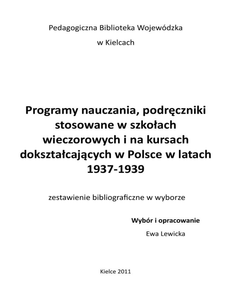 Pedagogiczna Biblioteka Wojewódzka w Kielcach Programy nauczania, podręczniki stosowane w szkołach wieczorowych i na kursach dokształcających w Polsce w latach 1937-1939 zestawienie bibliograficzne w wyborze Wybór i opracowanie Ewa Lewicka Kielce 2011 1. Banaczkowski, Piotr : Program kursu oświatowo-społecznego dla dorosłych na wsi / Instytut Oświaty Dorosłych ; P. Banaczkowski. - Warszawa : Instytut Oświaty Dorosłych, 1937. - 21, *2+ s. – (Wydawnictwo Instytutu Oświaty Dorosłych; nr 115) Biblioteka Narodowa 2. Baranowska, Jadwiga E. : O prawo do oświaty i kultury / J. E. Baranowska. - Warszawa : *s.n.+, 1939. - 15, *1+ s. – (Odb.: Praca Oświatowa, 1939, nr 1) Biblioteka Narodowa 3. Baranowska, Jadwiga E. : Samokształcenie / Jadwiga E. Baranowska. -Warszawa : "Nasza Księg.", 1939. - 11 s. – (Odb.: Encyklopedia wychowania) Biblioteka Narodowa 4. Borowiecka, Maria : Program arytemtyki i geometrji na miejskich kursach dla dorosłych / Maria Borowiecka. - Warszawa : Wydaw. Inst. Ośw. Dorosłych, 1929. - 31 s. – (Wydawnictwo Instytutu Oświaty Dorosłych; ; nr 55) Uniwersytet Rzeszowski 5. Borowiecka, Maria : Program kursów początkowych dla przedpoborowych. Ze wskazówkami organizacyjnymi i dydaktycznymi dla nauczyciela / Maria Borowiecka, Jan Dec, Joanna Landy-Brzezioska. – Warszawa : Wydawnictwo Instytutu Oświaty Dorosłych, 1938 *Zawiera m.in. Dec J. : Wskazówki organizacyjne i dydaktyczne. - Landy-Brzezioska J. : Jezyk polski. *Program+. – Borowiecka M.: Arytmetyka z geometrią. *Program+. – Dec J. : Wiadomości obywatelskie. *Program+.+ Biblioteka Narodowa 6. Czerniewski, Wiktor : Rozwój dydaktyki polskiej w latach 1918-1954 / Wiktor Czerniewski. – Warszawa : Paostwowe Zakłady Wydawnictw Szkolnych, 1963. – S. 101104 : Dydaktyka szkoły dla dorosłych *M.in. programy nauczania i podręczniki stosowane w latach II Rzeczypospolitej, także w szkołach wieczorowych + SYG. 33050, 33051, 33052, 33053, 33054, 39617 Wypożyczalnia Pedagogicznej Biblioteki Wojewódzkiej w Kielcach 7. Grodecka, Katarzyna : Nauczanie języka polskiego w zakresie elementarza na kursach dla dorosłych : (wskazówki metodyczno-dydaktyczne i program) / K. Grodecka. - Warszawa : Skład Główny w Centralnem Biurze Kursów dla Dorosłych, 1922. - 48 s. – (Wydawnictwo Centralnego Biura Kursów dla Dorosłych ; no. 14). - Bibliogr. s. 48. Biblioteka Uniwersytetu Łódzkiego 8. Jurgielewiczowa, Irena : Wykaz lektury z zakresu literatury pięknej w wieczorowej szkole powszechnej dla dorosłych / I. Drozdowicz-Jurgielewiczowa ; / Instytut Oświaty Dorosłych. - Warszawa : skł. gł. Instytut Oświaty Dorosłych, 1936. - *2+, 15, *1+ s. – (Wydawnictwo Instytutu Oświaty Dorosłych; nr 105) Uniwersytet Adama Mickiewicza w Poznaniu 9. Koelichenówna, Stefania : Historia i zagadnienia obywatelskie w szkole, w uniwersytecie powszechnym, w kołach samokształcenia : wykaz literatury naukowej i powieściowej / S. Koelichenówna. - Warszawa : skł. gł. Inst. Oświaty Dorosłych, 1937. - 50, *2+ s. – (Wydawnictwo Instytutu Oświaty Dorosłych ; no 124) Biblioteka Narodowa 10. Landy-Brzezioska, Joanna : Czytamy : początkowa nauka czytania i pisania dla dorosłych / Joanna Landy-Brzezioska, *il. Wacław Ujejski+. - Wyd. 4. popr. i uzup. - Warszawa : Wydawnictwo Ludowego Instytutu Oświaty i Kultury, 1946 Czytelnia Wydziału Pedagogiczny Uniwersytetu Warszawskiego 11. Landy-Brzezioska, Joanna : Polska wczoraj i dziś : czytania na II i III stopieo dla dorosłych i młodocianych / Joanna Landy-Brzezioska. - Wyd. 5. - Warszawa : skł. gł. w Instytucie Oświaty Dorosłych, 1939. - 230, *2+ s. - (Wydawnictwo Instytutu Oświaty Dorosłych ; no 147) Wojewódzka Biblioteka Publiczna w Lublinie 12. Program kursów początkowych dla dorosłych i młodocianych na wsi : ze wskazówkami organizacyjnymi dla nauczycieli : praca zbiorowa / pod red. M. Borowieckiej. Warszawa : Instytut Oświaty Dorosłych, 1937. - 87 s. – Bibliogr. – (Wydawnictwo Instytutu Oświaty Dorosłych; no 114) Biblioteka Raczyoskich w Poznaniu 13. Program kursów wieczorowych oświaty pozaszkolnej. - Wyd. 2. - Lwów : *s. n.+, 1935. - 80, *2+ s. Biblioteka Główna Uniwersytetu Pedagogicznego w Krakowie 14. Stattlerówna, Helena : Zadania rachunkowe dla dorosłych w mieście. Cz. 2 / H. Stattlerówna ; Instytut Oświaty Dorosłych. - Warszawa : skł. gł. Instytut Oświaty Dorosłych, 1938. – (Wydawnictwo Instytutu Oświaty Dorosłych ; nr 127) Biblioteka Narodowa 15. Sutyła, Jadwiga : Miejsce kształcenia dorosłych w systemie oświatowym II Rzeczypospolitej / Jadwiga Sytyła. – Wrocław, Gdaosk *etc.+ : Zakład Narodowy im. Ossolioskich, 1982. – (Monografie z Dziejów Oświaty). - S. 90-121 : Kompensacyjne placówki systematycznego kształcenia dorosłych i młodocianych *M.in. analfabetyzm w Polsce międzywojennej, skala tego zjawiska, akcja likwidowania analfabetyzmu organizowana zarówno przez paostwowe władze szkolne jak i organizacje społeczne, towarzystwa oświatowe oraz samorządy. Udział polskich przedstawicieli na międzynarodowej konferencji w Cambridge przez Wszechświatowe Stowarzyszenie Kształcenia Dorosłych Kursy w 1929 roku. Kursy początkowe dla dorosłych i młodocianych, kursy dla młodzieży przedpoborowej i szkoły wieczorowe dla dorosłych i młodocianych. Liczba osób objętych m.in. kursami dla przedpoborowych. Programy i podręczniki stosowane na kursach i w szkołach wieczorowych. Na koocu książki w bibliografii podano tytuły czasopism wychodzących w okresie 1918-1939 w zakresie szeroko pojętej oświaty dorosłych+ SYG. 161520 Czytelnia Pedagogicznej Biblioteki Wojewódzkiej SYG. 161520 Wypożyczalnia Pedagogicznej Biblioteki Wojewódzkiej