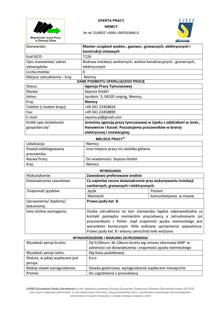 OFERTA PRACY NIEMCY i Nr ref. EURES :10000-1087633956-S Stanowisko: Monter urządzeń wodno-, gazowo-, grzewczych, elektrycznych i konstrukcji stalowych 7126 Budowa instalacji sanitarnych, wodno-kanalizacyjnych , grzewczych, elektrycznych 6 Niemcy Kod ISCO: Opis stanowiska/ zakres obowiązków: Liczba etatów: Miejsce zatrudnienia – kraj: DANE PODMIOTU OFERUJĄCEGO PRACĘ Status: Nazwa: Adres: Kraj: Telefon (z kodem kraju): Fax: E-mail: Krótki opis działalności gospodarczejii: Agencja Pracy Tymczasowej Sepona GmbH Jacobstr. 3, 04105 Leipzig, Niemcy, Niemcy +49 341 22458824 +49 341 22458899 [email protected] Jesteśmy agencją pracy tymczasowej w Lipsku z oddziałami w Jenie , Hanowerze i Kassel. Poszukujemy pracowników w branży elektrycznej i instalacyjnej. MIEJSCE PRACY iii Lokalizacja: Powód oddelegowania pracownika: Nazwa firmy: Kraj: Niemcy Inne miejsce pracy niż siedziba główna Wykształcenie: Doświadczenie zawodowe: Zawodowe preferowane średnie Co najmniej roczne doświadczenie przy wykonywaniu instalacji sanitarnych, grzewczych i elektrycznych. Język Poziom Niemiecki komunikatywny w mowie Prawo jazdy kat. B. Do wiadomości Sepona GmbH Niemcy WYMAGANIA Znajomość języków: Uprawnienia/ dyplomy/ dokumenty Inne istotne wymagania: Osoba zatrudniona na tym stanowisku będzie odpowiedzialna za kontakt pomiędzy niemieckim pracodawcą a zatrudnionymi już pracownikami z Polski- stąd znajomość języka niemieckiego jest warunkiem koniecznym. Mile widziane uprawnienia spawalnicze. Prawo jazdy kat. B i własny samochód mile widziane. WYNAGRODZENIE I WARUNKI ZATRUDNIENIA Wysokość pensji brutto: Wysokość pensji netto: Waluta, w jakiej wypłacana jest pensja: Rodzaj stawki wynagrodzenia: Premie: Od 9,20euro do 10euro brutto wg umowy zbiorowej AMP w zależności od doświadczenia i znajomości języka niemieckiego Wg klasy podatkowej Euro Stawka godzinowa, wynagrodzenie wypłacane miesięcznie Do uzgodnienia z pracodawcą EURES (Europejskie Służby Zatrudnienia) to sieć współpracy pomiędzy Komisją Europejską, Publicznymi Służbami Zatrudnienia krajów UE/ EOG oraz innych organizacji partnerskich, w celu dostarczania informacji, usług pośrednictwa pracy i poradnictwa zawodowego dla pracodawców i pracowników chcących skorzystać z zasady wolnego przepływu osób Dodatkowe świadczenia Nazwa firmy, z którą zostanie podpisana umowa: Rodzaj umowy: Wymiar czasu pracy Czas trwania umowy: Liczba godzin tygodniowo: Zmiany i praca w dni wolne: Data rozpoczęcia: Pracodawca pomaga w znalezieniu zakwaterowania. Dieta na zakwaterowanie 40-50euro netto za każdy przepracowany dzień Sepona GmbH Umowa o pracę Praca na pełen etat Nieokreślony- z okresem próbnym 6 miesięcy 35h tygodniowo- pełny etat 25% dodatku za pracę nadliczbową, 20% dodatku za pracę nocną, 50% dodatku za pracę w niedzielę i w ustawowe dni wolne Jak najszybciej SPOSÓB SKŁADANIA WNIOSKU Wymagane dokumenty Język, w którym muszą być sporządzone przedkładane dokumenty: Do kogo należy wysłać dokumenty: Gdzie należy wysłać dokumenty: CV w języku niemieckim, dokumenty potwierdzające ukończenie kursów lub potwierdzające doświadczenie zawodowe Niemiecki Do pracodawcy W tytule maila proszę uzupełnić stanowisko i numer referencyjny 10000-1087633956-S Drogą elektroniczną do pracodawcy na adres: [email protected] Dane teleadresowe doradcy EURES lub przedstawiciela pracodawcy: Joanna Osetek– [email protected] Tel.: 68 456 77 07 Wojewódzki Urząd Pracy w Zielonej Górze Ul. Wyspiańskiego 15 Zielona Góra WAŻNOŚĆ Data publikacji: 20.02.2013 Termin przedkładania podań o pracę / zakończenia ważności oferty: Do odwołania Agencja Pracy Tymczasowej Sepona GmbH oświadcza, że działa zgodnie z prawem obowiązującym na terenie Niemiec. Uprzejmie informujemy, że skontaktujemy się wyłącznie z wybranymi kandydatami. UWAGA: Umowa z zagranicznym pracodawcą zostanie zawarta zgodnie z prawem kraju zatrudnienia. Oznacza to, że wszystkie roszczenia odnośnie do warunków, które obejmuje umowa, można kierować wyłącznie do odpowiedniego sądu w kraju zatrudnienia. Publiczne służby zatrudnienia (EURES) nie mogą pośredniczyć ani reprezentować pracownika w sądzie kraju zatrudnienia w przypadku sporu z pracodawcą. Publiczne służby zatrudnienia (EURES) dokładają wszelkich starań, aby zapewnić rzetelność i wiarygodność ofert pracy zgłoszonych w lokalnym urzędzie pracy. Należy wyjaśnić, że oferta pracy została zgłoszona przez stronę trzecią i EURES nie odpowiada za ewentualne rozbieżności między warunkami pracy określonymi w ofercie pracy i warunkami oferowanymi przez potencjalnego pracodawcę. Publiczne służby zatrudnienia (EURES) informują, że będą zbierać, przetwarzać i przekazywać potencjalnym pracodawcom zgodnie z przepisami dotyczącymi ochrony danych osobowych wszystkie dane osobowe dostarczone przez osoby poszukujące pracy. i Nr ref. na portalu EURES www.eures.europa.eu . Dotyczy ofert pracy publicznych służb zatrudnienia, których bazy danych ofert pracy nie są połączone z portalem EURES. ii Informacje o firmie, takie jak: status prawny, sektor, typ działalności, rodzaj produktów lub świadczonych usług, data rozpoczęcia działalności gospodarczej, liczba pracowników itp. iii Miejsce, w którym będzie wykonywana praca. Należy wypełnić w przypadku gdy: miejsce wykonywania pracy jest inne niż siedziba podmiotu oferującego pracę, 1) pracę oferuje agencja pośrednictwa pracy/ agencja pracy tymczasowej. EURES (Europejskie Służby Zatrudnienia) to sieć współpracy pomiędzy Komisją Europejską, Publicznymi Służbami Zatrudnienia krajów UE/ EOG oraz innych organizacji partnerskich, w celu dostarczania informacji, usług pośrednictwa pracy i poradnictwa zawodowego dla pracodawców i pracowników chcących skorzystać z zasady wolnego przepływu osób