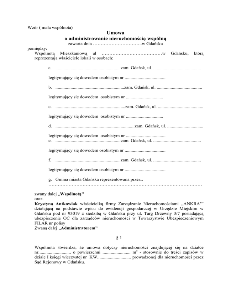 Wzór ( mała wspólnota) Umowa o administrowanie nieruchomością wspólną zawarta dnia …………………………..w Gdańsku pomiędzy: Wspólnotą Mieszkaniową ul …………………………………w reprezentują właściciele lokali w osobach: Gdańsku, którą a. ........................................................zam. Gdańsk, ul. ......................................... legitymujący się dowodem osobistym nr ................................... b. ...........................................................zam. Gdańsk, ul. ....................................... legitymujący się dowodem osobistym nr ................................ c. ............................................................zam. Gdańsk, ul. ....................................... legitymujący się dowodem osobistym nr ................................ d. ....................................................................zam. Gdańsk, ul. ............................... legitymujący się dowodem osobistym nr .................................. e. ........................................................zam. Gdańsk, ul. ......................................... legitymujący się dowodem osobistym nr ................................... f. ........................................................zam. Gdańsk, ul. ......................................... legitymujący się dowodem osobistym nr ................................... g. Gmina miasta Gdańska reprezentowana przez.: ……………………………………………………………………………………… zwany dalej „Wspólnotą" oraz. Krystyną Antkowiak właścicielką firmy Zarządzanie Nieruchomościami „ANKRA’” działającą na podstawie wpisu do ewidencji gospodarczej w Urzędzie Miejskim w Gdańsku pod nr 93019 z siedzibą w Gdańsku przy ul. Targ Drzewny 3/7 posiadającą ubezpieczenie OC dla zarządców nieruchomości w Towarzystwie Ubezpieczeniowym FILAR nr polisy Zwaną dalej „Administratorem” §1 Wspólnota stwierdza, że umowa dotyczy nieruchomości znajdującej się na działce nr............................ o powierzchni ........................ m2 - stosownie do treści zapisów w dziale I księgi wieczystej nr KW............................. prowadzonej dla nieruchomości przez Sąd Rejonowy w Gdańsku. §2. Wspólnota powierza, a Administrator przyjmuje obowiązki wykonywania w imieniu Wspólnoty i na jej rachunek czynności zwykłego zarządu nieruchomością wspólną . §3. Czynności administrowania nieruchomością wspólną obejmują: 1. reprezentowanie Wspólnoty na zewnątrz w sprawach administracyjnych przed organami państwowymi samorządowymi, urzędami i instytucjami, weryfikowanie stanu prawnego i faktycznego nieruchomości, prowadzenie wykazu lokali wyodrębnionych 2. prowadzenie księgi obiektu budowlanego oraz dokumentacji technicznej nieruchomości wspólnej wymaganej przez przepisy prawa budowlanego, 3. zlecanie kontroli technicznych i okresowych przeglądów nieruchomości wraz z urządzeniami stanowiącymi jej wyposażenie techniczne zgodnie z wymogami prawa budowlanego 4. utrzymanie w należytym porządku i czystości pomieszczeń i urządzeń budynku służących do wspólnego użytku właścicieli lokali (w tym dźwigów osobowych), terenu nieruchomości określonego w § l umowy, chodnika przed nieruchomością i innych terenów, jeżeli obowiązek taki wynika z zawartych umów bądź z postanowień ustaw; do obowiązków Administratora należy zawieranie umów związanych z realizacją tego zadania poprzez angażowanie dozorcy lub wybór innej formy działania, 5. zapewnienie dla nieruchomości wspólnej dostaw energii elektrycznej, energii cieplnej ciepłej i zimnej wody, odbioru ścieków wywozu nieczystości bytowych i nietypowych. 6. zapewnienie usług konserwacyjno- remontowych budynku, usług konserwacji dźwigów, domofonów , pogotowia lokatorskiego 7. zapewnienie bieżącej konserwacji i bieżących napraw nieruchomości wspólnej, a w szczególności dokonywanie napraw budynku i jego pomieszczeń wspólnych oraz urządzeń technicznych umożliwiających właścicielom lokali korzystanie z oświetlenia, ogrzewania lokalu, ciepłej i zimnej wody, gazu, dźwigów osobowych, i innych urządzeń należących do wyposażenia nieruchomości wspólnej, 8. ubezpieczenie budynku od O.C. oraz zdarzeń losowych, opłacanie podatków i innych opłat publiczno- prawnych przypadających od nieruchomości wspólnej chyba, że są pokrywane bezpośrednio przez właścicieli poszczególnych lokali 9. zawieranie umów na podstawie uchwały wspólnoty, w uzgodnieniu z pełnomocnikiem wspólnoty o roboty bądź usługi związane z realizacją zadań wynikających z umowy, kontrola prawidłowości wykonania tych umów oraz ich rozwiązywanie w przypadkach uzasadnionych 10. rozliczanie z właścicielami opłat z tytułu kosztów zarządu nieruchomością wspólną zgodnie z art. 14 ustawy o własności lokali 11. pobieranie należności z tytułu pożytków i innych przychodów z nieruchomości wspólnej 12. potwierdzanie uprawnień w sprawach meldunkowych w zakresie określonym ustawą o ewidencji – dla właścicieli lokali ( z wyłączeniem gminy) 13. wydawanie poświadczeń bądź zaświadczeń (w stosunku do właścicieli dotyczących między innymi uprawnień do dodatków mieszkaniowych, pomocy społecznej itp.) 14. prowadzenie księgowości na zasadach ewidencji przychodów i kosztów, zgodnie z Rozporządzeniem Ministra Finansów z dnia 28 sierpnia 2000r. 15. dokonywanie rozliczeń poprzez rachunek bankowy, w tym odrębny dla funduszu remontowego 16. sporządzanie rocznego sprawozdania finansowego i dostarczenie go pełnomocnikowi Wspólnoty najpóźniej na 7 dni przed rocznym zebraniem. 17. zwoływanie zebrań Wspólnoty w uzgodnieniu z pełnomocnikiem wspólnoty raz w roku po zakończeniu roku obrachunkowego, nie później niż. do 31 marca roku następnego (w celu przedł