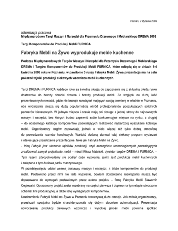 Poznań, 2 stycznia 2008 Informacja prasowa Międzynarodowe Targi Maszyn i Narzędzi dla Przemysłu Drzewnego i Meblarskiego DREMA 2008 Targi Komponentów do Produkcji Mebli FURNICA Fabryka Mebli na Żywo wyprodukuje meble kuchenne Podczas Międzynarodowych Targów Maszyn i Narzędzi dla Przemysłu Drzewnego i Meblarskiego DREMA i Targów Komponentów do Produkcji Mebli FURNICA, które odbędą się w dniach 1-4 kwietnia 2008 roku w Poznaniu, w pawilonie 3 ruszy Fabryka Mebli. Żywa prezentacja ma na celu pokazać tajniki produkcji ciekawych wzorniczo mebli kuchennych. Targi DREMA i FURNICA każdego roku są świetną okazją do zapoznania się z aktualną ofertą rynku dostawców do branży obróbki drewna i branży produkcji mebli. Ze względu na dużą ilość prezentowanych nowości, gdzie nie brakuje rozwiązań mających swoją premierę w właśnie w Poznaniu, oba wydarzenia cieszą się dużą popularnością wśród profesjonalistów poszukujących solidnych partnerów biznesowych. W jednym miejscu i czasie mają oni dostęp: z jednej strony do najnowszych maszyn i narzędzi, bez których trudno zapewnić sobie konkurencyjne miejsce na rynku, z drugiej – do obszernego katalogu komponentów pozwalających realizować najbardziej wyszukane kolekcje mebli. Organizatorzy targów zapewniają jednak o wiele więcej niż tylko dobrą atmosferę do prowadzenia rozmów handlowych. Wartość dodaną stanowi tutaj ciekawy program wydarzeń i interesujące przestrzenie prezentacyjne, takie jak Fabryka Mebli na Żywo. - Ideą Fabryki jest ukazanie tajników produkcji, czyli szczegółów technologicznych pozwalających zrealizować zamysł projektanta mebli – mówi Miłosz Matelski, dyrektor targów DREMA i FURNICA. – Tym razem zdecydowaliśmy się podjąć duże wyzwanie, jakim jest produkcja mebli kuchennych i związana z tym budowa parku maszynowego. W przedsięwzięciu udział wezmą dostawcy maszyn i narzędzi, a także komponentów do produkcji mebli. Postawiono przed nimi nie lada wyzwanie, bowiem dostarczone rozwiązania muszą być dopasowane do wymagań postawionych przez autora projektu – firmę Fabryka Mebli Sławomir Ceglewski. Opracowany projekt został rozebrany na części pierwsze i dopiero na tym etapie stworzono schemat linii produkcyjnej, a także listę wymaganych komponentów. Uruchomieniu Fabryki Mebli na Żywo w Poznaniu towarzyszą duże emocje. Jak mówią organizatorzy, przestrzeń specjalna będzie charakteryzowała się dużym stopniem automatyzacji. Prezentacja nowoczesnej produkcji ciekawych wzorniczo i wysokiej jakości mebli powinna spotkać się z dużym zainteresowaniem zakładów meblarskich poszukujących recepty na wyższą efektywność. Zastosowanie w produkowanych meblach kuchennych najnowszych komponentów pozwoli profesjonalistom zainspirować się i dokonać konfrontacji wzornictwa z funkcjonalnością. Źródło: Międzynarodowe Targi Poznańskie Międzynarodowe Targi Poznańskie sp. z o.o. Jacek Obarski koordynator ds. innowacji w zespole promocji tel. 061 869 21 69 e-mail: [email protected] Zdjęcia: Piotr Piosik Organizator: Międzynarodowe Targi Poznańskie Partner merytoryczny: Fabryka Mebli Ceglewski Meble Ceglewski Sp. z o.o. Robert Królikowski prezes tel. 063 274 37 03 e-mail: [email protected]