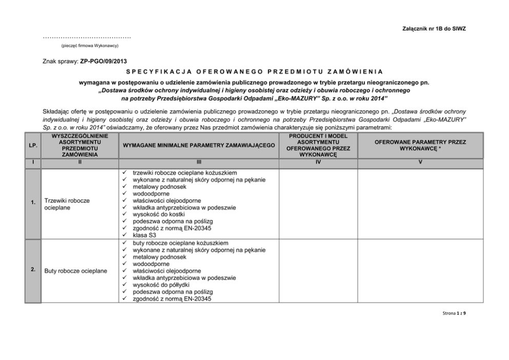 Załącznik nr 1B do SIWZ …………………………………. (pieczęć firmowa Wykonawcy) Znak sprawy: ZP-PGO/09/2013 SPECYFIKACJA OFEROWANEGO PRZEDMIOTU ZAMÓWIENIA wymagana w postępowaniu o udzielenie zamówienia publicznego prowadzonego w trybie przetargu nieograniczonego pn. „Dostawa środków ochrony indywidualnej i higieny osobistej oraz odzieży i obuwia roboczego i ochronnego na potrzeby Przedsiębiorstwa Gospodarki Odpadami „Eko-MAZURY” Sp. z o.o. w roku 2014” Składając ofertę w postępowaniu o udzielenie zamówienia publicznego prowadzonego w trybie przetargu nieograniczonego pn. „Dostawa środków ochrony indywidualnej i higieny osobistej oraz odzieży i obuwia roboczego i ochronnego na potrzeby Przedsiębiorstwa Gospodarki Odpadami „Eko-MAZURY” Sp. z o.o. w roku 2014” oświadczamy, że oferowany przez Nas przedmiot zamówienia charakteryzuje się poniższymi parametrami: LP. I WYSZCZEGÓLNIENIE ASORTYMENTU PRZEDMIOTU ZAMÓWIENIA II 1. Trzewiki robocze ocieplane 2. Buty robocze ocieplane WYMAGANE MINIMALNE PARAMETRY ZAMAWIAJĄCEGO III PRODUCENT I MODEL ASORTYMENTU OFEROWANEGO PRZEZ WYKONAWCĘ IV OFEROWANE PARAMETRY PRZEZ WYKONAWCĘ * V trzewiki robocze ocieplane kożuszkiem wykonane z naturalnej skóry odpornej na pękanie metalowy podnosek wodoodporne właściwości olejoodporne wkładka antyprzebiciowa w podeszwie wysokość do kostki podeszwa odporna na poślizg zgodność z normą EN-20345 klasa S3 buty robocze ocieplane kożuszkiem wykonane z naturalnej skóry odpornej na pękanie metalowy podnosek wodoodporne właściwości olejoodporne wkładka antyprzebiciowa w podeszwie wysokość do półłydki podeszwa odporna na poślizg zgodność z normą EN-20345 Strona 1 z 9 3. Półbuty robocze 4. Trzewiki robocze klasa S3 półbuty ochronne podeszwa PU/PTU wykonane z naturalnej skóry odpornej na pękanie cholewki ze skór licowych gładkich o wysokim współczynniku przepuszczalności pary wodnej i zmniejszonej nasiąkliwości wody kołnierz z wysokiej jakości skóry licowej podszewka z materiału skutecznie odprowadzającego pot właściwości przeciwpoślizgowe giętkie i elastyczne w niskich temperaturach cholewka wyposażona w elementy odblaskowe podeszwa z podwójnie wtryskiwanego poliuretanu perforowany podnosek kompozytowy antyprzebiciowa podeszwa z elastycznego, nie zawierającego metalu, materiału właściwości olejoodporne i antyelektrostatyczne wyściółka z filtrem aktywnego węgla o właściwościach przeciwpotnych i przeciwgrzybicznych wkładka antyprzebiciowa w podeszwie zgodność z normą EN-20345 klasa S3 trzewiki robocze podeszwa PU/PTU wykonane z naturalnej skóry odpornej na pękanie cholewki ze skór licowych gładkich o wysokim współczynniku przepuszczalności pary wodnej i zmniejszonej nasiąkliwości wody kołnierz z wysokiej jakości skóry licowej podszewka z materiału skutecznie odprowadzającego pot właściwości przeciwpoślizgowe giętkie i elastyczne w niskich temperaturach cholewka wyposażona w elementy odblaskowe podeszwa z podwójnie wtryskiwanego poliuretanu perforowany podnosek kompozytowy antyprzebiciowa podeszwa z elastycznego, nie zawierającego metalu materiału Strona 2 z 9 5. Buty gumowe robocze z podnoskiem 6. Buty gumowe 7. Buty gumowe robocze 8. Buty gumowe PCV 9. Buty gumowe ocieplane właściwości olejoodporne i antyelektrostatyczne wyściółka z filtrem aktywnego węgla o właściwościach przeciwpotnych i przeciwgrzybicznych wkładka antyprzebiciowa w podeszwie zgodność z normą EN-20345 klasa S3 buty gumowe robocze z podnoskiem wykonane z mieszanki nitrylu z PCV stalowy podnosek wytrzymały na uderzenia wkładka odporna na przekłucia antypoślizgowa i antyelektrostatyczna podeszwa buty gumowe wykonane z gumy wysokość nie mniejsza niż 35 cm antypoślizgowa podeszwa buty gumowe robocze wykonane z materiału EVA lub równoważnego wysokość nie mniejsza niż 30 cm podszewka - wymienny wkład buty gumowe wykonane z modyfikowanego PCV ocieplane filcem wysokość nie mniejsza niż 30 cm spody antypoślizgowe protektor buty gumowe ocieplane wykonane z mieszanki nitrylu i PCV stalowy podnosek wytrzymały na uderzenia z energią nie mniejszą niż 200 J i zgniecenia nie mniejszą niż 15 kN wkładka odporna na przekłucia o nacisku nie mniejszym niż 1100N absorpcja uderzeń pod piętą podeszwa z urzeźbieniem chroniącym przed poślizgiem zwiększona odporność na oleje, smary, a także uszkodzenia mechaniczne od wewnątrz wyściełane kożuchem góra buta wykończona dodatkowym ściągaczem ze sznurówką Strona 3 z 9 10. Czapka bawełniana typu baseball 11. Czapka ochronna antyskalpowa 12. Czapka zimowa 13. Fartuch ochronny typu kasak 14. Fartuch drelichowy 15. Fartuch przedni wodoodporny klasa S5 czapka bawełniana typu baseball regulacja tylnej części przód czapki i daszek usztywniany otwory wentylacyjne na górnej części czapka ochronna antyskalpowa w środku wkładka z HDPE wykładzina z pianki PE otwory we wkładce ochronnej wstawki boczne z siateczki zapewniającej dobrą wentylację napotnik z tkaniny frote możliwość wyjęcia wkładki ochronnej pasek regulacyjny z tyłu wszyty pasek odblaskowy zgodność z normą: EN812:1997 – A1:2001 czapka zimowa dziana ocieplana kolor czarny warstwa zewnętrzna: 100% polar poliester nie 2 cieńszy niż 260 g/m 2 wypełnienie: 100% poliester nie cieńszy niż 40 g/m podszewka: 100% polar poliester nie cieńszy niż 100 g/m² fartuch ochronny typu kasak elanobawełna odporny na ścieranie i rozdarcie kieszeń (kieszenie) z przodu lamowany zawiązywany z boków fartuch drelichowy zapinany na guziki z długimi rękawami wykonany z drelichu (100% bawełna) o gramaturze 2 nie mniejszej niż 240 g/ m fartuch ochronny przedni wodoodporny podgumowany długi zakładany na szyję z wiązaniami za pasku z tyłu Strona 4 z 9 16. Gogle ochronne 17. Kamizelka odblaskowa 18. Kombinezon ochronny 100% PCV wymiar nie mniejszy niż 75 * 110 cm gogle o