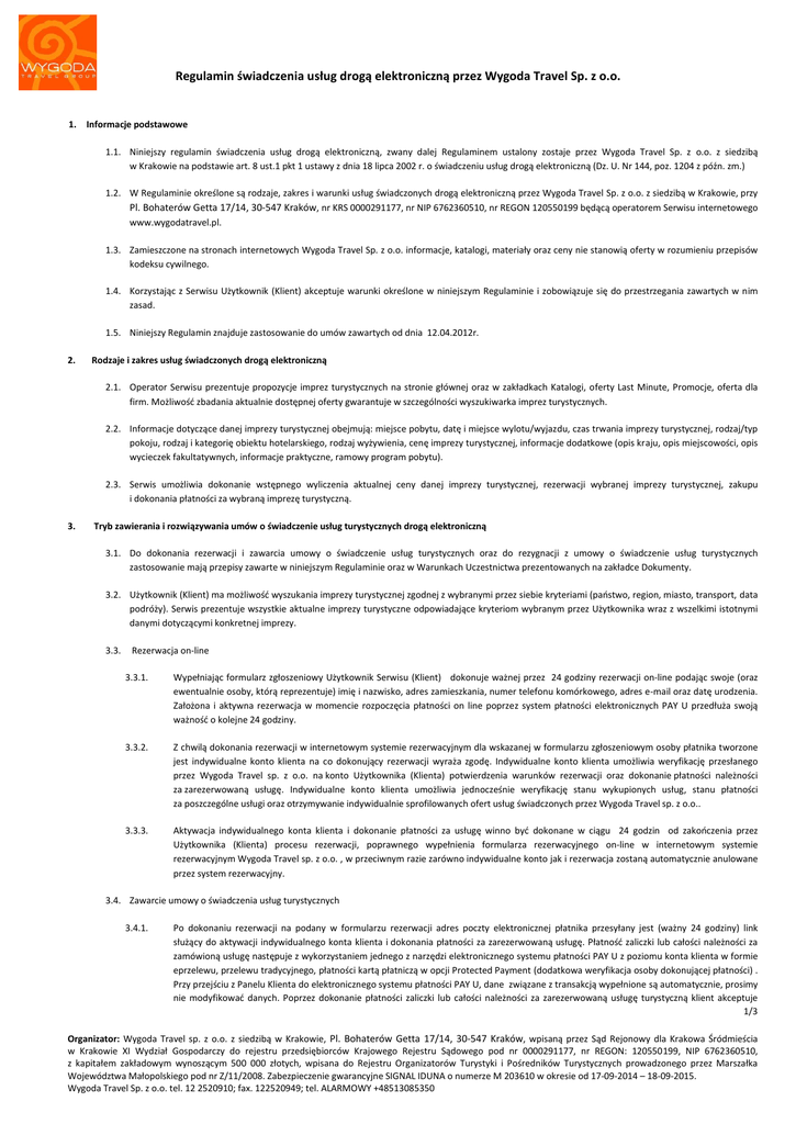 Regulamin świadczenia usług drogą elektroniczną przez Wygoda Travel Sp. z o.o. 1. Informacje podstawowe 1.1. Niniejszy regulamin świadczenia usług drogą elektroniczną, zwany dalej Regulaminem ustalony zostaje przez Wygoda Travel Sp. z o.o. z siedzibą w Krakowie na podstawie art. 8 ust.1 pkt 1 ustawy z dnia 18 lipca 2002 r. o świadczeniu usług drogą elektroniczną (Dz. U. Nr 144, poz. 1204 z późn. zm.) 1.2. W Regulaminie określone są rodzaje, zakres i warunki usług świadczonych drogą elektroniczną przez Wygoda Travel Sp. z o.o. z siedzibą w Krakowie, przy Pl. Bohaterów Getta 17/14, 30-547 Kraków, nr KRS 0000291177, nr NIP 6762360510, nr REGON 120550199 będącą operatorem Serwisu internetowego www.wygodatravel.pl. 1.3. Zamieszczone na stronach internetowych Wygoda Travel Sp. z o.o. informacje, katalogi, materiały oraz ceny nie stanowią oferty w rozumieniu przepisów kodeksu cywilnego. 1.4. Korzystając z Serwisu Użytkownik (Klient) akceptuje warunki określone w niniejszym Regulaminie i zobowiązuje się do przestrzegania zawartych w nim zasad. 1.5. Niniejszy Regulamin znajduje zastosowanie do umów zawartych od dnia 12.04.2012r. 2. Rodzaje i zakres usług świadczonych drogą elektroniczną 2.1. Operator Serwisu prezentuje propozycje imprez turystycznych na stronie głównej oraz w zakładkach Katalogi, oferty Last Minute, Promocje, oferta dla firm. Możliwość zbadania aktualnie dostępnej oferty gwarantuje w szczególności wyszukiwarka imprez turystycznych. 2.2. Informacje dotyczące danej imprezy turystycznej obejmują: miejsce pobytu, datę i miejsce wylotu/wyjazdu, czas trwania imprezy turystycznej, rodzaj/typ pokoju, rodzaj i kategorię obiektu hotelarskiego, rodzaj wyżywienia, cenę imprezy turystycznej, informacje dodatkowe (opis kraju, opis miejscowości, opis wycieczek fakultatywnych, informacje praktyczne, ramowy program pobytu). 2.3. Serwis umożliwia dokonanie wstępnego wyliczenia aktualnej ceny danej imprezy turystycznej, rezerwacji wybranej imprezy turystycznej, zakupu i dokonania płatności za wybraną imprezę turystyczną. 3. Tryb zawierania i rozwiązywania umów o świadczenie usług turystycznych drogą elektroniczną 3.1. Do dokonania rezerwacji i zawarcia umowy o świadczenie usług turystycznych oraz do rezygnacji z umowy o świadczenie usług turystycznych zastosowanie mają przepisy zawarte w niniejszym Regulaminie oraz w Warunkach Uczestnictwa prezentowanych na zakładce Dokumenty. 3.2. Użytkownik (Klient) ma możliwość wyszukania imprezy turystycznej zgodnej z wybranymi przez siebie kryteriami (państwo, region, miasto, transport, data podróży). Serwis prezentuje wszystkie aktualne imprezy turystyczne odpowiadające kryteriom wybranym przez Użytkownika wraz z wszelkimi istotnymi danymi dotyczącymi konkretnej imprezy. 3.3. Rezerwacja on-line 3.3.1. Wypełniając formularz zgłoszeniowy Użytkownik Serwisu (Klient) dokonuje ważnej przez 24 godziny rezerwacji on-line podając swoje (oraz ewentualnie osoby, którą reprezentuje) imię i nazwisko, adres zamieszkania, numer telefonu komórkowego, adres e-mail oraz datę urodzenia. Założona i aktywna rezerwacja w momencie rozpoczęcia płatności on line poprzez system płatności elektronicznych PAY U przedłuża swoją ważność o kolejne 24 godziny. 3.3.2. Z chwilą dokonania rezerwacji w internetowym systemie rezerwacyjnym dla wskazanej w formularzu zgłoszeniowym osoby płatnika tworzone jest indywidualne konto klienta na co dokonujący rezerwacji wyraża zgodę. Indywidualne konto klienta umożliwia weryfikację przesłanego przez Wygoda Travel sp. z o.o. na konto Użytkownika (Klienta) potwierdzenia warunków rezerwacji oraz dokonanie płatności należności za zarezerwowaną usługę. Indywidualne konto klienta umożliwia jednocześnie weryfikację stanu wykupionych usług, stanu płatności za poszczególne usługi oraz otrzymywanie indywidualnie sprofilowanych ofert usług świadczonych przez Wygoda Travel sp. z o.o.. 3.3.3. Aktywacja indywidualnego konta klienta i dokonanie płatności za usługę winno być dokonane w ciągu 24 godzin od zakończenia przez Użytkownika (Klienta) procesu rezerwacji, poprawnego wypełnienia formularza rezerwacyjnego on-line w internetowym systemie rezerwacyjnym Wygoda Travel sp. z o.o. , w przeciwnym razie zarówno indywidualne konto jak i rezerwacja zostaną automatycznie anulowane przez system rezerwacyjny. 3.4. Zawarcie umowy o świadczenia usług turystycznych 3.4.1. Po dokonaniu rezerwacji na podany w formularzu rezerwacji adres poczty elektronicznej płatnika przesyłany jest (ważny 24 godziny) link służący do aktywacji indywidualnego konta klienta i dokonania płatności za zarezerwowaną usługę. Płatność zaliczki lub całości należności za zamówioną usługę następuje z wykorzystaniem jednego z narzędzi elektronicznego systemu płatności PAY U z poziomu konta klienta w formie eprzelewu, przelewu tradycyjnego, płatności kartą płatniczą w opcji Protected Payment (dodatkowa weryfikacja osoby dokonującej płatności) . Przy przejściu z Panelu Klienta do elektronicznego systemu płatności PAY U, dane związane z transakcją wypełnione są automatycznie, prosimy nie modyfikować danych. Poprzez dokonanie płatności zaliczki lub całości należności za zarezerwowaną usługę turystyczną klient akceptuje 1/3 Organizator: Wygoda Travel sp. z o.o. z siedzibą w Krakowie, Pl. Bohaterów Getta 17/14, 30-547 Kraków, wpisaną przez Sąd Rejonowy dla Krakowa Śródmieścia w Krakowie XI Wydział Gospodarczy do rejestru przedsiębiorców Krajowego Rejestru Sądowego pod nr 0000291177, nr REGON: 120550199, NIP 6762360510, z kapitałem zakładowym wynoszącym 500 000 złotych, wpisana do Rejestru Organizatorów Turystyki i Pośredników Turystycznych prowadzonego przez Marszałka Województwa Małopolskiego pod nr Z/11/2008. Zabezpieczenie gwarancyjne SIGNAL IDUNA o numerze M 203610 w okresie od 17-09-2014 