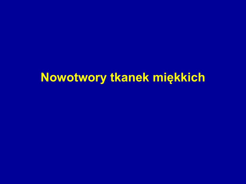 Nowotwory tkanek miękkich Tkanki miękkie - tkanki nienabłonkowe inne niż kośd, chrząstka, mózg i opony, układ krwiotwórczy i limfatyczny Nowotwory tkanek miękkich są klasyfikowane na podstawie tkanki, z której pochodzą. nowotwory mezenchymalne łagodne i złośliwe Guzy tkanek miękkich Epidemiologia Mięsaki tkanek miękkich stanowią około: • 1% wszystkich nowotworów złośliwych u dorosłych • 7% wszystkich nowotworów złośliwych u pacjentów 15 r.ż. • występują jednakowo często u obu płci Guzy tkanek miękkich 1. ok. połowa mięsaków tkanek miękkich rozwija się w obrębie kończyn 2. u 80 - 100% pacjentów po prostym wycięciu guza rozwija się wznowa miejscowa 3. wznowie miejscowej towarzyszy rozsiew nowotworu (najczęściej) 4. istotne znaczenie ma stopień złośliwości histologicznej Guzy tkanek miękkich założenia diagnostyczne: lokalizacja zmiany zlokalizowane głęboko częściej są złośliwe powierzchowne – częściej łagodne rozmiar większe - złośliwsze typ wzrostu szybko rosnące – złośliwe przerzutujące złośliwe Guzy tkanek miękkich Podstawy diagnostyki HE IHC cytogenetyka badania molekularne ultrastruktura Guzy tkanek miękkich IHC cytokeratin vimentin smooth muscle actin desmin S-100 CD 31 CD 34 Guzy tkanek miękkich Charakterystyczne zmiany cytogenetyczne t(2;13) Alveolar rhabdomyosarcoma t(11;22) Ewing’s sarcoma/PNET t(11;22) Desmoplastic small round cell tumor t(12;16) Myxoid liposarcoma t(9;22) Myxoid chondrosarcoma t(12;22) Clear cell sarcoma t(X;18) Synovial sarcoma Leiomyoma nowotwór łagodny występuje w tkance podskórnej lub w ścianie naczyń zwykle bolesny pęczki równolegle ułożonych komórek mięśni gładkich Leiomyoma Leiomyosarcoma złośliwy skóra, tk. podskórna, kończyny „głębokie” szerzą się wzdłuż naczyń martwica, wylewy krwawe pęczki, nasilona atypia wysoka aktywność mitotyczna Komórki: dziwaczne, wielojądrowe olbrzymie Leiomyosarcoma Rhabdomyosarcoma nowotwór złośliwy o różnicowaniu mięśni poprzecznie prążkowanych u dzieci i młodych dorosłych kilka warianów - Embryonal (zarodkowy) - Alveolar (pęcherzykowy) - Botryoid (groniasty) - Pleomorphic (wielopostaciowy) Najczęstszy mięsak u dzieci do 15 roku życia !!! Klinika: • guz głowy/karku – objawy z nerwów czaszkowych • w układzie moczowo-płciowym: dysuria, hematuria lub nietrzymanie moczu • na kończynach: bolesny, rosnący szybko guz Rokowanie/leczenia • przed 1960 ⇒ 100% zgonów (5-letnich) • obecnie: chirurgia + chemio- + RTG ⇒ 5-letnie przeżycia: botryoid embryonal RMS → 95% classic embryonal RMS → 66% alveolar RMS → 54% • w 20% przerzuty: płuca, kości węzły chłonne Embryonal Rhabdomyosarcoma najczęstszy u dzieci w lokalizacji , na głowie / szyi • najczęstszy wariant rabdomyoblasty z prążkowaniem chaotyczne układy zróżnicowane utkanie Embryonal rhabdomyosarcoma Embryonal rhabdomyosarcoma - desmina Botryoid Rhabdomyosarcoma najczęstszy w lokalizacji narządowej np. układ moczowo-płciowy polipowate, groniaste masy nowotworu rozproszone komórki atypowe w śluzowatym podścielisku Botryoid rhabdomyosarcoma Botryoid rhabdomyosarcoma Botryoid rhabdomyosarcoma Alveolar Rhabdomyosarcoma na kończynach przegrody z luźnymi skupiskami okrągłych komórek w centrum - wariant pęcherzykowy Alveolar rhabdomyosarcoma Pleomorphic Rhabdomyosarcoma w mięśniach u osób starszych znaczny pleomorfizm nieregularnie ułożone komórki wielojądrowe olbrzymie komórki Pleomorphic Sarcoma Lipoma łagodny, dobrze ograniczony guz z wysoko zróżnicowanych adipocytów u dorosłych, plecy, kark, ramiona zazwyczaj podskórnie, najczęstszy guz łagodny tkanek miękkich przypomina normalną tkankę tłuszczową podtypy: angiolipoma, spindle cell lipoma TŁUSZCZAK (LIPOMA) c.d. Makroskopowo: • • miękki, żółty guz czasem otoczony cienką torebką na przekrojach o wyglądzie podskórnego tłuszczu LIPOMA Mikroskopowo: • utkanie guza zbudowane z dojrzałych adipocytów • adipocyty mogą różnid się nieznacznie między sobą pod względem kształtu i wielkości Odmiany histologiczne tłuszczaków: fibrolipoma, angiolipoma, myolipoma, angiomyolipoma (nerka, ostry brzuch) Lipoma Lipoma Angiolipoma Lipoma - wrzecionowatokomórkowy Zimowiak TŁUSZCZAKOMIĘSAK (LIPOSARCOMA) - głównie u osób dorosłych - raczej w głębokich tkankach miękkich i trzewiach; najczęściej w przestrzeni zaotrzewnowej, pośladkach, proksymalnych odcinkach kooczyn - rokowanie zależy od typu histologicznego Typy histologiczne tłuszczakomięsaków: 1. 2. 3. 4. 5. TŁUSZCZAKOMIĘSAK WYSOKO DOJRZAŁY, DOBRZE ZRÓŻNICOWANY TŁUSZCZAKOMIĘSAK ŚLUZOWATY - najczęstszy z nich !!! TŁUSZCZAKOMIĘSAK OKRĄGŁOKOMÓRKOWY TŁUSZCZAKOMIĘSAK POLIMORFICZNY TŁUSZCZAKOMIĘSAK ODRÓŻNICOWANY TŁUSZCZAKOMIĘSAK (LIPOSARCOMA) - morfologia: - guzy średnicy od 5 - 10 cm - wyraźnie odgraniczone od otoczenia, otorebkowane - dośd często obecne ogniska satelitarne - żółte, białaoszare, słoninowate - galaretowate, lśniące TŁUSZCZAKOMIĘSAK (LIPOSARCOMA) - morfologia: TŁUSZCZAKOMIĘSAK (LIPOSARCOMA) - morfologia: TŁUSZCZAKOMIĘSAK DOBRZE ZRÓŻNICOWANY adipocyty + lipoblasty TŁUSZCZAKOMIĘSAK ŚLUZOWATY (LIPOSARCOMA MYXOIDES) lipoblasty w różnych stadiach zróżnicowania śluzowate podścielisko WŁÓKNIAK (FIBROMA) - niezłośliwy nowotwór tkanki łącznej włóknistej - może się rozwinąd w każdej lokalizacji, rzadko w głębi tkanek miękkich włókniaki pochewek ścięgnistych -dłoo, palce, nadgarstek - jako twarde guzki, średnicy 1 – 2cm włókniaki z włókien elastycznych bliznowiec WŁÓKNIAKOMIĘSAK (FIBROSARCOMA) guz złośliwy wywodzący się z fibroblastów może pojawid się w każdym wieku, najczęściej u osób dorosłych M =K * włókniakomięsak wieku dziecięcego -zwykle u noworodków (lepsze rokowanie niż u dorosłych) najczęstsza lokalizacja -tułów, pośladek, udo daje wznow