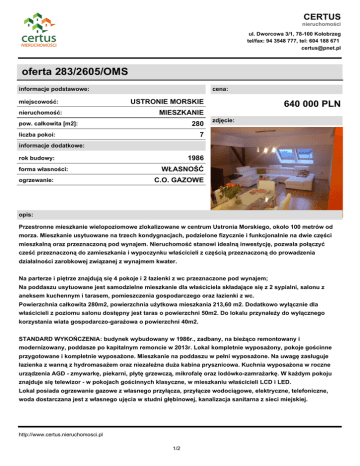 CERTUS nieruchomości ul. Dworcowa 3/1, 78-100 Kołobrzeg tel/fax: 94 3548 777, tel: 604 188 671 [email protected] oferta 283/2605/OMS informacje podstawowe: miejscowość: nieruchomość: cena: USTRONIE MORSKIE 640 000 PLN MIESZKANIE 280 pow. całkowita [m2]: zdjęcie: 7 liczba pokoi: informacje dodatkowe: 1986 rok budowy: forma własności: ogrzewanie: WŁASNOŚĆ C.O. GAZOWE opis: Przestronne mieszkanie wielopoziomowe zlokalizowane w centrum Ustronia Morskiego, około 100 metrów od morza. Mieszkanie usytuowane na trzech kondygnacjach, podzielone fizycznie i funkcjonalnie na dwie części mieszkalną oraz przeznaczoną pod wynajem. Nieruchomość stanowi idealną inwestycję, pozwala połączyć cześć przeznaczoną do zamieszkania i wypoczynku właścicieli z częścią przeznaczoną do prowadzenia działalności zarobkowej związanej z wynajmem kwater. Na parterze i piętrze znajdują się 4 pokoje i 2 łazienki z wc przeznaczone pod wynajem; Na poddaszu usytuowane jest samodzielne mieszkanie dla właściciela składające się z 2 sypialni, salonu z aneksem kuchennym i tarasem, pomieszczenia gospodarczego oraz łazienki z wc. Powierzchnia całkowita 280m2, powierzchnia użytkowa mieszkania 213,60 m2. Dodatkowo wyłącznie dla właścicieli z poziomu salonu dostępny jest taras o powierzchni 50m2. Do lokalu przynależy do wyłącznego korzystania wiata gospodarczo-garażowa o powierzchni 40m2. STANDARD WYKOŃCZENIA: budynek wybudowany w 1986r., zadbany, na bieżąco remontowany i modernizowany, poddasze po kapitalnym remoncie w 2013r. Lokal kompletnie wyposażony, pokoje gościnne przygotowane i kompletnie wyposażone. Mieszkanie na poddaszu w pełni wyposażone. Na uwagę zasługuje łazienka z wanną z hydromasażem oraz niezależna duża kabina prysznicowa. Kuchnia wyposażona w roczne urządzenia AGD - zmywarkę, piekarni, płytę grzewczą, mikrofalę oraz lodówko-zamrażarkę. W każdym pokoju znajduje się telewizor - w pokojach gościnnych klasyczne, w mieszkaniu właścicieli LCD i LED. Lokal posiada ogrzewanie gazowe z własnego przyłącza, przyłącze wodociągowe, elektryczne, telefoniczne, woda dostarczana jest z własnego ujęcia w studni głębinowej, kanalizacja sanitarna z sieci miejskiej. http://www.certus.nieruchomosci.pl 1/2 CERTUS nieruchomości ul. Dworcowa 3/1, 78-100 Kołobrzeg tel/fax: 94 3548 777, tel: 604 188 671 [email protected] Mieszkanie bezczynszowe, indywidualne umowy z dostawcami mediów. Termin wydania nieruchomości do uzgodnienia. W celu uzyskania szczegółowych informacji o ofercie prosimy o kontakt telefoniczny, bądź mailowy http://www.certus.nieruchomosci.pl 2/2