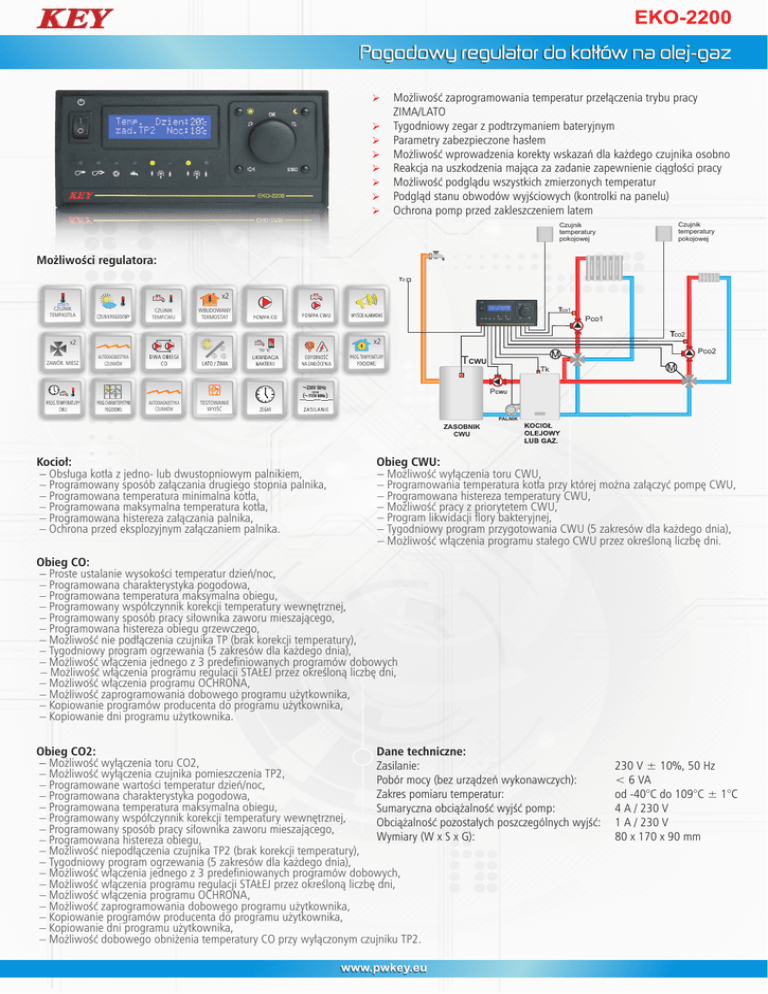EKO-2200 Mo¿liwoœæ zaprogramowania temperatur prze³¹czenia trybu pracy O ZIMA/LATO Tygodniowy zegar z podtrzymaniem bateryjnym O Parametry zabezpieczone has³em O Mo¿liwoœæ wprowadzenia korekty wskazañ dla ka¿dego czujnika osobno O Reakcja na uszkodzenia maj¹ca za zadanie zapewnienie ci¹g³oœci pracy O Mo¿liwoœæ podgl¹du wszystkich zmierzonych temperatur O Podgl¹d stanu obwodów wyjœciowych (kontrolki na panelu) O Ochrona pomp przed zakleszczeniem latem O Czujnik temperatury pokojowej Czujnik temperatury pokojowej Mo¿liwoœci regulatora: Tz x2 CZUJNIK TEMP.KOT£A CZUJNIK TEMP.CWU Tco1 WBUDOWANY TERMOSTAT Pco1 Tco2 x2 x2 ZAWÓR. MIESZ Pco2 AUTODIAGNOSTYKA CZUJNIKÓW TCWU Tk PCWU AUTODIAGNOSTYKA CZUJNIKÓW TESTOWANIE WYJŒÆ PALNIK ZASOBNIK CWU Kocio³: – Obs³uga kot³a z jedno- lub dwustopniowym palnikiem, – Programowany sposób za³¹czania drugiego stopnia palnika, – Programowana temperatura minimalna kot³a, – Programowana maksymalna temperatura kot³a, – Programowana histereza za³¹czania palnika, – Ochrona przed eksplozyjnym za³¹czaniem palnika. Obieg CWU: – Mo¿liwoœæ wy³¹czenia toru CWU, – Programowania temperatura kot³a przy której mo¿na za³¹czyæ pompê CWU, – Programowana histereza temperatury CWU, – Mo¿liwoœæ pracy z priorytetem CWU, – Program likwidacji flory bakteryjnej, – Tygodniowy program przygotowania CWU (5 zakresów dla ka¿dego dnia), – Mo¿liwoœæ w³¹czenia programu sta³ego CWU przez okreœlon¹ liczbê dni. Obieg CO: – Proste ustalanie wysokoœci temperatur dzieñ/noc, – Programowana charakterystyka pogodowa, – Programowana temperatura maksymalna obiegu, – Programowany wspó³czynnik korekcji temperatury wewnêtrznej, – Programowany sposób pracy si³ownika zaworu mieszaj¹cego, – Programowana histereza obiegu grzewczego, – Mo¿liwoœæ nie pod³¹czenia czujnika TP (brak korekcji temperatury), – Tygodniowy program ogrzewania (5 zakresów dla ka¿dego dnia), – Mo¿liwoœæ w³¹czenia jednego z 3 predefiniowanych programów dobowych – Mo¿liwoœæ w³¹czenia programu regulacji STA£EJ przez okreœlon¹ liczbê dni, – Mo¿liwoœæ w³¹czenia programu OCHRONA, – Mo¿liwoœæ zaprogramowania dobowego programu u¿ytkownika, – Kopiowanie programów producenta do programu u¿ytkownika, – Kopiowanie dni programu u¿ytkownika. Obieg CO2: Dane techniczne: – Mo¿liwoœæ wy³¹czenia toru CO2, Zasilanie: – Mo¿liwoœæ wy³¹czenia czujnika pomieszczenia TP2, Pobór mocy (bez urz¹dzeñ wykonawczych): – Programowane wartoœci temperatur dzieñ/noc, Zakres pomiaru temperatur: – Programowana charakterystyka pogodowa, – Programowana temperatura maksymalna obiegu, Sumaryczna obci¹¿alnoœæ wyjœæ pomp: – Programowany wspó³czynnik korekcji temperatury wewnêtrznej, Obci¹¿alnoœæ pozosta³ych poszczególnych wyjœæ: – Programowany sposób pracy si³ownika zaworu mieszaj¹cego, Wymiary (W x S x G): – Programowana histereza obiegu, – Mo¿liwoœæ niepod³¹czenia czujnika TP2 (brak korekcji temperatury), – Tygodniowy program ogrzewania (5 zakresów dla ka¿dego dnia), – Mo¿liwoœæ w³¹czenia jednego z 3 predefiniowanych programów dobowych, – Mo¿liwoœæ w³¹czenia programu regulacji STA£EJ przez okreœlon¹ liczbê dni, – Mo¿liwoœæ w³¹czenia programu OCHRONA, – Mo¿liwoœæ zaprogramowania dobowego programu u¿ytkownika, – Kopiowanie programów producenta do programu u¿ytkownika, – Kopiowanie dni programu u¿ytkownika, – Mo¿liwoœæ dobowego obni¿enia temperatury CO przy wy³¹czonym czujniku TP2. www.pwkey.eu 230 V ± 10%, 50 Hz < 6 VA od -40°C do 109°C ± 1°C 4 A / 230 V 1 A / 230 V 80 x 170 x 90 mm