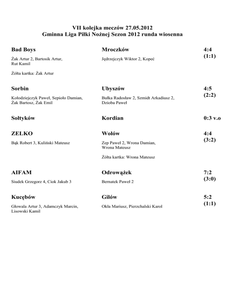 VII kolejka meczów 27.05.2012 Gminna Liga Piłki Nożnej Sezon 2012 runda wiosenna Bad Boys Mroczków Żak Artur 2, Bartosik Artur, Rut Kamil Jędrzejczyk Wiktor 2, Kopeć 4:4 (1:1) Żółta kartka: Żak Artur Sorbin Ubyszów Kołodziejczyk Paweł, Sepioło Damian, Żak Bartosz, Żak Emil Bułka Radosław 2, Szmidt Arkadiusz 2, Dzioba Paweł Sołtyków Kordian 0:3 v.o ZELKO Wołów Bąk Robert 3, Kuliński Mateusz Zep Paweł 2, Wrona Damian, Wrona Mateusz 4:4 (3:2) 4:5 (2:2) Żółta kartka: Wrona Mateusz AIFAM Odrowążek Siudek Grzegorz 4, Ciok Jakub 3 Bernatek Paweł 2 Kucębów Gilów Głowala Artur 3, Adamczyk Marcin, Lisowski Kamil Okła Mariusz, Pierzchalski Karol 7:2 (3:0) 5:2 (1:1)
