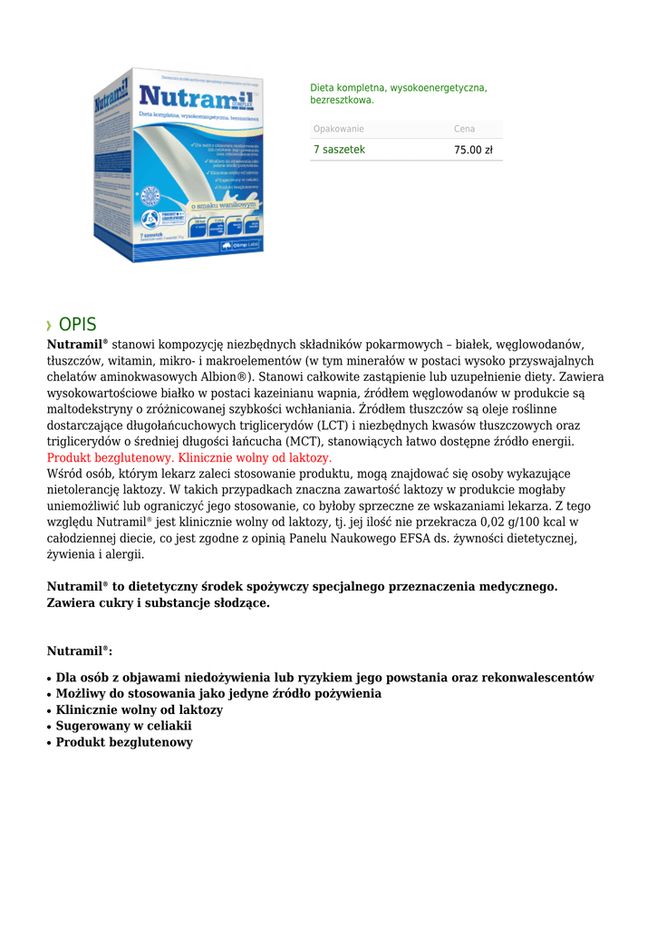 Dieta kompletna, wysokoenergetyczna, bezresztkowa. Opakowanie Cena 7 saszetek 75.00 zł OPIS Nutramil® stanowi kompozycję niezbędnych składników pokarmowych – białek, węglowodanów, tłuszczów, witamin, mikro- i makroelementów (w tym minerałów w postaci wysoko przyswajalnych chelatów aminokwasowych Albion®). Stanowi całkowite zastąpienie lub uzupełnienie diety. Zawiera wysokowartościowe białko w postaci kazeinianu wapnia, źródłem węglowodanów w produkcie są maltodekstryny o zróżnicowanej szybkości wchłaniania. Źródłem tłuszczów są oleje roślinne dostarczające długołańcuchowych triglicerydów (LCT) i niezbędnych kwasów tłuszczowych oraz triglicerydów o średniej długości łańcucha (MCT), stanowiących łatwo dostępne źródło energii. Produkt bezglutenowy. Klinicznie wolny od laktozy. Wśród osób, którym lekarz zaleci stosowanie produktu, mogą znajdować się osoby wykazujące nietolerancję laktozy. W takich przypadkach znaczna zawartość laktozy w produkcie mogłaby uniemożliwić lub ograniczyć jego stosowanie, co byłoby sprzeczne ze wskazaniami lekarza. Z tego względu Nutramil® jest klinicznie wolny od laktozy, tj. jej ilość nie przekracza 0,02 g/100 kcal w całodziennej diecie, co jest zgodne z opinią Panelu Naukowego EFSA ds. żywności dietetycznej, żywienia i alergii. Nutramil® to dietetyczny środek spożywczy specjalnego przeznaczenia medycznego. Zawiera cukry i substancje słodzące. Nutramil®: ● ● ● ● ● Dla osób z objawami niedożywienia lub ryzykiem jego powstania oraz rekonwalescentów Możliwy do stosowania jako jedyne źródło pożywienia Klinicznie wolny od laktozy Sugerowany w celiakii Produkt bezglutenowy SKŁAD PROCENTOWY UDZIAŁ ENERGII (% KCAL) Informacja żywieniowa Wartość energetyczna 1 porcja/ 1 saszetka/ 72 g 100 g 1254 kJ/300 kcal 1743 kJ/417 kcal 8,4 g 2,5 g 1,7 g 12 g 3,5 g 2,4 g 45 g 5,2 g <0,058 g 62,5 g 7,2 g <0,08 g 0g 0g Białko 11,3 g 15,7 g Sól 0,43 g 0,59 g 160 μg (20%*) 222 μg 1 μg (20%*) 1,4 μg 2,4 mg (20%*) 3,3 mg Witamina K 15 μg (20%) 21 μg Witamina C 16 mg (20%*) 22 mg Witamina B1 0,22 mg (20%*) 0,3 mg Witamina B2 0,28 mg (20%*) 0,4 mg Niacyna (mg NE) 3,2 mg (20%*) 4,4 mg Witamina B6 0,28 mg (20%*) 0,4 mg Kwas foliowy 40 μg (20%*) 56 μg Witamina B12 0,5 μg (20%*) 0,7 μg Biotyna 10 μg (20%*) 13,9 μg Kwas pantotenowy 1,2 mg (20%*) 1,7 mg 170 mg 236 mg Potas 349 mg (17%*) 485 mg Chlorki 160 mg (20%*) 222 mg Wapń 182 mg (23%*) 253 mg Tłuszcz, w tym: - nasycone kwasy tłuszczowe - MCT Węglowodany, w tym: - cukry - laktoza Błonnik Witamina A (mg RE) Witamina D Witamina E (mg α-TE) Sód Fosfor 140 mg (20%*) 194 mg Magnez (z chelatu Albion®) 45 mg (12%*) 63 mg Żelazo (z chelatu Albion®) 1,5 mg (11%) 2,1 mg Cynk (z chelatu Albion®) 2 mg (20%*) 2,8 mg Miedź 200 μg (20%*) 278 μg Mangan 0,4 mg (20%*) 0,56 mg Molibden 10 μg (20%*) 14 μg Selen 11 μg (20%*) 15 μg Chrom 8 μg (20%*) 11 μg Jod 30 μg (20%*) 42 μg Osmolarność 290 mOsm/l *RWS - referencyjna wartość spożycia. Składniki: maltodekstryny kukurydziane, kazeinian wapnia (białko mleka), oleje roślinne (olej rzepakowy 80%, olej MCT 20%), aromaty, kwas jabłkowy – regulator kwasowości (dla smaku truskawkowego, malinowego), hydroksypropylometyloceluloza, talk, glikol polietylenowy – nośniki, sól potasowa kwasu ortofosforowego, diglicynian magnezu, chlorek sodu, lecytyna sojowa emulgator, cytrynian sodu, acesulfam K, sukraloza, sacharynian sodu – substancje słodzące, kwas L-askorbinowy - wit. C, diglicynian cynku, diglicynian żelazawy, octan DL-α-tokoferylu - wit. E; koszenila, dwutlenek tytanu – barwniki, glukonian manganu, nikotynamid – niacyna, selenin sodu, octan retinylu – wit. A, mieszanina tokoferoli – przeciwutleniacz, glukonian miedzi, D-pantotenian wapnia - kwas pantotenowy, D-biotyna, cyjanokobalamina - wit. B12, cholekalcyferol – wit. D, kwas pteroilomonoglutaminowy – foliany, chlorowodorek pirydoksyny - wit. B6, filochinon – wit. K, ryboflawina - wit. B2, monoazotan tiaminy – wit. B1, chlorek chromu (III), jodek potasu, molibdenian (VI) sodu. PRZEZNACZENIE Produkt przeznaczony do postępowania dietetycznego w stanach: ● ● ● ● ● ● ● ● ● ● ● ● braku apetytu o różnej etiologii; niedożywienia lub ryzyka jego powstania (np. choroba Alzheimera, Parkinsona, anoreksja); rekonwalescencji; w chorobach utrudniających gryzienie i połykanie; w problemach z samodzielnym przygotowaniem i spożywaniem posiłków; chorobach krótkotrwałych, o ciężkim przebiegu (np. grypa); stanach po udarach i urazach; okresach przed- i pooperacyjnych; chorobach zapalnych jelit; zespole jelita drażliwego (postać biegunkowa); resekcji częściowej jelit lub żołądka; diecie eliminacyjnej w celiakii i nietolerancji laktozy (laktoza < 0,02g/ 100 kcal lub < 0,025g/ 100 ml przygotowanego posiłku Nutramil™). DAWKOWANIE Dawkowanie: zależne od indywidualnego zapotrzebowania energetycznego organizmu. Przeciętnie: kompletna dieta pacjenta – 5-7 saszetek dziennie (1500-2100 kcal), uzupełnienie diety pacjenta – 1-3 saszetki dziennie (300-900 kcal). Sposób przygotowania: w celu sporządzenia 230 ml gotowego posiłku należy do naczynia zawierającego 170 ml przegotowanej wody o temperaturze pokojowej dodawać powoli zawartość 1 saszetki, ciągle mieszając aż do całkowitego rozpuszczenia proszku. Spożyć bezpośrednio po przygotowaniu. Ważna informacja: preparat przeznaczony do stosowania pod nadzorem lekarza. Odpowiedni do stosowania jako jedyne źródło pożywienia. Środki ostrożności i przeciwwskazania: nadwrażliwość na którykolwiek ze składników produktu. Nie stosować w galaktozemii. Preparat nie jest przeznaczony do stosowania pozajelitowego. Preparat przeznaczony dla dzieci od 3 roku życia.