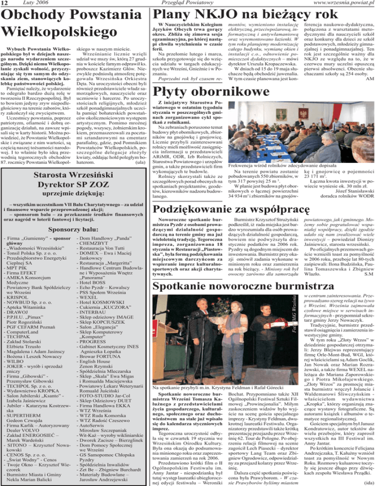 12 Luty 2006 Przegl¹d Powiatowy www.wrzesnia.powiat.pl Obchody Powstania Plany NKJO na bie¿¹cy rok Wielkopolskiego skiego w naszym mieœcie. Wrzeœnianie licznie wziêli udzia³ we mszy œw, któr¹ 27 grudnia w koœciele farnym odprawi³ ks. proboszcz Kazimierz G³ów. Niezwykle podnios³¹ atmosferê potêgowa³a Wrzesiñska Orkiestra Dêta. Na uroczystoœci obecni byli równie¿ przedstawiciele w³adz samorz¹dowych, nauczyciele oraz uczniowie i harcerze. Po uroczystoœciach religijnych, m³odzie¿ szkó³ ponadgimnazjalnych uczci³a pamiêæ bohaterskich powstañców okolicznoœciowym wystêpem artystycznym. Pomimo mroŸnej pogody, wszyscy, ¿o³nierskim krokiem, przemaszerowali za pocztami sztandarowymi na cmentarz parafialny, gdzie, pod Pomnikiem Powstañców Wielkopolskich, poszczególne delegacje z³o¿y³y kwiaty, oddaj¹c ho³d poleg³ym bohaterom. (ula) Starosta Wrzesiñski Dyrektor SP ZOZ uprzejmie dziêkuj¹: – wszystkim uczestnikom VII Balu Charytatywnego – za udzia³ i finansowe wsparcie przeprowadzonej akcji; – sponsorom balu – za przekazanie œrodków finansowych oraz nagród w loterii fantowej i licytacji. Sponsorzy balu: - Firma „Gumienny” - sponsor g³ówny - „Wiadomoœci Wrzesiñskie” - Tonsil Polska Sp. z o. o. - Przedsiêbiorstwo Energetyki Cieplnej SA - MPT PIK - Firma EFEKT - AMIKA Konsorcjum Medyczne - Powiatowy Bank Spó³dzielczy we Wrzeœni - KRISPOL - NOWBUD Sp. z o. o. - Apteka Witaminka - DRAWOJ - P.P.H.U. „Pimax” Piotr Rogoziñski - PGF CEFARM Poznañ - ComputerLand - TECHPAK - Zak³ad Stolarski El¿bieta Trzus³o - Magdalena i Adam Jasinscy - Bo¿ena i Leszek Nowaccy - WILBO - JOKER - wyrób i sprzeda¿ zniczy - Firma „Gibowski” Przemys³aw Gibowski - TECHPOL Sp. z o. o. - Wydawnictwo KROPKA - Salon Jubilerski „Ksanto” Izabela Jaœniewicz - Jubiler - Katarzyna Kostrzewska - SUPERTHERM Gedeon Czwajda - Firma Karlik – Autoryzowany Dealer VOLVO - Zak³ad ENERGOSIEÆ – Marek Wardeñski - SITONO – Krzysztof Nowakowski - CENOS Sp. z o. o. - „Œwiat Wodny” - Cenos - Twoje Okno – Krzysztof Wieczorek - Burmistrz Miasta i Gminy Nekla Marian Balicki - Dom Handlowy „Panda” - CHEMZBYT - Restauracja Von Tutti - DOMEX – Ewa i Maciej Jankowscy - Restauracja „Margeritta” - Handlowe Centrum Budowlane i Wyposa¿enia Wnêtrz „Panorama” - Hotel BOSS - Echo Pyzdr – Kowalscy - PSS Spo³em Wrzeœnia - WEXEL - Hotel KOSMOWSKI - Cukiernia „KUCZORA” - INTERBAU - Sklep odzie¿owy IMAGE - Sklep KOPCIUSZEK - Salon „Elegancja” - Sklep Komputerowy „Komputer” - PROGRESS - Gabinet Kosmetyczny INES Agnieszka £opatka - Browar FORTUNA - English House Zenon Rzymski - Spó³dzielnia Mleczarska - Sklep „Skala” Ewa Migas i Romualda Maciejewska - Powiatowy Lekarz Weterynarii Romuald Juœciñski - FOTO-STUDIO Jar-Col - Sklep Odzie¿owy DUET - Firma Handlowa EKKA - WTZ Wrzeœnia - WTZ Ruda Komorska - WTZ Radoœæ Czeszewo - AutoSerwis Miros³aw Szczepaniak - Wit-KaŸ – wyroby wikliniarskie - Dworek Zacisze – Bierzglinek - Dom Pomocy Spo³ecznej we Wrzeœni - GS Samopomoc Ch³opska Pyzdry - Spó³dzielnia Inwalidów - Zet Be – Zbigniew Burchardt - Materia³y Budowlane – Jaros³aw Andrzejewski montów, wymieniono instalacjê elektryczn¹, przeciwpo¿arow¹, informatyczn¹ i antyw³amaniow¹ oraz wyremontowano ³azienki. W tym roku planujemy modernizacjê ca³ego budynku, wymianê okien i instalacji c.o., odnowienie pomieszczeñ dydaktycznych – mówi dyrektor Urszula Kropaczewska. W dniach od 15 do 19 maja s³uchacze bêd¹ obchodziæ juwenalia. W tym czasie planowana jest kon- ferencja naukowo-dydaktyczna, po³¹czona z warsztatami metodycznymi dla nauczycieli szkó³ oraz konkursy dla dzieci ze szkó³ podstawowych, m³odzie¿y gimnazjalnej i ponadgimnazjalnej. Ten rok jest szczególnie wa¿ny dla NKJO ze wzglêdu na to, ¿e w czerwcu mury uczelni opuszcz¹ pierwsi absolwenci. Obecnie s³uchaczami szko³y s¹ 254 osoby. AM P³yty obornikowe Z inicjatywy Starostwa Powiatowego w ostatnim tygodniu stycznia w poszczególnych gminach zorganizowano cykl spotkañ z rolnikami. Na zebraniach poruszono temat budowy p³yt obornikowych, zbiorników na gnojówkê i gnojowicê. Licznie przybyli zainteresowani rolnicy mieli mo¿liwoœæ zasiêgniêcia informacji u przedstawicieli ARiMR, ODR, Izb Rolniczych, Starostwa Powiatowego i urzêdów gmin, a tak¿e przedstawicieli firm wykonuj¹cych te budowle. Rolnicy skorzystali tak¿e ze szczegó³owych porad obecnych na spotkaniach projektantów, geodetów, kierowników nadzoru budowlanego. Frekwencja wœród rolników zdecydowanie dopisa³a Na terenie powiatu zostanie kê i gnojowicê o pojemnoœci pobudowanych 550 zbiorników, w 23 171 m3. tym 317 powy¿ej 25 m 3. £¹czna kwota inwestycji w poW planie jest budowa p³yt obor- wiecie wyniesie ok. 30 mln z³. nikowych o ³¹cznej powierzchni Józef Stanis³awski 34 934 m2 i zbiorników na gnojówdoradca rolników WODR Podziêkowanie za wspó³pracê Noworoczne spotkanie burmistrza Pyzdr z osobami prowadz¹cymi dzia³alnoœæ gospodarcz¹ na terenie gminy ma ju¿ wieloletni¹ tradycjê. Tegoroczna impreza, zorganizowana 18 stycznia w Restauracji ,,Piastowska’’, by³a form¹ podziêkowania miejscowym darczyñcom za wspieranie imprez kulturalnosportowych oraz akcji charytatywnych. Burmistrz Krzysztof Stru¿yñski podkreœli³, i¿ rada miejska jest bardzo wyrozumia³a dla osób prowadz¹cych dzia³alnoœæ gospodarcz¹, bowiem nie podwy¿szy³a drastycznie podatków na 2006 rok. Pyzdry s¹ dogodnym miejscem do inwestowania. Burmistrz przy okazji omówi³ zadania wykonane w minionym roku oraz zamierzenia na rok bie¿¹cy. - Miniony rok by³ owocny zarówno dla samorz¹du powiatowego, jak i gminnego. Mo¿emy sobie pogratulowaæ wspania³ej wspó³pracy, dziêki zgodzie uda³o siê nam zrealizowaæ wiele inwestycji – powiedzia³ Dionizy Jaœniewicz, starosta wrzesiñski. Po oficjalnych przemowach goœcie wznieœli toast za pomyœlnoœ