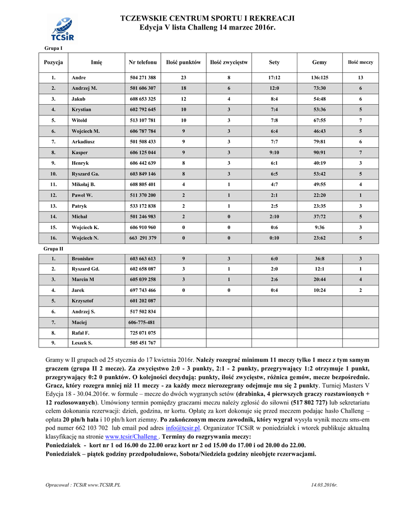 TCZEWSKIE CENTRUM SPORTU I REKREACJI Edycja V lista Challeng 14 marzec 2016r. Grupa I Imię Pozycja Nr telefonu Ilość punktów Ilość zwycięstw Sety Gemy Ilość meczy 1. Andre 504 271 388 23 8 17:12 136:125 13 2. Andrzej M. 501 606 307 18 6 12:0 73:30 6 3. Jakub 608 653 325 12 4 8:4 54:48 6 4. Krystian 602 792 645 10 3 7:4 53:36 5 5. Witold 513 107 781 10 3 7:8 67:55 7 6. Wojciech M. 606 787 784 9 3 6:4 46:43 5 7. Arkadiusz 501 508 433 9 3 7:7 79:81 6 8. Kasper 606 125 044 9 3 9:10 90:91 7 9. Henryk 606 442 639 8 3 6:1 40:19 3 10. Ryszard Ga. 603 849 146 8 3 6:5 53:42 5 11. Mikołaj B. 608 805 401 4 1 4:7 49:55 4 12. Paweł W. 511 370 200 2 1 2:1 22:20 1 13. Patryk 533 172 838 2 1 2:5 23:35 3 14. Michał 501 246 983 2 0 2:10 37:72 5 15. Wojciech K. 606 910 960 0 0 0:6 9:36 3 16. Wojciech N. 663 291 379 0 0 0:10 23:62 5 1. Bronisław 603 663 613 9 3 6:0 36:8 3 2. Ryszard Gd. 602 658 087 3 1 2:0 12:1 1 3. Marcin M 605 039 258 3 1 2:6 20:44 4 4. Jarek 697 743 466 0 0 0:4 10:24 2 5. Krzysztof 601 202 087 6. Andrzej S. 517 502 834 7. Maciej 606-775-481 8. Rafał F. 725 071 075 9. Leszek S. 505 451 767 Grupa II Gramy w II grupach od 25 stycznia do 17 kwietnia 2016r. Należy rozegrać minimum 11 meczy tylko 1 mecz z tym samym graczem (grupa II 2 mecze). Za zwycięstwo 2:0 - 3 punkty, 2:1 - 2 punkty, przegrywający 1:2 otrzymuje 1 punkt, przegrywający 0:2 0 punktów. O kolejności decydują: punkty, ilość zwycięstw, różnica gemów, mecze bezpośrednie. Gracz, który rozegra mniej niż 11 meczy - za każdy mecz nierozegrany odejmuje mu się 2 punkty. Turniej Masters V Edycja 18 - 30.04.2016r. w formule – mecze do dwóch wygranych setów (drabinka, 4 pierwszych graczy rozstawionych + 12 rozlosowanych). Umówiony termin pomiędzy graczami meczu należy zgłosić do siłowni (517 802 727) lub sekretariatu celem dokonania rezerwacji: dzień, godzina, nr kortu. Opłatę za kort dokonuje się przed meczem podając hasło Challeng – opłata 20 pln/h hala i 10 pln/h kort ziemny. Po zakończonym meczu zawodnik, który wygrał wysyła wynik meczu sms-em pod numer 662 103 702 lub email pod adres [email protected]. Organizator TCSiR w poniedziałek i wtorek publikuje aktualną klasyfikację na stronie www.tcsir/Challeng . Terminy do rozgrywania meczy: Poniedziałek - kort nr 1 od 16.00 do 22.00 oraz kort nr 2 od 15.00 do 17.00 i od 20.00 do 22.00. Poniedziałek – piątek godziny przedpołudniowe, Sobota/Niedziela godziny nieobjęte rezerwacjami. Opracował : TCSiR www.TCSIR.PL 14.03.2016r.