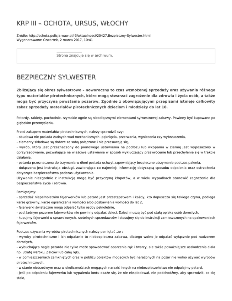 KRP III – OCHOTA, URSUS, WŁOCHY Źródło: http://ochota.policja.waw.pl/r3/aktualnosci/20427,Bezpieczny-Sylwester.html Wygenerowano: Czwartek, 2 marca 2017, 10:41 Strona znajduje się w archiwum. BEZPIECZNY SYLWESTER Zbliżający się okres sylwestrowo – noworoczny to czas wzmożonej sprzedaży oraz używania różnego typu materiałów pirotechnicznych, które mogą stwarzać zagrożenie dla zdrowia i życia osób, a także mogą być przyczyną powstania pożarów. Zgodnie z obowiązującymi przepisami istnieje całkowity zakaz sprzedaży materiałów pirotechnicznych dzieciom i młodzieży do lat 18. Petardy, rakiety, pochodnie, rzymskie ognie są nieodłącznymi elementami sylwestrowej zabawy. Powinny być kupowane po głębokim przemyśleniu. Przed zakupem materiałów pirotechnicznych, należy sprawdzić czy: - obudowa nie posiada żadnych wad mechanicznych -pęknięcia, przerwania, wgniecenia czy wybrzuszenia, - elementy składowe są dobrze ze sobą połączone i nie przesuwają się, - wyrób, który jest przeznaczony do pionowego ustawienia na podłożu lub wkopania w ziemię jest wyposażony w oprzyrządowanie, pozwalające na właściwe ustawienie w sposób wykluczający przewrócenie lub przechylenie się w trakcie działania, - petarda przeznaczona do trzymania w dłoni posiada uchwyt zapewniający bezpieczne utrzymanie podczas palenia, - dołączona jest instrukcja obsługi, zawierająca co najmniej: informację dotyczącą sposobu odpalenia oraz ostrzeżenia dotyczące bezpieczeństwa podczas użytkowania. Używanie niezgodnie z instrukcją mogą być przyczyną kłopotów, a w wielu wypadkach stanowić zagrożenie dla bezpieczeństwa życia i zdrowia. Pamiętajmy: - sprzedaż niepełnoletnim fajerwerków lub petard jest przestępstwem i każdy, kto dopuszcza się takiego czynu, podlega karze grzywny, karze ograniczenia wolności albo pozbawienia wolności do lat 2, - fajerwerki świąteczne mogą odpalać tylko osoby pełnoletnie, - pod żadnym pozorem fajerwerków nie powinny odpalać dzieci. Dzieci muszą być pod stałą opieką osób dorosłych, - kupujmy fajerwerki u sprawdzonych, rzetelnych sprzedawców i stosujmy się do instrukcji zamieszczonych na opakowaniach fajerwerków. Podczas używania wyrobów pirotechnicznych należy pamiętać ,że : - wyroby pirotechniczne i ich odpalanie to niebezpieczna zabawa, dlatego wolno je odpalać wyłącznie pod nadzorem dorosłych, - wybuchająca nagle petarda nie tylko może spowodować oparzenia rąk i twarzy, ale także poważniejsze uszkodzenia ciała np. utratę wzroku, palców lub całej ręki, - w pomieszczeniach zamkniętych oraz w pobliżu obiektów mogących być narażonych na pożar nie wolno używać wyrobów pirotechnicznych, - w stanie nietrzeźwym oraz w okolicznościach mogących narazić innych na niebezpieczeństwo nie odpalajmy petard, - jeśli po odpaleniu fajerwerku lub wypaleniu lontu okaże się, że nie eksplodował, nie podchodźmy, aby sprawdzić, co się stało, - petardy należy używać tylko i wyłącznie zgodnie z instrukcją zamieszczoną na opakowaniu, - przed kupnem należy sprawdzić na opakowaniu znajduje się instrukcja w języku polskim. Jedynie postępowanie zgodne z instrukcją gwarantuje bezpieczeństwo podczas odpalania petard. Ograniczenia w używaniu fajerwerków wprowadzają zarówno przepisy kodeksu wykroczeń, jak i prawa lokalnego – w postaci uchwał rad gmin czy zarządzenia wojewody. W art. 51 k.w. opisano czyn polegający na zakłócaniu ciszy, spokoju i porządku publicznego. Przepis ten nie zawiera ograniczeń czasowych – obowiązuje nieprzerwanie cały rok. Dla wyczerpania znamion wykroczenia, a tym samym podjęcia interwencji przez policjanta, wymagane jest zgłoszenie osoby, której przeszkadza hałas. Zgodnie z k.w., sprawcy grozi mandat karny lub/i wniosek o ukaranie do sądu - grzywna do 5 tys. zł. Przepisy prawa lokalnego w formie zarządzenia wojewody lub uchwały rady gminy wskazują ramy czasowe, w których dopuszcza się używanie fajerwerków, tj. np. w Sylwestra i Nowy Rok. Ustawa z 22 czerwca 2001r. o wykonywaniu działalności gospodarczej w zakresie wytwarzania i obrotu materiałami wybuchowymi, bronią, amunicją oraz wyrobami i technologią o przeznaczeniu wojskowym lub policyjnym stanowi: - art.31 § 2 wyroby pirotechniczne mogą być sprzedawane wyłącznie osobom pełnoletnim, po okazaniu dokumenty tożsamości, - art. 37 kto sprzedaje wyroby pirotechniczne, wyłączone spod koncesji… osobom niepełnoletnim podlega karze grzywny, karze ograniczenia wolności albo pozbawienia wolności do lat 2. Pamiętajmy o zachowaniu bezpieczeństwa przy odpalaniu fajerwerków, a przede wszystkim o rozsądku i rozwadze. Nigdy nie odpalajmy petard, trzymając je w rękach. Zadbajmy wspólnie o to, aby koniec starego i początek Nowego Roku był dla nas wszystkich miły i bezpieczny. mat. za KGP Ocena: 0/5 (0) Tweetnij