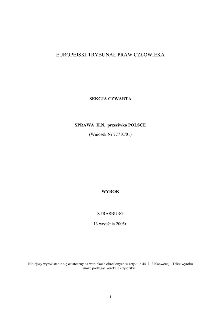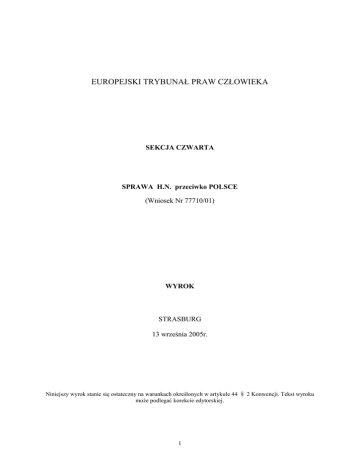 EUROPEJSKI TRYBUNAŁ PRAW CZŁOWIEKA SEKCJA CZWARTA SPRAWA H.N. przeciwko POLSCE (Wniosek Nr 77710/01) WYROK STRASBURG 13 września 2005r. Niniejszy wyrok stanie się ostateczny na warunkach określonych w artykule 44 § 2 Konwencji. Tekst wyroku może podlegać korekcie edytorskiej. 1 W sprawie H.N. przeciwko Polsce Europejski Trybunał Praw Człowieka ( Sekcja Czwarta), obradująca jako Izba w składzie: Sir Nicolas BRATZA, Przewodniczący Pan J. CASADEVALL, Pan G.BONELLO, Pan R.BONELLO, Pan S.PAVLOSCHI, Pan L.GARLICKI, Pan J.BORNEGO BORNEGO, sędziowie oraz Pan M.O’BOYLE, Protokolant Sekcji Po posiedzeniu przy drzwiach zamkniętych 25 sierpnia 2005r., Ogłasza następujący wyrok, który został uchwalony tego samego dnia: PROCEDURA 1. Sprawa rozpoczęła się wnioskiem (nr 77710/01) przeciwko Rzeczypospolitej Polskiej złożonym w Trybunale zgodnie z artykułem 34 Konwencji o Ochronie Praw Człowieka i Podstawowych Wolności (zwanej dalej „Konwencją”) przez obywatela Norwegii, Pana H.N. (zwanego dalej „powodem”) 23 października 2000r. Przewodniczący Izby przychylił się do prośby powoda, aby nie podawać jego nazwiska (przepis 47 §3 Regulaminu Sądu). 2. Powoda, któremu przyznano pomoc prawną, reprezentował Pan T. Nilsen, prawnik z miasta Levanger. Rząd polski (zwany dalej „Rządem”) reprezentowało dwóch jego Przedstawicieli: Pan K. Drzewicki oraz Pan J. Wołąsiewicz z Ministerstwa Spraw Zagranicznych. 3. Powód oświadczył w szczególności, iż niewykonanie końcowego wyroku zgodnie z Konwencją Haską z 1980r. dotyczącą cywilnych aspektaów uprowadzenia dziecka za granicę naruszyło jego prawa wynikające z artykułu 6 i 8 Konwencji. 4. Powód został przydzielony do Sekcji Czwartej Trybunału (przepis 52 §1 Regulaminu Sądu). Izba, która miała rozpatrzyć niniejszą sprawę w ramach Sekcji Czwartej (artykuł 27 § Konwencji) została ustanowiona na mocy przepisu 26 §1. 5. Decyzją z dn. 7 lutego 2004r. Trybunał uznał wniosek za częściowo dopuszczalny. 6. 1 listopada 2004r. Trybunał zmienił skład swoich Sekcji (przepis 25 §1). Niniejsza sprawa została skierowana do nowo utworzonej Sekcji Czwartej. FAKTY I. OKOLICZNOŚCI SPRAWY 7. Powód urodził się w 1946r. i mieszka w Norwegii. A. Rodzina powoda 8. W 1987r. powód ożenił się z obywatelką Polski M.C. W 1989r. M.C. urodziła ich pierwszą córkę A. Następnie w 1992r. urodził się syn B., a w 1994r. druga córka, C. 9. Powód mieszkał wraz z rodziną w Norwegii. W ich domu mieszkał również S.C., syn M.C. z jej poprzedniego małżeństwa, urodzony w 1980r. 10. 22 listopada 1994r. M.C. została skierowana na ponad dwa miesiące do zakładu psychiatrycznego. Według powoda, stwierdzono u niej „wyraźną psychozę paranoiczną”. 2 11. S.C. cierpiał na zaburzenia rozwoju spowodowane przez „wyraźne odrzucenie” ze strony jego matki. B. Separacja 12. Od 31 marca 1998r. powód oraz M.C. pozostawali w separacji. Następnie wnieśli pozew o rozwód. 13. 15 czerwca 1998r. Sąd Rejonowy w Inderoy przyznał powodowi opiekę nad A, B i C. Ponadto sąd przyznał M.C. prawo do wizyt. Mogła ona odwiedzać dzieci raz w tygodniu w ich domu i w co drugi weekend po przesłaniu powodowi pisemnego zawiadomienia z 3-dniowym wyprzedzeniem. W tym samym czasie sąd wydał nakaz zakazujący M.C. odwiedzania jej dzieci w szkołach. Zarówno powodowi jak i M.C. przyznano prawa rodzicielskie. 14. 17 lipca 1998r. Sąd Rejonowy w Trondheim oddalił zażalenie M.C. na decyzję Sądu Rejonowego. C. Uprowadzenie dzieci oraz wniosek o ich zwrot 15. 28 sierpnia 1999r. M.C. uprowadziła A, B oraz C i przeniosła się wraz z nimi do Polski. 16. 31 sierpnia 1999r. powód wystąpił do Ministerstwa Sprawiedliwości Rzeczypospolitej Polskiej – jako organu centralnego ustanowionego na mocy Konwencji Haskiej dotyczącej cywilnych aspektów uprowadzenia dziecka za granicę – o pomoc w umożliwieniu powrotu dzieci. 17. 9 września 1999r. M.C. złożyła w Sądzie Rejonowym w Warszawie wniosek o wydanie postanowienia stwierdzającej, iż A, B i C są na stałe zameldowane w Warszawie. 18. 24 września 1999r. wniosek powoda o nakazanie powrotu dzieci został złożony w Sądzie Rejonowym w Warszawie przez polski organ centralny. 19. 5 października 1999r. Sąd Rejonowy w Warszawie zawiesił postępowanie w sprawie wniosku złożonego przez M.C. Decyzja sądu opierała się na art. 16 Konwencji Haskiej. 20. 22 listopada 1999r. opinia biegłego przetłumaczona na jęz. polski została przekazana z Sądu Rejonowego w Inderoy do Ministerstwa Sprawiedliwości RP. 21. 25 listopada 1999r. w Sądzie Rejonowym w Warszawie odbyła się rozprawa w sprawie dotyczącej wniosku powoda o nakazanie powrotu dzieci. M.C., której adwokat nie uczestniczył w rozprawie poinformowała sąd, iż chciałaby dostarczyć w późniejszym czasie dokumenty, z których wynika, iż ona oraz jej dzieci były źle traktowane przez powoda. Rozprawę odroczono do 6 grudnia 1999r. 22. 6 grudnia 1999r. sąd zażądał opinii biegłego na temat relacji pomiędzy dziećmi a ich rodzicami oraz stwierdzającej, czy powrót dzieci do powoda nie doprowadziłby do fizycznych lub psychologicznych zaburzeń u dzieci. Rozprawę odroczono do 10 stycznia 2000r. 23. 7 grudnia 1999r. powód, M.C. oraz dzieci zostały przesłuchane w warszawskim Ośrodku Diagostyczno - Konsultacyjnym, który był również odpowiedzialny za przygotowanie opinii biegłego. 24. 5 stycznia 2000r. Sąd Rejonowy w Inderoy przyznał powodowi prawa rodzicielskie nad A., B. i C. oraz zmienił M.C. prawa do wizyt. Sąd uznał, iż M.C. zabrała dzieci do Polski niezgodnie z prawem. 25. 10 stycznia 2000r. rozprawa przed Sądem Rejonowym w Warszawie została odroczona bez terminu, ponieważ opinia biegłego nie była wówczas gotowa. 26. Opinia biegłego została dostarczona 2 lutego 2000r. Zawierała ona 6 stron i kończyła się następującymi wnioskami: 3 „Więzi emocjonalne małole