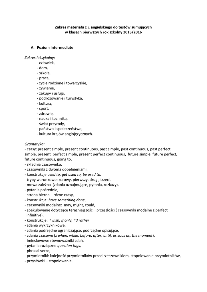 Zakres materiału z j. angielskiego do testów sumujących w klasach pierwszych rok szkolny 2015/2016 A. Poziom intermediate Zakres leksykalny: - człowiek, - dom, - szkoła, - praca, - życie rodzinne i towarzyskie, - żywienie, - zakupy i usługi, - podróżowanie i turystyka, - kultura, - sport, - zdrowie, - nauka i technika, - świat przyrody, - państwo i społeczeństwo, - kultura krajów anglojęzycznych. Gramatyka: - czasy: present simple, present continuous, past simple, past continuous, past perfect simple, present perfect simple, present perfect continuous, future simple, future perfect, future continuous, going to, - składnia czasownika, - czasowniki z dwoma dopełnieniami, - konstrukcje used to, get used to, be used to, - tryby warunkowe: zerowy, pierwszy, drugi, trzeci, - mowa zależna (zdania oznajmujące, pytania, rozkazy), - pytania pośrednie, - strona bierna – różne czasy, - konstrukcja: have something done, - czasowniki modalne: may, might, could, - spekulowanie dotyczące teraźniejszości i przeszłości ( czasowniki modalne z perfect infinitive), - konstrukcje: I wish, If only, I’d rather - zdania wykrzyknikowe, - zdania podrzędne ograniczające, podrzędne opisujące, - zdania czasowe (z when, while, before, after, until, as soos as, the moment), - imiesłowowe równoważniki zdań, - pytania rozłączne question tags, - phrasal verbs, - przymiotniki: kolejność przymiotników przed rzeczownikiem, stopniowanie przymiotników, - przysłówki – stopniowanie, - słowotwórstwo - tworzenie przymiotników od czasowników i rzeczowników, przedrostki i przyrostki, - zaimki nieokreślone, zwrotne - zaimek it, - określniki, przedimki, Wypowiedź pisemna: Tekst użytkowy – list prywatny, e-mail, wpis na blogu lub forum internetowym z elementami opisu, relacjonowania, zapraszania, uzasadniania opinii, przedstawiania wad i zalet, różnych rozwiązań i poglądów. Tekst argumentacyjny – list formalny, rozprawka, artykuł publicystyczny – z elementami opisu, relacjonowania, recenzji, pogłębionej argumentacji. Sprawności językowe: - rozumienie tekstu słuchanego, - rozumienie tekstu czytanego, - wypowiedź pisemna, - znajomość środków językowych. B. Klasa dwujęzyczna Życie codzienne – sposób ubierania się Ubrania Świat wokół nas – narodowości Kolejność przymiotników Czas teraźniejszy prosty i ciągły – porównanie zastosowania Formy bezokolicznikowe i imiesłowowe po czasownikach Narodowości Różnice między narodowościami Człowiek i społeczeństwo – problemy społeczne Metody zapobiegania zagrożeniom społecznym Człowiek i społeczeństwo – problemy społeczne Metody zapobiegania zagrożeniom społecznym Człowiek – szkoła Wymiana st Osobowość Zakupy Życie towarzyskie Cena sławy udencka Wyrażenia z look: look (a bit/just) like + noun/person, look + adjective, look as though/as if/like + clause Życie codzienne – ważne okazje Obchody ważnych wydarzeń Zastosowanie czasów przeszłych: past simple, past continuous, past perfect Wyrażenie used to w czasie teraźniejszym, przeszłym i przyszłym Przymiotniki z przyimkami Życie osobiste –ważne wydarzenia Niezapomniane chwile Zdania wykrzyknikowe: How!, What! Wiadomość pisemna Dawne zwyczaje Nieprzyjemne zdarzenia Czasy teraźniejsze present simple i present continuous Czasy przeszłe past simple, past continuous, past perfect Used to Poznawanie się Życie codzienne – praca Rodzaje i miejsca pracy Praca za granicą Praca i płeć Rozmowa kwalifikacyjna Podanie o pracę Człowiek i jego ciało Części ciała Sposoby odżywiania się Zdania przydawkowe ograniczające Zdania przydawkowe opisujące Porównanie zastosowania czasów past simple i present perfect Czas present perfect continuous – zastosowanie (porównanie z czasem present perfect simple) Człowiek - zdrowie Choroby i leczenie Wizyta u lekarza Życie codzienne – przekazywanie wiadomości Zdania przydawkowe ograniczające Zdania przydawkowe określające Choroby, kontuzje Czas present perfect continuous List prywatny Życie codzienne – przyszłość Przyszłość - przewidywanie i spekulacje Sposób życia w przyszłości Wizje przyszłości – przewidywania ekspertów Wyrażanie przyszłości: may, might, could, will i zdania warunkowe Czasy przyszłe: future perfect i future continuous Planowanie weekendu (forma pisemna): e-mail, list formalny i nieformalny, rozprawka (opiniująca i za i przeciw), sprawozdanie, list przewodni, recenzja; - niedwujęzyczni: list nieformalny, wpis na blogu lub forum internetowym, rozprawka, e-mail, list formalny, artykuł: recenzja książki.