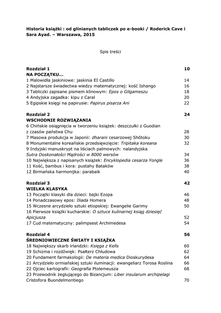 Historia książki : od glinianych tabliczek po e-booki / Roderick Cave i Sara Ayad. – Warszawa, 2015 Spis treści Rozdział 1 NA POCZĄTKU... 1 Malowidła jaskiniowe: jaskinia EI Castillo 2 Najstarsze świadectwa wiedzy matematycznej: kość Ishango 3 Tabliczki zapisane pismem klinowym: Epos o Gilgameszu 4 Andyjska zagadka: kipu z Caral 5 Egipskie księgi na papirusie: Papirus pisarza Ani Rozdział 2 WSCHODNIE ROZWIĄZANIA 6 Chińskie osiągnięcia w tworzeniu książek: deszczułki z Guodian z czasów państwa Chu 7 Masowa produkcja w Japonii: dharani cesarzowej Shōtoku 8 Monumentalne koreańskie przedsięwzięcie: Tripitaka koreana 9 Indyjski manuskrypt na liściach palmowych: nalandyjska Sutra Doskonałości Mądrości w 8000 wersów 10 Największa z napisanych książek: Encyklopedia cesarza Yongle 11 Kość, bambus i kora: pustahy Bataków 12 Birmańska harmonijka: parabaik Rozdział 3 WIELKA KLASYKA 13 Początki klasyki dla dzieci: bajki Ezopa 14 Ponadczasowy epos: Iliada Homera 15 Wczesne arcydzieło sztuki etiopskiej: Ewangelie Garimy 16 Pierwsze książki kucharskie: O sztuce kulinarnej ksiąg dziesięć Apicjusza 17 Cud matematyczny: palimpsest Archimedesa Rozdział 4 ŚREDNIOWIECZNE ŚWIATY I KSIĄŻKA 18 Największy skarb irlandzki: Księga z Kells 19 Schizma i rozdźwięk: Psałterz Chłudowa 20 Fundament farmakologii: De materia medica Dioskurydesa 21 Arcydzieło ormiańskiej sztuki iluminacji: ewangeliarz Torosa Roslina 22 Ojciec kartografii: Geografia Ptolemeusza 23 Przewodnik żeglującego do Bizancjum: Liber insularum archipelagi Cristofora Buondelmontiego 10 14 16 18 20 22 24 28 30 32 34 36 38 40 42 46 48 50 52 54 56 60 62 64 66 68 70 24 Iluminacje Mistrza Modlitewników: Powieść o Róży, wydanie brugijskie 25 Najwspanialsze ze wspaniałych: Godzinki Farnese 72 74 Rozdział 5 ŚWIATŁO ZE WSCHODU 26 Najstarsza z drukowanych książek: Diamentowa Sutra z Dunhuangu 27 Arcydzieło literatury i sztuki: Opowieść o księciu Genjim Murasaki 28 „Indyjski Ezop": Pańczatantra 29 Klasyczna muzułmańska księga astronomiczna: Księga gwiazd stałych As-Sufiego 30 Zapomniany poprzednik Leonarda da Vinci: Księga wiedzy o przemyślnych urządzeniach mechanicznych Al-Jazariego 31 Pierwszy atlas anatomiczny: Anatomia Mansura 32 Wczesna muzułmańska księga powstała na Jawie: Boke van Bonang 76 Rozdział 6 STYMULATORY ZMIAN 33 Rewolucja Gutenberga: Biblia czterdziestodwuwierszowa 34 Bestseller wśród wczesnych drukowanych książek: Kronika norymberska Schedela 35 Książka wydrukowana przez pierwszego angielskiego drukarza: Chesse Moralysed Caxtona 36 Pierwsza książka z dowcipami: Demaundes Joyous Wynkyna 37 Najstarsze teksty naukowe: Elementa geometriae Euklidesa 38 Wzorzec dla późniejszego projektowania książek: aldyńskie wydanie Eneidy Wergiliusza 39 Druk w języku arabskim: Godzinki Gregoria 40 Pierwszy druk w Afryce: Sefer Abudarham 41 Niebiańskie glosy: Cantatorium z opactwa św. Galla 42 Problem Gutenberga rozwiązany: Graduale Constantiense 43 Wielkie dzieło biblistów: Biblia Poliglota kompluteńska Rozdział 7 NIEBEZPIECZNY WYNALAZEK 44 Doskonalenie się języka szwedzkiego: Biblia Gustawa Wazy 45 Cenzura działa: O sposobie pisania listów Erazma 46 Pierwsze druki w Ameryce Brytyjskiej: Bay Psalm Book 47 Aztecka panorama życia prekolumbijskiego: Kodeks Mendoza 48 W poszukiwaniu pieprzu i gałki muszkatołowej: Itinerario Linschotena 49 Pierwsze nowoczesne studium anatomiczne: O budowie ciała ludzkiego Vesaliusa 50 Zadziwiający astronom amator: Astronomiae Brahego 51 Kamień węgielny nowoczesnej nauki: Principia Newtona 52 Ekspert w każdej dziedzinie: Cavelarice Markhama 53 Moda: Kunst- und Fleiss-übende Nadel-ergötzungen Helm 80 82 84 86 88 90 92 94 98 100 102 104 106 108 110 112 114 116 118 120 124 126 128 130 132 134 136 138 140 142 54 Wybitny brytyjski wkład w botanikę: zielnik Blackwell 55 Barokowy taniec w takt ówczesnej muzyki: Art of Dancing Tomlinsona 144 146 Rozdział 8 DRUK W CZASACH OŚWIECENIA 56 Klasycystyczne dramaty w rokokowej szacie: Dzieła Moliera z ilustracjami Bouchera 57 Największy słownik języka angielskiego: Dictionary of the English Language Johnsona 58 Bardzo wczesna książka dla dzieci: A Little Pretty Pocket-Book Newbery'ego 59 Najsłynniejsze dzieło oświecenia: Wielka encyklopedia francuska Diderota 60 Pionier wyszukiwania informacji: Species plantarum Linneusza 61 Użycie wykresów do przekazania informacji: Commercial and Political Atlas Playfaira 62 Zapisy zbrodni i kary: Newgate Calendar 63 Literacka osobliwość wkracza do Europy: Tristram Shandy Sterne'a 64 Wszechwładna sprośność czy literacka klasyka?: Fanny Hill Clelanda 65 Dzieło Afroamerykanina i stary problem: Almanack Bannekera 66 Mistrz czerni i bieli: History of British Birds Bewicka 67 Projektowanie ogrodów u szczytu rozwoju: „Czerwone księgi" Reptona 68 Początki wydawnictw czytanych dotykiem: Essai sur l'éducation des aveugles Haüy'ego 148 Rozdział 9 DRUK W EPOCE PARY 69 Zasługująca na patent jankeska wynalazczość: patent Perkinsa 70 Pierwsza książka ilustrowana fotografiami: Photographs of British Algae Atkins 71 Fotografia rusza do Nowego Świata: Daguerian Excursions in Jamaica Duperlyego 72 Druki misjonarzy w Kanadzie: Syllabic Hymnbook Evansa 73 Rozwój publikacji w odcinkach: Klub Pickwicka Dickensa 74 Pulp fiction z czasów wiktoriańskich: Old Grizzly Adams Powella 75 Nowatorskie książki dla młodych czytelników: Robinson Crusoe in Words of One Syllable Aikin 76 Moralna edukacja poprzez obrazki: Staś Straszydło Hoffmana 77 Od średniowiecznego mistycyzmu do konstrukcji z papieru: Internationaler Circus Meggendorfera 78 Oto przewodnik, możesz ruszać w podróż: Szwajcaria Baedekera 79 Pierwszy znakomity szef kuchni: Modern Housewife Soyera 80 Przeznaczone dla kolonii: Napad z bronię w ręku Boldrewooda 152 154 156 158 160 162 164 166 168 170 172 174 176 178 182 184 186 188 190 192 194 196 198 200 202 204 R