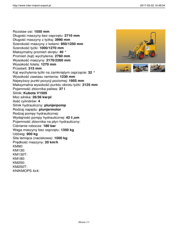 http://www.inter-import-export.pl 2017-03-02 10:49:34 Rozstaw osi: 1550 mm Długość maszyny bez osprzętu: 2710 mm Długość maszyny z łyżką: 3990 mm Szerokość maszyny z kołami: 950/1250 mm Szerokość łyżki: 1000/1270 mm Maksymalny promień skrętu: 40 ° Promień (kąt) wychylenia: 2760 mm Wysokość maszyny: 2170/2260 mm Wysokość fotela: 1270 mm Prześwit: 315 mm Kąt wychylenia łyżki na zamkniętym osprzęcie: 32 ° Wysokość zawiasu ramienia: 1230 mm Najwyższy punkt pozycji poziomej: 1955 mm Maksymalna wysokość punktu obrotu łyżki: 2125 mm Pojemność zbiornika paliwa: 37 l Silnik: Kubota V1505 Moc silnika: 26/36 kw/pl Ilość cylindrów: 4 Silnik hydrauliczny: plunjerpomp Rodzaj napędu: plunjermotor Rodzaj pompy hydraulicznej: Wydajność pompy hydraulicznej: 42 l/,om Pojemność zbiornika na płyn hydrauliczny: Ciśnienie robocze: 180 bar Waga maszyny bez osprzętu: 1350 kg Udźwig: 900 kg Siła łamiąca (naciskowa): 1000 kg Prędkość maszyny: 20 km/h KM90: KM130: KM130T: KM180: KM250: KM250T: KNIKMOPS 4x4: Strona 1/1