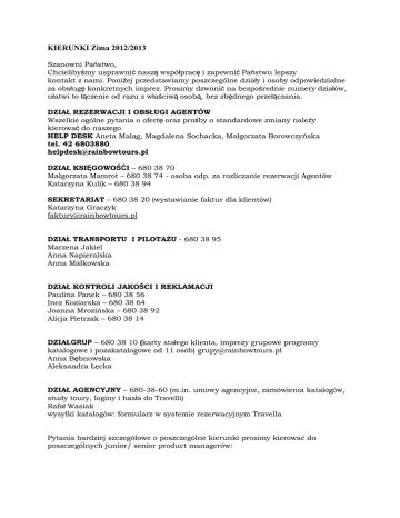 KIERUNKI Zima 2012/2013 Szanowni Państwo, Chcielibyśmy usprawnić naszą współpracę i zapewnić Państwu lepszy kontakt z nami. Poniżej przedstawiamy poszczególne działy i osoby odpowiedzialne za obsługę konkretnych imprez. Prosimy dzwonić na bezpośrednie numery działów, ułatwi to łączenie od razu z właściwą osobą, bez zbędnego przełączania. DZIAŁ REZERWACJI I OBSŁUGI AGENTÓW Wszelkie ogólne pytania o ofertę oraz prośby o standardowe zmiany należy kierować do naszego HELP DESK Aneta Maląg, Magdalena Sochacka, Małgorzata Borowczyńska tel. 42 6803880 [email protected] DZIAŁ KSIĘGOWOŚĆI – 680 38 70 Małgorzata Mamrot – 680 38 74 - osoba odp. za rozliczanie rezerwacji Agentów Katarzyna Kulik – 680 38 94 SEKRETARIAT – 680 38 20 (wystawianie faktur dla klientów) Katarzyna Graczyk [email protected] DZIAŁ TRANSPORTU I PILOTAŻU - 680 38 95 Marzena Jakiel Anna Napieralska Anna Małkowska DZIAŁ KONTROLI JAKOŚCI I REKLAMACJI Paulina Panek – 680 38 56 Inez Koziarska – 680 38 64 Joanna Mrozińska – 680 38 92 Alicja Pietrzak – 680 38 14 DZIAŁGRUP – 680 38 10 (karty stałego klienta, imprezy grupowe programy katalogowe i pozakatalogowe od 11 osób) [email protected] Anna Bębnowska Aleksandra Łęcka DZIAŁ AGENCYJNY – 680-38-60 (m.in. umowy agencyjne, zamówienia katalogów, study toury, loginy i hasła do Travelli) Rafał Wasiak wysyłki katalogów: formularz w systemie rezerwacyjnym Travella Pytania bardziej szczegółowe o poszczególne kierunki prosimy kierować do poszczególnych junior/ senior product managerów: KIERUNKI Zima 2012/2013 PRODUCT MANAGER JUNIOR PRODUCT MANAGER + NR. TEL DESTYNACJE Maria Sochacka 42 680 38 87 [email protected] Senegal, Mali, Gambia, Etiopia, Ekwador Łukasz Osowski 42 680 38 22 [email protected] Wenezuela, Brazylia, Argentyna, Chile i Wyspa Wielkanocna, Kolumbia, Peru, Boliwia Grecja autokarowa Paulina Milczarkiewicz 42 680 38 34 [email protected] Kuba, Fuerteventura, Seniorzy Hiszpania Bartek Żyła 42 680 38 02 [email protected] Meksyk, Teneryfa, Lanzarote Izabela Szumska Małgorzata Plewka Tomasz Woźniak 42 680 38 32 [email protected] Karolina Gąsiorowska Marcin Milczarek Tajlandia (wycieczki oparte o przelot do Bangkoku: TAT, TKV, TAK, TAL, TAB, TAJ), Laos, Birma, Kambodża, Singapur, Malezja, Wietnam Anna Wachnik 42 680 38 46 [email protected] Maroko, Tajlandia południe – Phuket, Khao Lak (TAM, TAP, TST) Paulina Musiał 42 680 38 35 [email protected] Paryż, Berlin, Narty – Francja, Austria Zillertal Marta Erchardt 42 680 38 85 [email protected] Kenia, Tanzania, Uganda, RPA, Madagaskar, Zanzibar, Włochy objazdy i narty Gabriela Włodarczyk 42 680 38 58 [email protected] Sri Lanka, Malediwy, Indie Joanna Woźniak 42 680 38 30 [email protected] Emiraty, Egipt – Hurghada Marta Nowak 42 680 38 21 [email protected] USA, Cypr, Jordania, Izrael, Liban Egipt – Sharm El Sheikh, Taba Olga Synowiec Anna Pakuła Serdecznie pozdrawiamy. RAINBOW TOURS S.A. ul. Piotrkowska 270 90-361 Łódź Ph. 0048 42 6803880, 6803888 Fax. 0048 42 6803889, 6803890 www.rainbowtours.pl NIP 725-18-68-136 KRS 0000178650 Sąd Rejonowy dla Łodzi-Śródmieścia XX Wydział Krajowego Rejestru Sądowego kapitał akcyjny: 1.455.200 PLN opłacony w całości