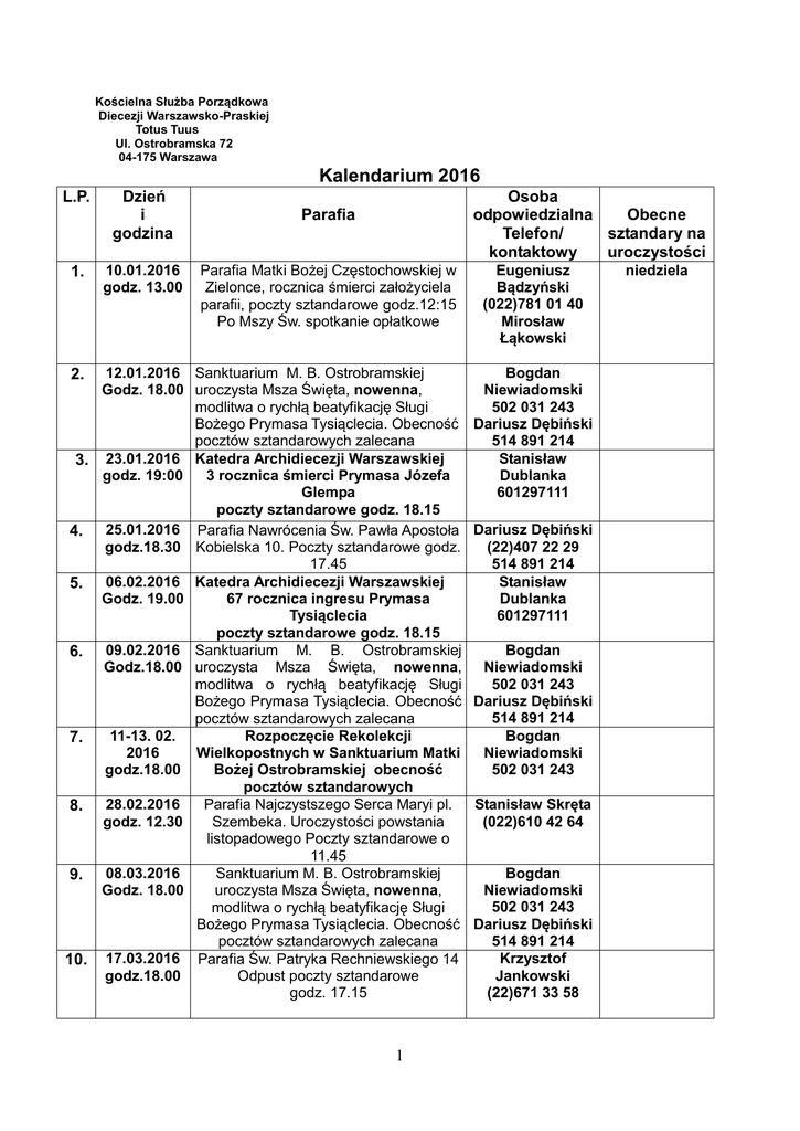 Kalendarium 2016 r. - kościelna służba porządkowa totus tuus