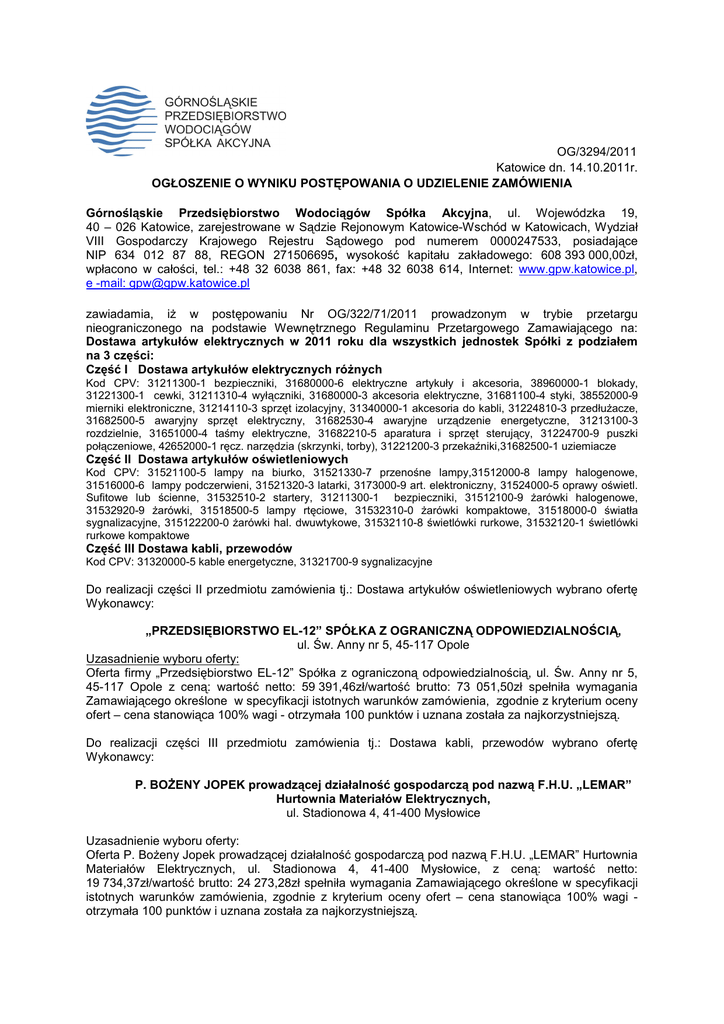 OG/3294/2011 Katowice dn. 14.10.2011r. OGŁOSZENIE O WYNIKU POSTĘPOWANIA O UDZIELENIE ZAMÓWIENIA Górnośląskie Przedsiębiorstwo Wodociągów Spółka Akcyjna, ul. Wojewódzka 19, 40 – 026 Katowice, zarejestrowane w Sądzie Rejonowym Katowice-Wschód w Katowicach, Wydział VIII Gospodarczy Krajowego Rejestru Sądowego pod numerem 0000247533, posiadające NIP 634 012 87 88, REGON 271506695, wysokość kapitału zakładowego: 608 393 000,00zł, wpłacono w całości, tel.: +48 32 6038 861, fax: +48 32 6038 614, Internet: www.gpw.katowice.pl, e -mail: [email protected] zawiadamia, iŜ w postępowaniu Nr OG/322/71/2011 prowadzonym w trybie przetargu nieograniczonego na podstawie Wewnętrznego Regulaminu Przetargowego Zamawiającego na: Dostawa artykułów elektrycznych w 2011 roku dla wszystkich jednostek Spółki z podziałem na 3 części: Część I Dostawa artykułów elektrycznych róŜnych Kod CPV: 31211300-1 bezpieczniki, 31680000-6 elektryczne artykuły i akcesoria, 38960000-1 blokady, 31221300-1 cewki, 31211310-4 wyłączniki, 31680000-3 akcesoria elektryczne, 31681100-4 styki, 38552000-9 mierniki elektroniczne, 31214110-3 sprzęt izolacyjny, 31340000-1 akcesoria do kabli, 31224810-3 przedłuŜacze, 31682500-5 awaryjny sprzęt elektryczny, 31682530-4 awaryjne urządzenie energetyczne, 31213100-3 rozdzielnie, 31651000-4 taśmy elektryczne, 31682210-5 aparatura i sprzęt sterujący, 31224700-9 puszki połączeniowe, 42652000-1 ręcz. narzędzia (skrzynki, torby), 31221200-3 przekaźniki,31682500-1 uziemiacze Część II Dostawa artykułów oświetleniowych Kod CPV: 31521100-5 lampy na biurko, 31521330-7 przenośne lampy,31512000-8 lampy halogenowe, 31516000-6 lampy podczerwieni, 31521320-3 latarki, 3173000-9 art. elektroniczny, 31524000-5 oprawy oświetl. Sufitowe lub ścienne, 31532510-2 startery, 31211300-1 bezpieczniki, 31512100-9 Ŝarówki halogenowe, 31532920-9 Ŝarówki, 31518500-5 lampy rtęciowe, 31532310-0 Ŝarówki kompaktowe, 31518000-0 światła sygnalizacyjne, 315122200-0 Ŝarówki hal. dwuwtykowe, 31532110-8 świetlówki rurkowe, 31532120-1 świetlówki rurkowe kompaktowe Część III Dostawa kabli, przewodów Kod CPV: 31320000-5 kable energetyczne, 31321700-9 sygnalizacyjne Do realizacji części II przedmiotu zamówienia tj.: Dostawa artykułów oświetleniowych wybrano ofertę Wykonawcy: „PRZEDSIĘBIORSTWO EL-12” SPÓŁKA Z OGRANICZNĄ ODPOWIEDZIALNOŚCIĄ, ul. Św. Anny nr 5, 45-117 Opole Uzasadnienie wyboru oferty: Oferta firmy „Przedsiębiorstwo EL-12” Spółka z ograniczoną odpowiedzialnością, ul. Św. Anny nr 5, 45-117 Opole z ceną: wartość netto: 59 391,46zł/wartość brutto: 73 051,50zł spełniła wymagania Zamawiającego określone w specyfikacji istotnych warunków zamówienia, zgodnie z kryterium oceny ofert – cena stanowiąca 100% wagi - otrzymała 100 punktów i uznana została za najkorzystniejszą. Do realizacji części III przedmiotu zamówienia tj.: Dostawa kabli, przewodów wybrano ofertę Wykonawcy: P. BOśENY JOPEK prowadzącej działalność gospodarczą pod nazwą F.H.U. „LEMAR” Hurtownia Materiałów Elektrycznych, ul. Stadionowa 4, 41-400 Mysłowice Uzasadnienie wyboru oferty: Oferta P. BoŜeny Jopek prowadzącej działalność gospodarczą pod nazwą F.H.U. „LEMAR” Hurtownia Materiałów Elektrycznych, ul. Stadionowa 4, 41-400 Mysłowice, z ceną: wartość netto: 19 734,37zł/wartość brutto: 24 273,28zł spełniła wymagania Zamawiającego określone w specyfikacji istotnych warunków zamówienia, zgodnie z kryterium oceny ofert – cena stanowiąca 100% wagi otrzymała 100 punktów i uznana została za najkorzystniejszą.