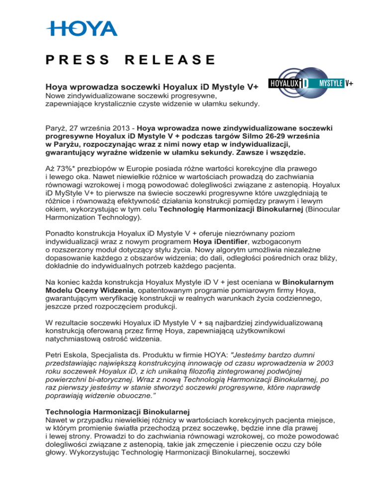 PRESS RELEASE Hoya wprowadza soczewki Hoyalux iD Mystyle V+ Nowe zindywidualizowane soczewki progresywne, zapewniające krystalicznie czyste widzenie w ułamku sekundy. Paryż, 27 września 2013 - Hoya wprowadza nowe zindywidualizowane soczewki progresywne Hoyalux iD Mystyle V + podczas targów Silmo 26-29 września w Paryżu, rozpoczynając wraz z nimi nowy etap w indywidualizacji, gwarantujący wyraźne widzenie w ułamku sekundy. Zawsze i wszędzie. Aż 73%* prezbiopów w Europie posiada różne wartości korekcyjne dla prawego i lewego oka. Nawet niewielkie różnice w wartościach prowadzą do zachwiania równowagi wzrokowej i mogą powodować dolegliwości związane z astenopią. Hoyalux iD MyStyle V+ to pierwsze na świecie soczewki progresywne które uwzględniają te różnice i równoważą efektywność działania konstrukcji pomiędzy prawym i lewym okiem, wykorzystując w tym celu Technologię Harmonizacji Binokularnej (Binocular Harmonization Technology). Ponadto konstrukcja Hoyalux iD Mystyle V + oferuje niezrównany poziom indywidualizacji wraz z nowym programem Hoya iDentifier, wzbogaconym o rozszerzony moduł dotyczący stylu życia. Nowy algorytm umożliwia niezależne dopasowanie każdego z obszarów widzenia; do dali, odległości pośrednich oraz bliży, dokładnie do indywidualnych potrzeb każdego pacjenta. Na koniec każda konstrukcja Hoyalux Mystyle iD V + jest oceniana w Binokularnym Modelu Oceny Widzenia, opatentowanym programie pomiarowym firmy Hoya, gwarantującym weryfikację konstrukcji w realnych warunkach życia codziennego, jeszcze przed rozpoczęciem produkcji. W rezultacie soczewki Hoyalux iD Mystyle V + są najbardziej zindywidualizowaną konstrukcją oferowaną przez firmę Hoya, zapewniającą użytkownikowi natychmiastową ostrość widzenia. Petri Eskola, Specjalista ds. Produktu w firmie HOYA: "Jesteśmy bardzo dumni przedstawiając największą konstrukcyjną innowację od czasu wprowadzenia w 2003 roku soczewek Hoyalux iD, z ich unikalną filozofią zintegrowanej podwójnej powierzchni bi-atorycznej. Wraz z nową Technologią Harmonizacji Binokularnej, po raz pierwszy jesteśmy w stanie stworzyć soczewki progresywne, które naprawdę poprawiają widzenie obuoczne.” Technologia Harmonizacji Binokularnej Nawet w przypadku niewielkiej różnicy w wartościach korekcyjnych pacjenta miejsce, w którym promienie światła przechodzą przez soczewkę, będzie inne dla prawej i lewej strony. Prowadzi to do zachwiania równowagi wzrokowej, co może powodować dolegliwości związane z astenopią, takie jak zmęczenie i pieczenie oczu czy bóle głowy. Wykorzystując Technologię Harmonizacji Binokularnej, soczewki Hoyalux Mystyle iD V+ rozpatrują wartości korekcyjne dla prawego i lewego oka jako oddzielne komponenty, w celu zdefiniowania binokularnej konstrukcji soczewek oraz obliczenia wymaganej dystrybucji progresji, odpowiednio dla każdego oka. W przeciwieństwie do konwencjonalnych metod projektowania indywidualnych soczewek, opatentowana technologia stosowana w soczewkach Hoyalux iD MyStyle V + zapewnia właściwą korekcję w każdym punkcie soczewki, dostosowaną do potrzeb każdego oka, w ujęciu binokularnym. Rezultatem jest doskonała, niewymagająca wysiłku akomodacja, poczucie stabilności i większa głębia widzenia. Nowy Hoya iDentifier Hoyalux iD Mystyle V + oferuje bezprecedensowy poziom indywidualizacji, ponieważ bierze pod uwagę wszystkie zmienne określające specyfikę każdego pacjenta, takie jak indywidualne warunki użytkowania okularów, sposób ich noszenia, wartości korekcyjne czy styl życia. Dzięki nowemu programowi Hoya iDentifier wszystkie te elementy są rejestrowane krok po kroku. Nowy algorytm dostosowuje każdy z obszarów widzenia do indywidualnych potrzeb każdego pacjenta – połączone w jednej konstrukcji obszary te tworzą soczewkę z dystrybucją progresji idealnie dopasowaną do użytkownika. Ten unikalny system z praktycznie nieograniczoną liczbą kombinacji konstrukcji, gwarantuje stworzenie w pełni spersonalizowanego profilu, uwzględniającego potrzeby wzrokowe nawet najbardziej wymagających klientów. InnoVision i Binokularny Model Oceny Widzenia Binokularny Model Oceny Widzenia został opracowany jako część InnoVision, filozofii i rdzeniu na którym firma HOYA tworzy swoje technologie, konstrukcje i usługi. Każda soczewka Hoyalux iD MyStyle V+ jest obliczana i oceniana zgodnie z tym modelem. Binokularny Model Oceny Widzenia to opatentowany program pomiaru widzenia obuocznego gwarantujący, że każda konstrukcja zanim trafi do produkcji, jest weryfikowana w realnych warunkach życia codziennego. Takie podejście gwarantuje bezprecedensową efektywność widzenia obuocznego: stabilny obraz i większą głębię widzenia w każdej sytuacji. Sprzedaż soczewek Hoyalux iD Mystyle V + rozpocznie się na początku listopada 2013. O firmie HOYA HOYA to japoński międzynarodowy koncern, działający w obszarze medycznotechnicznym, wiodący dostawca innowacyjnych produktów i usług opartych na zaawansowanych technologiach optycznych. HOYA skupia swoją działalność biznesową w dwóch głównych segmentach: Dział Ochrony Zdrowia (Life Care), odpowiada za produkty związane ze zdrowiem, takie jak soczewki okularowe, soczewki kontaktowe (obsługa sprzedaży detalicznej), a także produkty medyczne, takie jak soczewki wewnątrzgałkowe (IOL), wykorzystywane w operacjach zaćmy, oraz systemy obrazowania endoskopowego. Dział Technologii Informacyjnych (Information Technology) odpowiada za produkty elektroniczne, takie jak maski i fotomaski do produkcji półprzewodników i paneli LCD, szklane dyski dla dysków twardych oraz produkty związane z fotografią, takie jak soczewki optyczne, elementy optyczne obiektywów i mikrosoczewki do aparatów cyfrowych. Grupa HOYA obejmuje ponad 100 oddziałów i filii, zatrudniając ponad 32 300 osób na całym świecie. Dodatkowe informacje i zdjęcia: Hoy