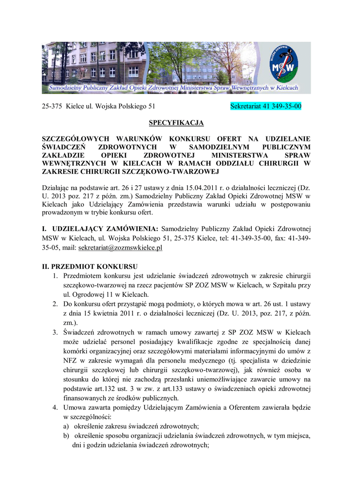 25-375 Kielce ul. Wojska Polskiego 51 Sekretariat 41 349-35-00 SPECYFIKACJA SZCZEGÓŁOWYCH WARUNKÓW KONKURSU OFERT NA UDZIELANIE ŚWIADCZEŃ ZDROWOTNYCH W SAMODZIELNYM PUBLICZNYM ZAKŁADZIE OPIEKI ZDROWOTNEJ MINISTERSTWA SPRAW WEWNĘTRZNYCH W KIELCACH W RAMACH ODDZIAŁU CHIRURGII W ZAKRESIE CHIRURGII SZCZĘKOWO-TWARZOWEJ Działając na podstawie art. 26 i 27 ustawy z dnia 15.04.2011 r. o działalności leczniczej (Dz. U. 2013 poz. 217 z późn. zm.) Samodzielny Publiczny Zakład Opieki Zdrowotnej MSW w Kielcach jako Udzielający Zamówienia przedstawia warunki udziału w postępowaniu prowadzonym w trybie konkursu ofert. I. UDZIELAJĄCY ZAMÓWIENIA: Samodzielny Publiczny Zakład Opieki Zdrowotnej MSW w Kielcach, ul. Wojska Polskiego 51, 25-375 Kielce, tel: 41-349-35-00, fax: 41-34935-05, mail: [email protected] II. PRZEDMIOT KONKURSU 1. Przedmiotem konkursu jest udzielanie świadczeń zdrowotnych w zakresie chirurgii szczękowo-twarzowej na rzecz pacjentów SP ZOZ MSW w Kielcach, w Szpitalu przy ul. Ogrodowej 11 w Kielcach. 2. Do konkursu ofert przystąpić mogą podmioty, o których mowa w art. 26 ust. 1 ustawy z dnia 15 kwietnia 2011 r. o działalności leczniczej (Dz. U. 2013, poz. 217, z późn. zm.). 3. Świadczeń zdrowotnych w ramach umowy zawartej z SP ZOZ MSW w Kielcach może udzielać personel posiadający kwalifikacje zgodne ze specjalnością danej komórki organizacyjnej oraz szczegółowymi materiałami informacyjnymi do umów z NFZ w zakresie wymagań dla personelu medycznego (tj. specjalista w dziedzinie chirurgii szczękowej lub chirurgii szczękowo-twarzowej), jak również osoba w stosunku do której nie zachodzą przesłanki uniemożliwiające zawarcie umowy na podstawie art.132 ust. 3 w zw. z art.133 ustawy o świadczeniach opieki zdrowotnej finansowanych ze środków publicznych. 4. Umowa zawarta pomiędzy Udzielającym Zamówienia a Oferentem zawierała będzie w szczególności: a) określenie zakresu świadczeń zdrowotnych; b) określenie sposobu organizacji udzielania świadczeń zdrowotnych, w tym miejsca, dni i godzin udzielania świadczeń zdrowotnych; c) określenie rodzajów i sposobu kalkulacji należności, jaką udzielający zamówienia przekazuje przyjmującemu zamówienie z tytułu realizacji zamówienia, a w przypadku ustalenia stawki ryczałtowej - określenie jej wysokości; d) ustalenie zasad rozliczeń oraz zasad i terminów przekazywania należności; e) ustalenie trybu przekazywania udzielającemu zamówienia informacji o realizacji przyjętego zamówienia; f) postanowienia dotyczące szczegółowych okoliczności uzasadniających rozwiązanie umowy za wypowiedzeniem oraz okres wypowiedzenia; g) zobowiązanie przyjmującego zamówienie do prowadzenia określonej sprawozdawczości statystycznej; h) minimalną liczbę osób udzielających określonych świadczeń zdrowotnych; i) przyjęcie przez przyjmującego zamówienie obowiązku poddania się kontroli przeprowadzanej przez udzielającego zamówienia, j) zobowiązanie przyjmującego zamówienie do zapewnienia prawa dostępu do bloku operacyjnego z obsadą anestezjologiczną. Udzielający zamówienie zapewnia Przyjmującemu zamówienie dostęp do bloku operacyjnego. III. MIEJSCE I CZAS UKAZANIA SIĘ OGŁOSZENIA: ogłoszenie zostało zamieszczone w dniu 15.12.2014 r. na stronie internetowej SP ZOZ MSW w Kielcach, tablicy ogłoszeń SP ZOZ MSW w Kielcach oraz wywieszone na tablicy ogłoszeń Świętokrzyskiej Izby Lekarskiej. IV. OBOWIĄZKI OFERENTA I SPOSÓB PRZYGOTOWANIA OFERTY: 1. Do konkursu mogą przystąpić podmioty wykonujące działalność leczniczą zgodnie z ustawą z dnia 15.04.2011 r. o działalności leczniczej (Dz. U. z 2013r., poz. 217 z późn. zm.). 2. Koszty przygotowania i złożenia oferty ponosi Oferent. 3. Oferta powinna być złożona w formie pisemnej w języku polskim wraz z wymaganymi załącznikami i dokumentami. 4. Wszystkie dokumenty oferty muszą być podpisane a kopie potwierdzone „za zgodność z oryginałem”. 5. Wszelkie zmiany lub poprawki w tekście oferty muszą być parafowane własnoręcznie przez Oferenta. 6. Ofertę wraz z załącznikami należy umieścić w zaklejonej nieprzezroczystej kopercie oznaczonej: „Oferta na udzielanie świadczeń zdrowotnych w ramach Oddziału Chirurgii w zakresie chirurgii szczękowo-twarzowej w SP ZOZ MSW w Kielcach. Nie otwierać przed 22.12.2014 r. do godz. 10.30”. Na kopercie należy umieścić dane identyfikujące Oferenta, tj. imię, nazwisko, adres. 7. Oferent może złożyć tylko jedną ofertę. V. WYMAGANE DOKUMENTY: 1. Oferenci złożą formularz ofertowy zawierający m.in.: a. imię i nazwisko, adres/ nazwa podmiotu oraz imię i nazwisko osoby udzielającej świadczeń w imieniu podmiotu - specjalisty w dziedzinie chirurgii szczękowej lub chirurgii szczękowo-twarzowej; b. zaświadczenie o prawie wykonywania zawodu podmiotu będącego osobą fizyczną lub osoby udzielającej świadczeń w imieniu podmiotu nie będącego osobą fizyczną specjalisty w dziedzinie chirurgii szczękowej lub chirurgii szczękowo-twarzowej; c. dokument potwierdzający specjalizację w dziedzinie chirurgii szczękowo-twarzowej/ chirurgii szczękowej (stosownie do Załącznika nr 3 poz. 12 do Rozporządzenia Ministra Zdrowia z dnia 29 sierpnia 2009 r. w sprawie świadczeń gwarantowanych z zakresu lecznictwa szpitalnego (Dz. U. 2013 poz. 1082, z późn. zm.); d. informacja odpowiadająca odpisowi aktualnemu z Krajowego Rejestru Sądowego albo Centralnej Ewidencji i Informacji o Działalności Gospodarczej; e. zaświadczenie o wpisie do rejestru indywidualnych lub grupowych specjalistycznych praktyk lekarskich albo podmiotów wykonujących działalność leczniczą; f. oświadczenie o posiadaniu ubezpieczenia zgodnego z rozporządzeniem Ministra Finansów z dn. 22.12.2011r. w sprawie obowiązkowego ubezpieczenia odpowiedzialności cywilnej podmiotu wykonującego działalność leczniczą (Dz. U. z 2011 r., poz. 1729), w wysokośc