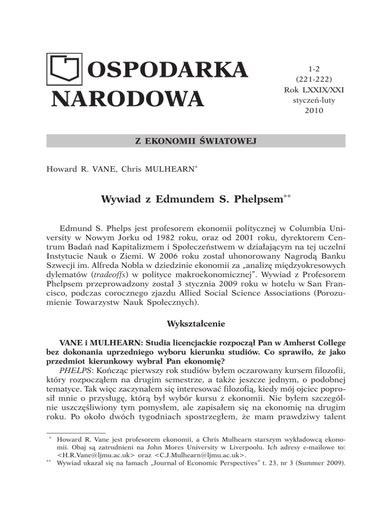 OSPODARKA NARODOWA 1-2 (221-222) Rok LXXIX/XXI styczeń-luty 2010 Z EKONOMII ŚWIATOWEJ Howard R. VANE, Chris MULHEARN* Wywiad z Edmundem S. Phelpsem** Edmund S. Phelps jest profesorem ekonomii politycznej w Columbia University w Nowym Jorku od 1982 roku, oraz od 2001 roku, dyrektorem Centrum Badań nad Kapitalizmem i Społeczeństwem w działającym na tej uczelni Instytucie Nauk o Ziemi. W 2006 roku został uhonorowany Nagrodą Banku Szwecji im. Alfreda Nobla w dziedzinie ekonomii za „analizę międzyokresowych dylematów (tradeoffs) w polityce makroekonomicznej”. Wywiad z Profesorem Phelpsem przeprowadzony został 3 stycznia 2009 roku w hotelu w San Francisco, podczas corocznego zjazdu Allied Social Science Associations (Porozumienie Towarzystw Nauk Społecznych). Wykształcenie VANE i MULHEARN: Studia licencjackie rozpoczął Pan w Amherst College bez dokonania uprzedniego wyboru kierunku studiów. Co sprawiło, że jako przedmiot kierunkowy wybrał Pan ekonomię? PHELPS: Kończąc pierwszy rok studiów byłem oczarowany kursem filozofii, który rozpocząłem na drugim semestrze, a także jeszcze jednym, o podobnej tematyce. Tak więc zaczynałem się interesować filozofią, kiedy mój ojciec poprosił mnie o przysługę, którą był wybór kursu z ekonomii. Nie byłem szczególnie uszczęśliwiony tym pomysłem, ale zapisałem się na ekonomię na drugim roku. Po około dwóch tygodniach spostrzegłem, że mam prawdziwy talent * Howard R. Vane jest profesorem ekonomii, a Chris Mulhearn starszym wykładowcą ekonomii. Obaj są zatrudnieni na John Mores University w Liverpoolu. Ich adresy e-mailowe to: <[email protected]> oraz <[email protected]>. ** Wywiad ukazał się na łamach „Journal of Economic Perspectives” t. 23, nr 3 (Summer 2009). GOSPODARKA NARODOWA Nr 1-2/2010 do tego przedmiotu. Odkryłem, że ekonomia jest tak samo interesująca jak filozofia, a przy tym ma jeszcze aspekt praktyczny. Nie w pełni zrozumiałem ten przedmiot, więc zapisałem się na kolejny kurs. Długo miałem problem z uchwyceniem relacji mikroekonomii do makroekonomii (śmiech). Lubię żartować, że poszedłem na studia magisterskie, aby dotrzeć do sedna tej relacji. Po czterech czy pięciu latach na studiach zdałem sobie sprawę z tego, że wciąż nie znam odpowiedzi. Dlatego też postanowiłem: dobrze, w takim razie spróbuję rozwiązać ten problem sam. VANE i MULHEARN: Ukończywszy Amherst College z tytułem licencjata w 1955 roku, podjął Pan studia podyplomowe w Yale University, gdzie obronił Pan doktorat w roku 1959. Którzy nauczyciele akademiccy z Yale wywarli na Pana szczególny wpływ, byli najbardziej inspirujący? PHELPS: Nie jestem pewien, w jakiej kolejności ich wymienić, ale prawdopodobnie William Fellner i James Tobin byli jednymi z tych, którzy wywarli na mnie największy wpływ. Bardzo zaimponowali mi Thomas Schelling, u którego zdawałem jeden kurs i którego udało mi się poznać osobiście, oraz Tjalling Koopmans. Byli też inni, z którymi się zetknąłem: Henry Wallace czy Robert Triffin, który na swój sposób również mi imponował. To był niesamowity okres na Yale. Prawdziwy złoty wiek dla Yale, jeżeli chodzi o ekonomię – a można jeszcze wymienić takie nazwiska, jak Gerard Debreu, który przybywał tam kilka lat czy Jacob Marshak, który wyjechał, gdy byłem na pierwszym roku. To był niesamowity okres. Teoria wzrostu VANE i MULHEARN: Po roku pracy jako ekonomista w RAND Corporation w Santa Monica, wrócił Pan do Yale w 1960 i pozostał tam – z wyjątkiem rocznego okresu spędzonego na MIT (1962-1963) – do roku 1966. W tej początkowej fazie kariery akademickiej koncentrował się Pan na teorii wzrostu. Co przyciągnęło Pana do tego tematu? W jakim stopniu pozostawał Pan pod wpływem prac Roberta Solowa [1956, 1957] i Trevora Swana [1956]? PHELPS: Bez wątpienia prace te bardzo mi zaimponowały. Miałem przyjemność poznać Roberta Solowa podczas roku, który spędziłem na MIT. Trevora Swana poznałem po powrocie do Yale, gdzie przebywał przez rok. Tak więc zafascynowałem się tym modelem wzrostu – badałem go, poszerzałem, próbowałem go nawet modyfikować. Z drugiej strony, to był okres w historii Stanów Zjednoczonych, kiedy niepokojono się o adekwatność stopy wzrostu. Wydawało się nam, że wzrost produktu potencjalnego stopniowo spadał w latach pięćdzie Robert Solow [1956, 1957] i Trevor Swan [1956] niezależnie od siebie rozwinęli neoklasyczny model wzrostu, fundamentalnie zmieniając podejście ekonomistów do badań nad wzrostem gospodarczym. Model Solowa-Swana jest oparty na neoklasycznej zagregowanej funkcji produkcji, która cechuje się stałymi przychodami ze skali, malejącymi przychodami z czynników produkcji oraz dobrą substytucją substytucji pomiędzy czynnikami – i skupia się na bezpośrednich przyczynach wzrostu gospodarczego. Howard R. Vane, Chris Mulhearn, Wywiad z Edmundem S. Phelpsem siątych i na początku kolejnej dekady. Nie mam pojęcia, co skorygowane dane pokazałyby teraz, ale takie mieliśmy wtedy wrażenie. Tak więc, nawet gdyby nie było jakiegoś Solowa czy Swana, najprawdopodobniej zainteresowałbym się wpływem, jaki na wzrost gospodarczy wywierają inwestycje w kapitał trwały, edukacja czy badania i rozwój. VANE i MULHEARN: Pański najbardziej znany artykuł na temat teorii wzrostu, The Golden Rule of Accumulation: A Fable for Growthmen został opublikowany w „American Economic Review” w 1961 roku [patrz również: Phelps, 1965]. Czy tak ważny wkład w literaturę dotyczącą wzrostu w tak wczesnej fazie kariery naukowej zaskoczył Pana? PHELPS: Wśród ekonomistów mojej generacji nie byłem ani wcześniakiem, ani badaczem najbardziej utalentowanym. Robert Mundell pisał dużo poważniejsze artykuły w 1960 i 1961, a Amartya Sen napisał wspaniały tekst pt. On Optimising the Rate of Saving (O optymalizacji stopy oszczędzania), który został opublikowany w „