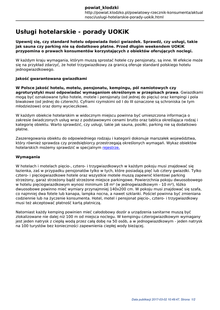 powiat_klodzki http://powiat.klodzko.pl/powiatowy-rzecznik-konsumenta/aktual nosci/uslugi-hotelarskie-porady-uokik.html Usługi hotelarskie - porady UOKiK Upewnij się, czy standard hotelu odpowiada ilości gwiazdek. Sprawdź, czy usługi, takie jak sauna czy parking nie są dodatkowo płatne. Przed długim weekendem UOKiK przypomina o prawach konsumentów korzystających z obiektów oferujących noclegi. W każdym kraju wymagania, którym muszą sprostać hotele czy pensjonaty, są inne. W efekcie może się na przykład zdarzyć, że hotel trzygwiazdkowy za granicą oferuje standard polskiego hotelu jednogwiazdkowego. Jakość gwarantowana gwiazdkami W Polsce jakość hotelu, motelu, pensjonatu, kempingu, pól namiotowych czy agroturystyki musi odpowiadać wymaganiom określonym w przepisach prawa. Gwiazdkami mogą być oznakowane tylko hotele, motele i pensjonaty (od jednej do pięciu) oraz kempingi i pola biwakowe (od jednej do czterech). Cyframi rzymskimi od I do III oznaczone są schroniska (w tym młodzieżowe) oraz domy wycieczkowe. W każdym obiekcie hotelarskim w widocznym miejscu powinna być umieszczona informacja o zakresie świadczonych usług wraz z podstawowymi cenami brutto oraz tablica określająca rodzaj i kategorię obiektu. Warto sprawdzić, czy usługi, takie jak sauna, posiłki, parking nie są dodatkowo płatne. Zaszeregowania obiektu do odpowiedniego rodzaju i kategorii dokonuje marszałek województwa, który również sprawdza czy przedsiębiorcy przestrzegają określonych wymagań. Wykaz obiektów hotelarskich możemy sprawdzić w specjalnym rejestrze. Wymagania W hotelach i motelach pięcio-, cztero- i trzygwiazdkowych w każdym pokoju musi znajdować się łazienka, zaś w przypadku pensjonatów tylko w tych, które posiadają pięć lub cztery gwiazdki. Tylko cztero- i pięciogwiazdkowe hotele oraz wszystkie motele muszą zapewnić klientowi parking strzeżony, garaż strzeżony bądź strzeżone miejsce parkingowe. Powierzchnia pokoju dwuosobowego w hotelu pięciogwiazdkowym wynosi minimum 18 m² (w jednogwiazdkowym - 10 m²), łóżko dwuosobowe powinno mieć wymiary przynajmniej 140x200 cm. W pokoju musi znajdować się szafa, co najmniej dwa fotele lub kanapa, lampka nocna, a nawet szklanki. Pościel powinna być zmieniana codziennie lub na życzenie konsumenta. Hotel, motel i pensjonat pięcio-, cztero- i trzygwiazdkowy musi też akceptować płatność kartą płatniczą. Natomiast każdy kemping powinien mieć całodobowy dozór a urządzenia sanitarne muszą być zlokalizowane nie dalej niż 100 m od miejsca noclegu. W kempingu czterogwiazdkowym wymagany jest jeden natrysk z ciepłą wodą przez całą dobę na 50 osób, a w jednogwiazdkowym - jeden natrysk na 100 turystów bez konieczności zapewnienia ciepłej wody bieżącej. Data publikacji 2017-03-02 10:49:47, Strona: 1/2 powiat_klodzki http://powiat.klodzko.pl/powiatowy-rzecznik-konsumenta/aktual nosci/uslugi-hotelarskie-porady-uokik.html Uwaga na nazwę Ochronie prawnej podlegają nazwy, takie jak hotel, motel, pensjonat. Każda inna powinna budzić podejrzenia - z praktyki UOKiK wynika, że przedsiębiorcy używają zdrobnień, przyrostków, niepełnych nazw (np. hotelik, motelux) wtedy, gdy ich obiekty nie spełniają określonych w przepisach wymagań (np. sanitarnych lub przeciwpożarowych) i nie posiadają odpowiedniego zezwolenia marszałka województwa. Aby przyciągnąć klientów, świadomie przekształcają nazwy, oferując noclegi według dowolnie ustalonego standardu. Reklamacja Jeżeli pokój różni się od zamówionego lub hotel położony jest na przykład dalej od morza niż zapewniał sprzedawca, konsumentowi przysługuje reklamacja. Kiedy konsument samodzielnie rezerwuje nocleg w obiekcie hotelarskim i nie jest zadowolony z usługi, może dochodzić swoich praw na podstawie Kodeksu Cywilnego. W takiej sytuacji powinno się jak najszybciej zgłosić nieprawidłowości właścicielowi obiektu i wyznaczyć termin na naprawę usterki, wymianę wyposażenia, czy zamianę pokoju. Jeżeli przedsiębiorca nie usunie wady w wyznaczonym przez nas czasie lub nie jest to możliwe z innych przyczyn - mamy prawo żądać zmniejszenia ceny, a w ostateczności odstąpić od umowy i zażądać zwrotu zapłaconej kwoty. Odstąpienie od umowy jest możliwe, jeśli wada jest istotna. Zaliczka czy zadatek Uważajmy czy wpłacamy zadatek czy zaliczkę. W przypadku niewykonania umowy z winy przedsiębiorcy (np. rezerwacja nie została dokonana) wpłacona zaliczka zostanie nam zwrócona. Jeśli natomiast wpłaciliśmy zadatek, to wykonawca zwraca go w podwójnej wysokości. Pomoc dla konsumentów Bezpłatna pomoc w razie problemów z reklamacją usługi hotelarskiej: infolinia 800 889 866, rzecznicy konsumentów, Inspekcja Handlowa, Federacja Konsumentów, [email protected]. Więcej informacji o prawach, jakie ci przysługują znajdziesz na stronie www.prawakonsumenta.uokik.gov.pl Źródło: www.uokik.gov.pl Data publikacji 2017-03-02 10:49:47, Strona: 2/2