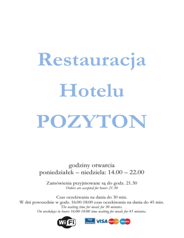 Restauracja Hotelu POZYTON godziny otwarcia poniedziałek – niedziela: 14.00 – 22.00 Zamówienia przyjmowane są do godz. 21.30 Orders are accepted for hours 21.30 Czas oczekiwania na dania do 30 min. W dni powszednie w godz. 16:00-18:00 czas oczekiwania na dania do 45 min. The waiting time for meals for 30 minutes. On weekdays in hours 16:00-18:00 time waiting for meals for 45 minutes. Przystawki Starters /100 g/ Tatar z polędwicy wołowej owinięty szynką szwarcwaldzką 11,00 zł Raw beef wrapped black forest ham Śledź marynowany z cebulą i jabłkiem 8,00 zł Marinated with onion and apple Krucha babeczka na ciepło ze szpinakiem i łososiem 9,00 zł Fragile bun heatwith spinach and salmon Przystawki podawane z grzanką. Starters served with toast. Zupy Soups /250 ml/ Pomidorowo-paprykowa z prażonymi pestkami dyni 6,50 zł Tomato-paprikawith roasted pumpkin seeds Rosół z makaronem 5,00 zł Chicken soup with noodles Żurek kujawski 6,50 zł Kuyavia soup Borowikowa z białym winem i ziołami z groszkiem ptysiowym 7,50 zł Mushroom soup with white wine and herbs with puff pastry croutons Sałaty Salads /200 g/ Grecka W 11,00 zł Greek Z grillowanym kurczakiem 12,00 zł From grilled chicken Ze smażonym łososiem 14,00 zł With fried salmon Z wędzonym łososiem 15,00 zł With smoked salmon Sałaty podawane z grzanką. Salads served with toast. W – danie wegetariańskie W – vegetarian dish Dania rybne Fishs Łosoś a’la róża z tymiankiem i jajkiem w koszulce na szpinaku z sosem cytrynowym serwowany z gnocchi 29,00 zł Salmon a'la rose with thyme and poached egg, spinach with lemon sauce served with gnocchi /120 g/ Dorsz panierowany z frytkami i surówką z białej kapusty 22,00 zł Breaded cod and chips and white cabbage salad /150 g/ Sandacz smażony z ziemniakami opiekanymi i smażonymi warzywami 33,00 zł Fried perch with roasted potatoes and stir-fried vegetables /120 g/ Możliwość zmiany dodatku do dań. The ability to change an addition to dishes. Dania mięsne Meat dishes Kotlet schabowy podawany z ziemniakami gotowanymi i kapustą zasmażaną 18,00 zł Pork chop served with boiled potatoes and cabbage /150 g/ Karkówka grillowana z opiekanymi ziemniakami i sałatką lodową 19,00 zł Chuck steak grilled with baked potatoes and salad ice /130 g/ Polędwiczki w sosie kaparowym podawane z gnocchi i buraczkami 25,00 zł Tenderloin with caper sauce served with gnocchi and beetroot /130 g/ Filet z kaczki z rozmarynem na sosie z czerwonego wina serwowany z gnocchi i czerwoną kapustą 28,00 zł Duck fillet with rosemary on red wine sauce served with gnocchi and red cabbage /120 g/ Możliwość zmiany dodatku do dań. The ability to change an addition to dishes. Dodatki do dań 5,00 zł Additions to dishes Gnocchi /120 g/ Frytki Chips /100 g/ Ziemniaki opiekane Baked potatoes /100 g/ Ziemniaki z wody Boiled potatoes /200 g/ Placki ziemniaczane Potato pancakes /3 szt./ Krążki cebulowe Onion rings /100 g/ Warzywa gotowane Boiled vegetables /200 g/ Warzywa smażone Fried vegetables /100 g/ Czerwona kapusta Red cabbage /120 g/ Sałatka lodowa Iceberg salad /150 g/ Kapusta zasmażana Fried cabbage /200 g/ Surówka z białej kapusty Coleslaw /150 g/ Buraczki Beets /120 g/ Sosy 3,00 zł Sauces Tzatziki /50 g/ Ketchup Czosnkowy 1000 wysp Garlic 1000 islands Naleśniki Pancakes /2 szt./ Z prażonymi jabłkami W 7,00 zł With roasted apples Z mięsem mielonym i warzywami 9,00 zł With minced meat and vegetables Ze szpinakiem i fetą W 9,00 zł With spinach and feta cheese Z kaszą gryczaną, kurczakiem i ziołami 9,00 zł With buckwheat, chicken and herbs W – danie wegetariańskie W – vegetarian dish Desery Desserts /150 g/ Lody na gorących malinach 9,00 zł Ice cream on hot raspberries Wiśnie po parysku z lodami 9,00 zł Cherries Parisian ice cream Babeczka z kajmakiem, prażonymi migdałami i czekoladą 9,00 zł Bun with butterscotch, roasted almonds and chocolate Tiramisu 11,00 zł Kawa i czekolada Coffee and chocolate Espresso 6,00 zł Espresso doppio 10,00 zł podwójne espresso Espresso macchiato 6,50 zł espresso z odrobiną mleka Cappuccino 7,00 zł espresso z dodatkiem spienionego mleka Caffè latte 7,50 zł espresso z dużą ilością gorącego mleka Latte macchiato 8,00 zł espresso z dużą ilością spienionego mleka Kawa po wiedeńsku 8,50 zł espresso z gorącym mlekiem i bitą śmietaną posypaną czekoladą Viennese coffee Kawa czarna z ekspresu 5,50 zł Black Express Coffee Kawa czarna z ekspresu z mlekiem 6,00 zł White Express Coffee Kawa parzona 5,50 zł Brewed coffee Kawa mrożona 8,00 zł kawa z lodami i bitą śmietaną Iced coffee with ice carem and cream Gorąca czekolada z bitą śmietaną 7,00 zł Hot chocolate Herbata Tea Dzbanek 0,4 l 6,00 zł Tea pot Earl Grey Wellness Fitness Tea Mieszanka czarnych herbat z Chin i Indii aromatyzowana bergamotką. Orzeźwiająca herbatka z liści krzewu Rooibos, kopru włoskiego, listków jeżyn, palczatki cytrynowej, pomarańczy, mięty, anyżu i cynamonu. Assam Bari Lekko słodkawa, korzenna, rasowa i ekstrawagancka. Fruity Camomile Oriental Oolong Wyśmienity napar rumianku z miłą nutką skórki pomarańczy. Delikatny Oolong z odcieniem soczystych truskawek i ananasów płynącym z owoców Lulo i daktyli. Darjeeling Summer Gold Lekki kwiatowy i bogaty aromat. Spring Dajeeling Jasna, lekko słodkawa herbata o delikatnym kwiatowym zapachu. Sweet Berries Delikatna kompozycja złożona z truskawek, malin jabłek, hibiskusa, dzikiej róży, listków jeżyn i pomarańczy. Green Dragon Ręcznie zwijane delikatne listki z wiosennego zbioru nadają tej ekskluzywnej herbacie odświeżający smak oraz przyjemnie delikatną cierpkość. Filiżanka 0,2 l 3,50 zł Cup Earl Grey Zielona Najwyższej jakości herbata będąca oryginalną mieszanką czarnych herbat z olejkiem bergamotki. Charakteryzuje się delikatnym smakiem i relaksującym aromatem. Green Lekki smak bez goryczy został uzyskany dzięki starannie wyse