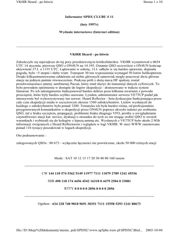 VK0IR Heard - po bitwie Strona 1 z 10 Informator SPDX CLUBU # 11 (luty 1997r) Wydanie internetowe (Internet edition) VK0IR Heard - po bitwie Zako czy o si najwi ksze do tej pory przedsiewzi cie krótkofalarskie. VK0IR wystartowa o 0654 UTC 14 stycznia, pierwsze QSO z ON4UN na 14.195. Ostatnie QSO oczywi cie z ON4UN ko cz c aktywno 27.I. o 1155 UTC. L dowanie w sobot , 12.I. odby o w si bardzo sprawnie, dopisa a pogoda, by o +5 stopni i s aby wiatr. Transport 30 ton wyposa enia wymaga 50 lotów helikopterem. Dzi ki kilkusetmetrowemu oddaleniu od siebie g ównych satnowisk mog y pracowa dwie g ówne stacje na jednym pa mie równocze nie. Podczas prób z du moc HF spalony zosta przedwzmacniacz anteny satelitarnej Pacsat, który mia s do transmisji danych cyfrowych. To by o powodem opó nienia w dost pie do logów ekspedycji - dostosowano w trakcie system Inmarsat. Po ich udost pnieniu funkcjonowa bardzo dobrze poza kilkoma awariami z powodu przeci , które by y bardzo szybko usuwane. Lyndon, administrator serwera VE7TCP poda jak intensywnie by wykorzystywany ten serwer. Heard Reflector - lista dyskusyjna funkcjonuj ca przez ca y czas ekspedycji mia a w szczytowym okresie 1560 subskrybentów. Listów wys anych do ka dego z subskrybentów by o ponad 1200. Tematyka ich by a bardzo ró na, od profesjonalnie przygotowanych komunikatów o ekspedycji przez ON4UN poprzez okrzyki rado ci po zrobieniu QSO, al o braku szcz cia, propagacji, problemie braku drugiego VFO, pro by o uwzgl dnianie cz stotliwo ci stacji kat. novice, dyskusji o stosunku do tych co nie mog c zrobi QSO w swoich warunkach i wybierali si do kolegów z lepsz anten etc. Wys anych z VE7TCP by o oko o 2.9Gb informacji zwi zanych z Heard Reflectorem i wgl dem w logi VK0IR. W sieci WWW zanotowano ponad 116 tysi cy poszukiwa w logach ekspedycji. Oto podsumowanie : zalogowanych QSOs : 80 673 - wy cznie czno ci nie powtórzone, oko o 50 000 ró nych stacji Mode : SAT 10 12 15 17 20 30 40 80 160 razem -----------------------------------------------------------------------------------------------------------CW 144 110 574 5362 5149 11977 7111 11079 2789 1241 45536 SSB 490 118 174 4456 4542 16318 0 4479 2504 0 33081 RTTY 0 0 0 0 0 2056 0 0 0 0 2056 -----------------------------------------------------------------------------------------------------------Ogó em : 634 228 748 9818 9691 30351 7111 15558 5293 1241 80673 file://D:\Moje%20dokumenty\memo_pzk\SPDXC\www.sp5pbe.waw.pl\SPDXC\Biul... 2003-10-04 VK0IR Heard - po bitwie Strona 2 z 10 czno ci z Eu : Mode SAT 10 12 15 17 20 30 40 80 160 razem --------------------------------------------------------------------------------------------------------------------------CW 46 22 233 2949 3082 5350 3217 4422 1287 750 21358 SSB 298 14 93 2859 2046 5749 0 1764 933 0 13756 RTTY 0 0 0 0 0 732 0 0 0 0 732 --------------------------------------------------------------------------------------------------------------------------Ogó em: 344 36 326 5808 5128 11831 3217 6186 2220 750 35846 Podkre li nale y, e wyniki te osi gni to podczas okresu minimum aktywno ci S ca i zwi zanej z tym propagacji. Przed wyjazdem sami organizatorzy w tpili w osi gni cie wi kszej ilo ci czno ci na 160 m, niektóre stowarzyszenia odmówi y wsparcia finansowego motywuj c to zbyt ab propagacj by wyprawa si uda a. Najwi cej czno ci - 19 QSOs zaliczy JA5EXW : na wszystkich pasmach wszystkimi rodzajami emisji których u ywali z wyj tkiem telefonu komórkowego i 2 m FM. Nast pni byli równie japo czycy : JA9AVA, JA3REK, JA3MHV, JA2XW i JA2FJP po 18 QSOs. Po JAs A71CW zrobi 17 QSOs (bez SAT), OH3SR, OH2BU i IK7MCJ 16 QSOs (bez SAT i 10 m SSB), IK5PWJ i I0JX 16 QSOs. Wyra nie wida kto mia najlepsz propagacj na 10 m. Ciekaw jestem jak na tym tle wygl daj nasze stacje - prosz o informacje, ch tnie zamie cimy. Karty QSL nale y wysy do : INDEXA c/o W4FRU P.O.Box 5127 Suffolk. Va. 23435 USA Lepiej nie wysy innych kart razem do W4FRU, których jest on mnagerem. To mo e opó ni otrzymanie karty VK0IR nawet do 6 miesi cy. André, HB9BIG twórca programu prognozuj cego propagacj zamieszcza map wiata z aktualn propagacj pod adresem http://www.access.ch/agtim/hfmap/vk0.html. My le, e warto równie dla innych ekspedycji zagl da tam w katalog oczko wy ej. Podkre li nale y wietnie funkcjonuj cy system stacji pilotuj cych, który zapewni sprz enie zwrotne do wyprawy a zw aszcza bardzo du y wk ad pracy Johna, ON4UN. Przygotowa on 92 komunikaty do Heard Reflectora, dzi ki którym ca y czas dost pna by a aktualna informacja o sytuacji na wyspie i w eterze. John poda , e sprawy VK0IR zajmowa y mu do 18 godzin dziennie. file://D:\Moje%20dokumenty\memo_pzk\SPDXC\www.sp5pbe.waw.pl\SPDXC\Biul... 2003-10-04 VK0IR Heard - po bitwie Strona 3 z 10 Dick, WC1M opracowa list dziewi ciu przykaza dla wo aj cych ekspedycj - ma to charakter tak uniwersalny, e zamie cimy je nast pnym razem. OH2BU koordynator i OH7RF QSL manager wyprawy 4J1FS w 1992 przekazali pozdrowienia dla ekipy VK0IR bij cej ich dotychczasowy najlepszy wynik ekspedycji w historii. Przedstawili równie zestawienie wyników najwi kszyc ekspedycji DX-owych. To ciekawe zestawienie zamie cimy równie nast pnym razem. Do wiadcze z wyprawy jest tak wiele, e analiza i wracanie do nich b dzie mia o miejsce jeszcze wiele razy. Elementy wspó czesnego przesy u informacji zmieni y wyra nie komfort pracy i uczestników ekspedycji i wo aj cych ich krótkofalowców na ca ym wiecie. Nie zmieni o si to co najwa niejsze - czno DX-owa na falach krótkich oraz to co serwuje natura w takich rejonach, trudne warunki atmosferyczne i mimo wspó czesnej techniki niebezpiecze stwa oceanicznej podró y. Przyznam, e dla mnie bardziej fascynuj ce by y informacje o organizacji, przygotowaniach do wyprawy i ledzenie rozwoju sytuacji podczas pracy. By o to ciekawsze ni same czno ci. Andrzej SP6ECA Informacje DX-owe 5X Uganda Gus, 5X1D powróci do Ugandy pod koniec stycznia. B dzie aktywny g ównie na 2 m EME i 6m : 50.150 MHz mi d