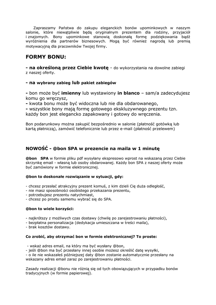 Zapraszamy Państwa do zakupu eleganckich bonów upominkowych w naszym salonie, które niewątpliwie będą oryginalnym prezentem dla rodziny, przyjaciół i znajomych. Bony upominkowe stanowią doskonałą formę podziękowania bądź wyróżnienia dla partnerów biznesowych. Mogą być również nagrodą lub premią motywacyjną dla pracowników Twojej firmy. FORMY BONU: - na określoną przez Ciebie kwotę - do wykorzystania na dowolne zabiegi z naszej oferty. - na wybrany zabieg lub pakiet zabiegów - bon może być imienny lub wystawiony in blanco – sam/a zadecydujesz komu go wręczysz, - kwota bonu może być widoczna lub nie dla obdarowanego, - wszystkie bony mają formę gotowego ekskluzywnego prezentu tzn. każdy bon jest elegancko zapakowany i gotowy do wręczenia. Bon podarunkowy można zakupić bezpośrednio w salonie (płatność gotówką lub kartą płatniczą), zamówić telefonicznie lub przez e-mail (płatność przelewem) NOWOŚĆ - @bon SPA w prezencie na maila w 1 minutę @bon SPA w formie pliku pdf wysyłany ekspresowo wprost na wskazaną przez Ciebie skrzynkę email - własną lub osoby obdarowanej. Każdy bon SPA z naszej oferty może być zamówiony w formie elektronicznej. @bon to doskonałe rozwiązanie w sytuacji, gdy: - chcesz przesłać atrakcyjny prezent komuś, z kim dzieli Cię duża odległość, nie masz sposobności osobistego przekazania prezentu, potrzebujesz prezentu natychmiast, chcesz po prostu samemu wybrać się do SPA. @bon to wiele korzyści: - najkrótszy z możliwych czas dostawy (chwilę po zarejestrowaniu płatności), - bezpłatna personalizacja (dedykacja umieszczana w treści maila), - brak kosztów dostawy. Co zrobić, aby otrzymać bon w formie elektronicznej? To proste: - wskaż adres email, na który ma być wysłany @bon, - jeśli @bon ma być przesłany innej osobie możesz określić datę wysyłki, - o ile nie wskazałeś późniejszej daty @bon zostanie automatycznie przesłany na wskazany adres email zaraz po zarejestrowaniu płatności. Zasady realizacji @bonu nie różnią się od tych obowiązujących w przypadku bonów tradycyjnych (w formie papierowej). ZAMÓWIENIA PRZYJMUJEMY NA: nasz adres email: [email protected] informacje pod numerem tel. 34 372 07 11 Bony upominkowe zachowują swoją ważność przez okres dwóch miesięcy (z wyjątkiem promocji) od daty ich wykupienia i nie podlegają zwrotowi! Bony zakupione na ofertę objętą Promocjami są ważne przez okres dwóch tygodni od dnia wystawienia Bonu. Zapraszamy do zakupu upominkowych bonów!!! Uwaga!!!!! Bony Upominkowe, których data ważności uległa przedawnieniu nie będą realizowane. Według regulaminu wewnętrznego obdarowany może przedłużyć ważność Bonu jedynie w przypadku, kiedy wykupi dodatkową usługę w Salonie spa za kwotę co najmniej 100 zł.