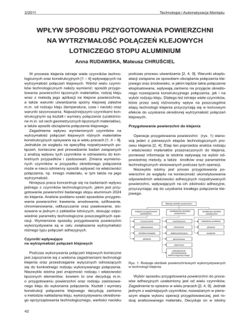 2/2011 Technologia i Automatyzacja Montażu WPŁYW SPOSOBU PRZYGOTOWANIA POWIERZCHNI NA WYTRZYMAŁOŚĆ POŁĄCZEŃ KLEJOWYCH LOTNICZEGO STOPU ALUMINIUM Anna Rudawska, Mateusz chruściel W procesie klejenia istnieje wiele czynników technologicznych oraz konstrukcyjnych [1 – 4] wpływających na wytrzymałość połączeń klejowych. Wśród wielu czynników technologicznych należy wymienić: sposób przygotowania powierzchni łączonych materiałów, rodzaj kleju wraz z metodą jego aplikacji na klejone powierzchnie, a także warunki utwardzania spoiny klejowej zależne m.in. od rodzaju kleju (temperatura, czas i nacisk) oraz warunki sezonowania. Najważniejszymi czynnikami konstrukcyjnymi są kształt i wymiary połączenia (uzależnione m.in. od cech geometrycznych łączonych materiałów), a także sposób obciążenia połączenia klejowego. Zagadnienia wpływu wymienionych czynników na wytrzymałość połączeń klejowych różnych materiałów konstrukcyjnych opisywane są w wielu pracach [1, 4 – 9]. Jednakże ze względu na specyfikę rozpatrywanych połączeń, konieczne jest prowadzenie badań związanych z analizą wpływu tych czynników w odniesieniu do konkretnych przypadków i zastosowań. Zmiana wymienionych czynników w przypadku określonego połączenia może w nieco odmienny sposób wpływać na właściwości połączenia, np. innego materiału, w tym także na jego wytrzymałość. Niniejsza praca koncentruje się na badaniach wpływu jednego z czynników technologicznych, jakim jest przygotowanie powierzchni badanego stopu aluminium 2024 do klejenia. Analizie poddano sześć sposobów przygotowania powierzchni: trawienie, anodowanie, szlifowanie, chromianowanie, odtłuszczanie oraz piaskowanie, stosowane w jednym z zakładów lotniczych, stosując odpowiednie parametry technologiczne poszczególnych operacji. Wymienione sposoby przygotowania powierzchni wykorzystywane są w celu zwiększenia wytrzymałości różnego typu połączeń adhezyjnych. podczas procesu utwardzania [2, 4, 9]. Warunki eksploatacji związane ze sposobem obciążenia połączenia klejowego oraz środowisko, w jakim będzie takie połączenie eksploatowane, wpływają zarówno na przyjęcie określonego rozwiązania konstrukcyjnego połączenia, jak i na wybór rodzaju kleju. Dlatego też istnieje wiele czynników, które przez swój różnorodny wpływ na poszczególne etapy technologii klejenia przyczyniają się w końcowym efekcie do uzyskania określonej wytrzymałość połączeń klejowych. Przygotowanie powierzchni do klejenia Operacje przygotowania powierzchni (rys. 1) stanowią jeden z pierwszych etapów technologicznych procesu klejenia [2, 4]. Etap ten poprzedza analiza rodzaju i właściwości materiałów przeznaczonych do klejenia, ponieważ informacje te istotnie wpływają na wybór odpowiedniej metody, a także środków oraz parametrów technologicznych stosowanych podczas tych operacji. Niezwykle istotny jest proces przygotowania powierzchni ze względu na konieczność ukonstytuowania odpowiednich właściwości adhezyjnych rozpatrywanych powierzchni, wpływających na ich zdolności adhezyjne, przyczyniając się do uzyskania trwałego połączenia klejowego. Czynniki wpływające na wytrzymałość połączeń klejowych Podczas wykonywania połączeń klejowych konieczne jest zapoznanie się z wieloma zagadnieniami technologii klejenia oraz przestrzeganie wytycznych odnoszących się do konkretnego rodzaju wykonywanego połączenia. Niezwykle istotna jest znajomość rodzaju i właściwości łączonych elementów; bowiem to one decydują m.in. o przygotowaniu powierzchni oraz rodzaju zastosowanego kleju do wykonania połączenia. Kształt i wymiary konstrukcji połączenia klejowego decydują zarówno o metodzie nakładania kleju, wykorzystywaniu określonego oprzyrządowania technologicznego, wartości nacisku 42 Rys. 1. Rodzaje obróbek powierzchniowych wykorzystywanych w technologii klejenia Wybór sposobu przygotowania powierzchni do procesów adhezyjnych uzależniony jest od wielu czynników. Zagadnienie to opisano w wielu pracach [2, 4, 9]. Jednak jednym z ważniejszych czynników, rozważanym w pierwszym etapie wyboru operacji przygotowawczej, jest rodzaj analizowanego materiału. Decyduje on w istotny Technologia i Automatyzacja Montażu 2/2011 sposób o przyjęciu odpowiedniego sposobu przygotowania powierzchni, a także sposobu jego aplikacji. W odniesieniu do stopów aluminium można spotkać zalecenia dotyczące zastosowania sposobu przygotowania powierzchni. Zaleca się stosowanie szlifowania, obróbki strumieniowo-ściernej, obróbki chemicznej (trawienie kwaśne lub alkaliczne), obróbki elektrochemicznej (anodowanie) i innych [2, 4, 7]. Badania doświadczalne Badania doświadczalne polegały na wykonaniu połączeń klejowych blach ze stopu aluminium, którego powierzchnie poddano różnym sposobom przygotowania. Dokonano oceny struktury powierzchni przez pomiary wybranych parametrów chropowatości oraz wykonanie profilogramów powierzchni. Wykonano pomiary siły niszczącej połączenia, a następnie określono wytrzymałość badanych połączeń. •• Charakterystyka połączeń klejowych Do badań wykorzystano połączenia klejowe jednozakładkowe wykonane ze stopu aluminium 2024 obciążone na ścinanie, którego schemat zamieszczono na rys. 2. Rys. 2. Kształt połączeń klejowych wykorzystanych w badaniach Wymiary połączenia klejowego były następujące: długość blach: l = 100 mm, szerokość blach: b = 25 mm, grubość blach: g = 1 mm, długość zakładki połączenia klejowego: lz = 14 mm. Do badań wykorzystano klej epoksydowy dwuskładnikowy Loctite Hysol 9484, w stosunku wagowym 1:1. Klej ten był utwardzony jednostopniowo, w temperaturze otoczenia w ciągu 48 godzin. Podczas sieciowania połączenia obciążano naciskiem 0,2 MPa. –– –– –– –– •• Sposoby przygotowania powierzchni W przeprowadzonych badani