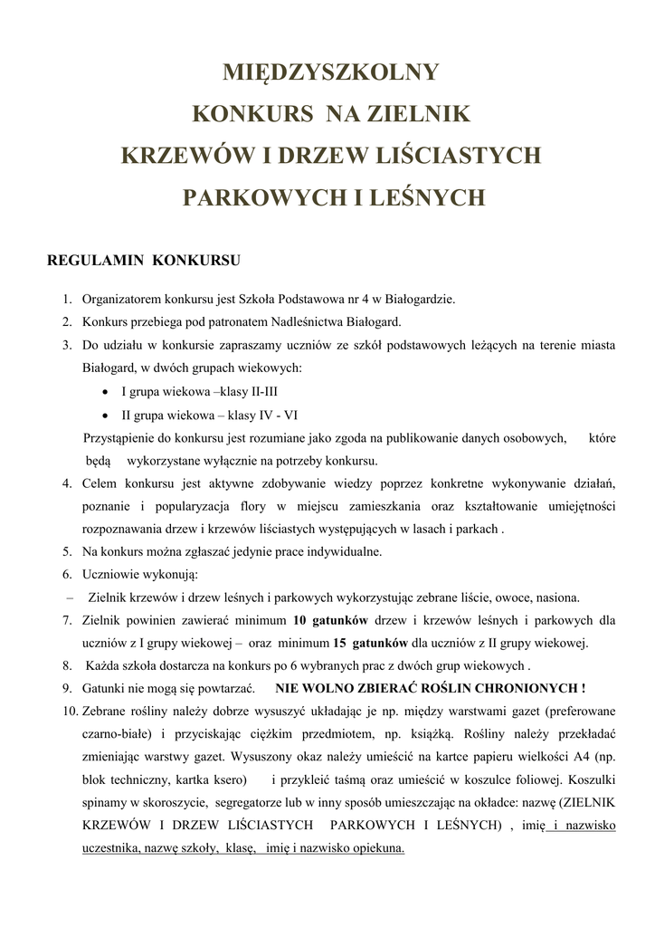 MIĘDZYSZKOLNY KONKURS NA ZIELNIK KRZEWÓW I DRZEW LIŚCIASTYCH PARKOWYCH I LEŚNYCH REGULAMIN KONKURSU 1. Organizatorem konkursu jest Szkoła Podstawowa nr 4 w Białogardzie. 2. Konkurs przebiega pod patronatem Nadleśnictwa Białogard. 3. Do udziału w konkursie zapraszamy uczniów ze szkół podstawowych leżących na terenie miasta Białogard, w dwóch grupach wiekowych: I grupa wiekowa –klasy II-III II grupa wiekowa – klasy IV - VI Przystąpienie do konkursu jest rozumiane jako zgoda na publikowanie danych osobowych, będą wykorzystane wyłącznie na potrzeby konkursu. które 4. Celem konkursu jest aktywne zdobywanie wiedzy poprzez konkretne wykonywanie działań, poznanie i popularyzacja flory w miejscu zamieszkania oraz kształtowanie umiejętności rozpoznawania drzew i krzewów liściastych występujących w lasach i parkach . 5. Na konkurs można zgłaszać jedynie prace indywidualne. 6. Uczniowie wykonują: – Zielnik krzewów i drzew leśnych i parkowych wykorzystując zebrane liście, owoce, nasiona. 7. Zielnik powinien zawierać minimum 10 gatunków drzew i krzewów leśnych i parkowych dla uczniów z I grupy wiekowej – oraz minimum 15 gatunków dla uczniów z II grupy wiekowej. 8. Każda szkoła dostarcza na konkurs po 6 wybranych prac z dwóch grup wiekowych . 9. Gatunki nie mogą się powtarzać. NIE WOLNO ZBIERAĆ ROŚLIN CHRONIONYCH ! 10. Zebrane rośliny należy dobrze wysuszyć układając je np. między warstwami gazet (preferowane czarno-białe) i przyciskając ciężkim przedmiotem, np. książką. Rośliny należy przekładać zmieniając warstwy gazet. Wysuszony okaz należy umieścić na kartce papieru wielkości A4 (np. blok techniczny, kartka ksero) i przykleić taśmą oraz umieścić w koszulce foliowej. Koszulki spinamy w skoroszycie, segregatorze lub w inny sposób umieszczając na okładce: nazwę (ZIELNIK KRZEWÓW I DRZEW LIŚCIASTYCH PARKOWYCH I LEŚNYCH) , imię i nazwisko uczestnika, nazwę szkoły, klasę, imię i nazwisko opiekuna. 11. Każdy wysuszony i przyklejony okaz musi zawierać: dla I grupy wiekowej - nazwę rodzajową ( np. kasztanowiec, dąb, robinia, lipa itd.) dla II grupy wiekowej- opis (metryczkę) wg poniższego wzoru: Wzór Nazwa polska rośliny ...................................................... Nazwa łacińska rośliny................................................... Siedlisko: ………………………………………………… Miejsce zbioru................................................................ Data zbioru..................................................................... Zebrał i oznaczył.............................................................. Przykład wypełnionej METRYCZKI Nazwa polska rośliny : JARZĄB SZWEDZKI Nazwa łacińska rośliny: Sorbus interedia Siedlisko: park Miejsce zbioru: Białogard Data zbioru: 20.09.2016 r. Zebrał i oznaczył: Jan Kowalski 12. Opis ( metryczkę) należy umieścić (przykleić) w prawym dolnym rogu kartki. 13. Prace należy złożyć do dnia 30 listopada 2016 r. w sekretariacie Szkoły Podstawowej nr 4 w Białogardzie . 14. Zielniki będą oceniane przez jury, w skład którego wejdą przedstawiciele organizatora i Nadleśnictwa Białogard. 15. Przy ocenie prac pod uwagę będą brane następujące kryteria: – liczba okazów, – estetyka wykonania zielnika, – – staranność przygotowania okazów roślinnych – nieuszkodzone rośliny, odpowiednio wysuszone, prawidłowy opis. 16. Przy oznaczaniu zebranych roślin można skorzystać z pomocy nauczycieli przyrody lub pracowników Nadleśnictwa Białogard . 17. Rozstrzygnięcie konkursu nastąpi do dnia 16 grudnia 2016 r. . 18. Wyniki konkursu zostaną ogłoszone 20 grudnia 2016 r. na stronie internetowej szkoły http://www.sp4bialogard.edu.pl. Zwycięzców Konkursu powiadomimy także pocztą elektroniczną. 19. Laureaci konkursu otrzymają nagrody książkowe , a pozostali uczestnicy pamiątkowe upominki. 20. Prace konkursowe nie będą zwracane autorom. Będzie można je obejrzeć na stronie internetowej szkoły po zakończeniu konkursu. Zwycięskie zielniki zostaną wyeksponowane na terenie Nadleśnictwa Białogard 01 października 2017 roku. Jolanta Grębowska