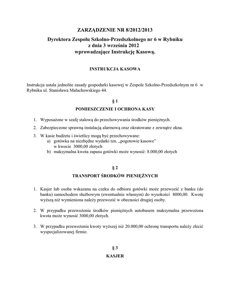 ZARZĄDZENIE NR 8/2012/2013 Dyrektora Zespołu Szkolno-Przedszkolnego nr 6 w Rybniku z dnia 3 września 2012 wprowadzające Instrukcję Kasową. INSTRUKCJA KASOWA Instrukcja ustala jednolite zasady gospodarki kasowej w Zespole Szkolno-Przedszkolnym nr 6 w Rybniku ul. Stanisława Małachowskiego 44. §1 POMIESZCZENIE I OCHRONA KASY 1. Wyposażone w szafę stalową do przechowywania środków pieniężnych. 2. Zabezpieczone sprawną instalacją alarmową oraz okratowane z zewnątrz okna. 3. W kasie budżetu i świetlicy mogą być przechowywane: a) gotówka na niezbędne wydatki tzn. „pogotowie kasowe” w kwocie 3000,00 złotych b) maksymalna kwota zapasu gotówki może wynosić: 8.000,00 złotych §2 TRANSPORT ŚRODKÓW PIENIĘŻNYCH 1. Kasjer lub osoba wskazana na czeku do odbioru gotówki może przewozić z banku (do banku) samochodem służbowym (ewentualnie własnym) do wysokości 8000,00. Kwotę wyższą niż wymieniona należy przewozić w obecności drugiej osoby. 2. W przypadku przewożenia środków pieniężnych autobusem maksymalna przewożona kwota może wynosić 3000,00 złotych. 3. W przypadku przewożenia kwoty wyższej niż 20.000,00 ochronę transportu należy zlecić wyspecjalizowanej firmie. §3 KASJER 1. Kasjerem może być: a) nie karana za przestępstwa gospodarcze lub wykroczenia przeciwko mieniu, b) posiadająca nienaganną opinię, c) posiadająca pełną zdolność) do czynności prawnych, d) legitymująca się praktyką w księgowości finansowej lub posiadająca przeszkolenie w zakresie prowadzenia gospodarki kasowej. 2. Przejęcie - przekazanie kasy może nastąpić tylko w drodze protokolarnej, w obecności komisji wyznaczonej przez kierownika jednostki. 3. Kasjer zobowiązany jest do podpisania oświadczenia o przyjęciu odpowiedzialności materialnej za powierzone mienie oraz z znajomości przepisów w zakresie gospodarki kasowej. §4 GOSPODARKA KASOWA 1. W Zespole Szkolno- Przedszkolnym nr 6 jest na bieżąco prowadzone pięć kas: kasa wydatków budżetowych, kasa ZFŚS, kasa wydzielonych dochodów , kasa stołówki oraz kasa przedszkola. Osobami odpowiedzialnymi za prawidłowe funkcjonowanie kas są: - kasy stołówki - intendent pani Bożena Sury - kasy wydatków budżetowych, wydzielonych dochodów i socjalna – sekretarz szkoły pani Aneta Herman - kasy przedszkola – intendent pani Urszula Danielczyk W przypadku nieobecności jednej z w/wym osób z powodu urlopu lub zwolnienia lekarskiego prowadzenie kas przejmuje inna z kasjerka, przy czym przejęcie/przekazanie kas dokonane zostanie protokolarnie. 2. W kasie może znajdować się: a) „pogotowie kasowe” na bieżące wydatki ustalone w § 1 pkt. 3a, b) gotówka podjęta z banku na określone rodzaje wydatków związanych z bieżącą działalnością zespołu, c) gotówka pochodząca z bieżących wpływów do kasy takich jak: wpłaty uczniów i nauczycieli, wpłaty rodziców z tytułu żywienia i czesnego dofinansowanie żywienia przez organizacje społeczne. 3. Znajdująca się na koniec dnia nadwyżka gotówki ponad ustaloną wysokość (§1 pkt. 3b) należy odprowadzić do banku w dniu, w którym powstała nadwyżka. 4. Wpływy własne do kasy uzyskane z działalności gospodarczej nie mogą być wykorzystane na realizację bieżących wydatków czy uzupełnienie zapasu gotówki z pominięciem rachunku bankowego. §5 DOKUMENTACJA KASOWA 1. Dokumentację kasy stanowią: a) dokumenty operacyjne kasy: raport kasowy „RK”, dowód wpłaty „KP”, dowód wypłaty „KW”, b) dokumenty źródłowe lub dyspozycyjne; dowody zakupu - faktury, rachunki, dowody sprzedaży - faktury, rachunki, kwitariusze, rozliczenie delegacji służbowej, lista płac, inne akceptowane przez głównego księgowego; c) dokumenty organizacyjne kasy: instrukcja kasowa, oświadczenie o odpowiedzialności materialnej (dołączone do akt osobowych pracownika) zakres czynności kasjera(dołączony do akt osobowych pracownika), protokoły przyjęcia - przekazania kasy, 2. Wszystkie obroty gotówkowe powinny być udokumentowane dowodami kasowymi: - wpłaty gotówkowe - własnymi przychodowymi dowodami kasowymi (KP) lub kwitariuszami - wypłaty gotówkowe - rozchodowymi dowodami kasowymi, którymi są źródłowe dowody kasowe lub zastępcze własne dowody wypłat gotówki (KW) 3. Zastępczym dowodem kasowym może być dowód wypłaty - „KW” - kasa wypłaci, zatwierdzonym przez dyrektora szkoły. 4. Przed przyjęciem lub wypłatą gotówki kasjer zobowiązany jest sprawdzić, czy odpowiednie dowody kasowe są podpisane przez osoby upoważnione do zlecenia wypłaty Dowody kasowe nie podpisane przez osoby do tego upoważnione nie mogą być przez kasjera przyjęte do realizacji. Nie dotyczy to przychodowych dowodów kasowych wystawianych przez kasjera. 5. Źródłowe dowody kasowe i zastępcze dowody wypłat gotówki powinny być przed dokonaniem wypłaty sprawdzone pod względem merytorycznym i formalnorachunkowym. Pracownicy zobowiązani do wykonywania tych czynności zamieszczają na dowodach kasowych swój podpis i datę. 6. Zastępcze dowody wypłaty gotówki mogą być podpisane tylko przez jedną osobę zlecającą wypłatę, jeżeli wynika to ze źródłowych dowodów kasowych uprzednio już podpisanych przez kierownika i głównego księgowego lub osoby przez nich upoważnione (np. wypłata wynagrodzeń). 7. Gotówkę wypłaca się osobie wymienionej w rozchodowym dowodzie kasowym. Odbiorca gotówki kwituje odbiór na dowodzie kasowym w sposób trwały atramentem lub długopisem zamieszczając swój podpis. Przy wypłacie gotówki osobom nieznanym kasjer obowiązany jest zażądać okazania dowodu osobistego lub innego dokumentu stwierdzającego tożsamość odbiorcy gotówki oraz wpisać na rozchodowym dowodzie kasowym numer, datę oraz określić wystawcę dokumentu. 8. Jeżeli wypłata następuje na podstawie upoważnienia wystawionego przez osobę wymienioną w rozchodowym dowodzie kasowym, w dowodzie tym