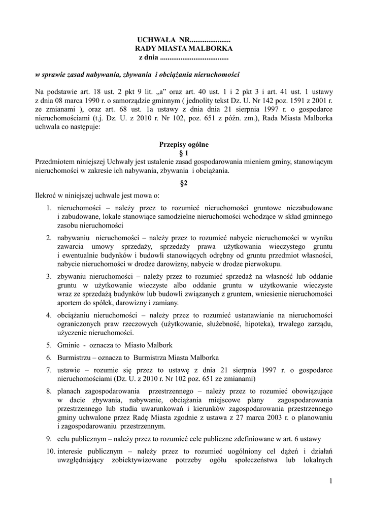 1 UCHWAŁA NR...................... RADY MIASTA MALBORKA z dnia