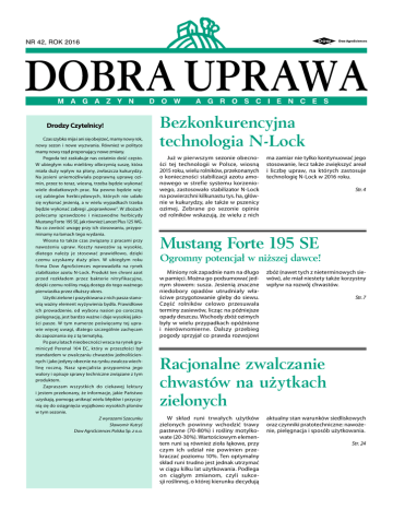 NR 42, ROK 2016 Drodzy Czytelnicy! Czas szybko mija i ani się obejrzeć, mamy nowy rok, nowy sezon i nowe wyzwania. Również w polityce mamy nowy rząd proponujący nowe zmiany. Pogoda też zaskakuje nas ostatnio dość często. W ubiegłym roku mieliśmy olbrzymią suszę, która miała duży wpływ na plony, zwłaszcza kukurydzy. Na jesieni uniemożliwiała poprawną uprawę ozi min, przez to teraz, wiosną, trzeba będzie wykonać wiele dodatkowych prac. Na pewno będzie wię cej zabiegów herbicydowych, których nie udało się wykonać jesienią, a w wielu wypadkach trzeba będzie wykonać zabiegi „poprawkowe”. W zbożach polecamy sprawdzone i niezawodne herbicydy Mustang Forte 195 SE, jak również Lancet Plus 125 WG. Na co zwrócić uwagę przy ich stosowaniu, przypo minamy na łamach tego wydania. Wiosna to także czas związany z pracami przy nawożeniu upraw. Koszty nawozów są wysokie, dlatego należy je stosować prawidłowo, dzięki czemu uzyskamy duży plon. W ubiegłym roku firma Dow AgroSciences wprowadziła na rynek stabilizator azotu N-Lock. Produkt ten chroni azot przed rozkładem przez bakterie nitryfikacyjne, dzięki czemu rośliny mają dostęp do tego ważnego pierwiastka przez dłuższy okres. Użytki zielone i pozyskiwana z nich pasza stano wią ważny element wyżywienia bydła. Prawidłowe ich prowadzenie, od wyboru nasion po coroczną pielęgnację, jest bardzo ważne i daje wysokiej jako ści pasze. W tym numerze poświęcamy tej upra wie więcej uwagi, dlatego szczególnie zachęcam do zapoznania się z tą tematyką. Po paru latach nieobecności wraca na rynek gra minicyd Perenal 104 EC, który w przeszłości był standardem w zwalczaniu chwastów jednoliścien nych i jako jedyny obecnie na rynku zwalcza wiech linę roczną. Nasz specjalista przypomina jego walory i opisuje sprawy techniczne związane z tym produktem. Zapraszam wszystkich do ciekawej lektury i jestem przekonany, że informacje, jakie Państwo uzyskają, pomogą uniknąć wielu błędów i przyczy nią się do osiągnięcia wyjątkowo wysokich plonów w tym sezonie. Z wyrazami Szacunku Sławomir Kutryś Dow AgroSciences Polska Sp. z o.o. Bezkonkurencyjna technologia N-Lock Już w pierwszym sezonie obecno ści tej technologii w Polsce, wiosną 2015 roku, wielu rolników, przekonanych o konieczności stabilizacji azotu amo nowego w strefie systemu korzenio wego, zastosowało stabilizator N-Lock na powierzchni kilkunastu tys. ha, głów nie w kukurydzy, ale także w pszenicy ozimej. Zebrane po sezonie opinie od rolników wskazują, że wielu z nich ma zamiar nie tylko kontynuować jego stosowanie, lecz także zwiększyć areał i liczbę upraw, na których zastosuje technologię N-Lock w 2016 roku. Str. 4 Mustang Forte 195 SE Ogromny potencjał w niższej dawce! Miniony rok zapadnie nam na długo w pamięci. Można go podsumować jed nym słowem: susza. Jesienią znaczne niedobory opadów utrudniały wła ściwe przygotowanie gleby do siewu. Część rolników celowo prze suwała terminy zasiewów, licząc na późniejsze opady deszczu. Wschody zbóż ozimych były w wielu przypadkach opóźnione i nierównomierne. Dalszy przebieg pogody sprzyjał co prawda rozwojowi zbóż (nawet tych z nieterminowych sie wów), ale miał niestety także korzystny wpływ na rozwój chwastów. Str. 7 Racjonalne zwalczanie chwastów na użytkach zielonych W skład runi trwałych użytków zielonych powinny wchodzić trawy pastewne (70‑80%) i rośliny motylko wate (20-30%). Wartościowym elemen tem runi są również zioła łąkowe, przy czym ich udział nie powinien prze kraczać poziomu 10%. Ten optymalny skład runi trudno jest jednak utrzymać w ciągu kilku lat użytkowania. Podlega on ciągłym zmianom, czyli sukce sji roślinnej, o której kierunku decydują aktualny stan warunków siedliskowych oraz czynniki pratotechniczne: nawoże nie, pielęgnacja i sposób użytkowania. Str. 24 2 DOBRA UPRAWA MAGAZYN UPRAWA ROŚLIN We współczesnym rolnictwie azot jest głównym czynnikiem plonotwórczym. Wszystkie pozostałe czynniki warunkują pro duktywność azotu w okresie wegetacji upra wianej rośliny. Rośliny pobierają azot w dwóch formach: amonowej (N-NH4) i azotanowej (N-NO3). W rolnictwie intensywnym, a takie dominuje w Polsce, zasoby azotu glebowego są zbyt małe, aby pokryć potrzeby roślin. Głównym źródłem składnika są nawozy mineralne. W składzie nawozów natural nych i organicznych dominują Norg i N-NH4. Niezależnie od źródła azotu obie formy mine ralne pojawiają się w glebie w następstwie mineralizacji azotu organicznego (Norg). Proces ten zachodzi w ściśle określonej kolej ności, a formą finalną jest N-NO3: GNOJOWICA ↙ ↓ Norg → NH4 → NO3 + − ↑ MOCZNIK Ryc. 1. Formy azotu różnią się pod względem właściwości chemicznych, co rzutuje na ruchliwość w glebie, a tym samym na dostępność dla rośliny, lecz także na wymywanie (tabela 1). Kluczowa róż nica między formami mineralnymi dotyczy nakładów energetycznych i warunków pobierania przez roślinę. Azot amonowy nie wymaga dużych nakładów energetycznych i pobierany jest efektywnie już w niższych temperaturach. Takie warunki panują przez większość sezonu wegetacyjnego w Polsce. Efektywne pobieranie azotanów wymaga wyższych temperatur gleby. Najlepszy efekt produkcyjny uzyskuje się przy obecności obu form azotu w glebie, pod warunkiem opty malnego odczynu i optymalnej zawartości dostępnych form wapnia, magnezu i potasu. Rośliny uprawne w okresie rozwoju wykazują zróżnicowane zapotrzebowa nie na azot. W grupie roślin ziarnkowych (zboża i inne produkujące nasiona) wraż liwość rośliny na ilość azotu dostępnego w glebie ujawnia się w trzech kardynal nych okresach: a) formowania struktury łanu (krzewienie zboża; rozeta – rzepak), b) zawiązywania ziarniaków/nasion, c) nalewania ziarna/nasion. Zadaniem rol nika jest takie zarządzanie azotem w łanie/ plantacji,