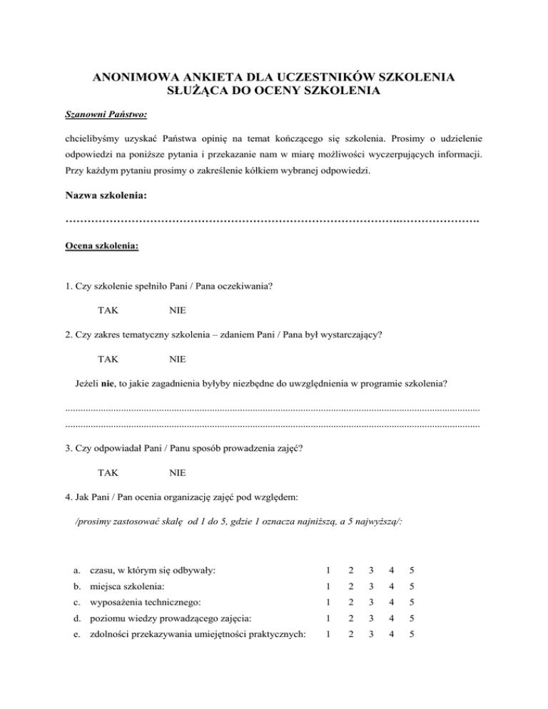 ANONIMOWA ANKIETA DLA UCZESTNIKÓW SZKOLENIA SŁUŻĄCA DO OCENY SZKOLENIA Szanowni Państwo: chcielibyśmy uzyskać Państwa opinię na temat kończącego się szkolenia. Prosimy o udzielenie odpowiedzi na poniższe pytania i przekazanie nam w miarę możliwości wyczerpujących informacji. Przy każdym pytaniu prosimy o zakreślenie kółkiem wybranej odpowiedzi. Nazwa szkolenia: ……………………………………………………………………………….…………………. Ocena szkolenia: 1. Czy szkolenie spełniło Pani / Pana oczekiwania? TAK NIE 2. Czy zakres tematyczny szkolenia – zdaniem Pani / Pana był wystarczający? TAK NIE Jeżeli nie, to jakie zagadnienia byłyby niezbędne do uwzględnienia w programie szkolenia? .................................................................................................................................................................... .................................................................................................................................................................... 3. Czy odpowiadał Pani / Panu sposób prowadzenia zajęć? TAK NIE 4. Jak Pani / Pan ocenia organizację zajęć pod względem: /prosimy zastosować skalę od 1 do 5, gdzie 1 oznacza najniższą, a 5 najwyższą/: a. czasu, w którym się odbywały: 1 2 3 4 5 b. miejsca szkolenia: 1 2 3 4 5 c. wyposażenia technicznego: 1 2 3 4 5 d. poziomu wiedzy prowadzącego zajęcia: 1 2 3 4 5 e. zdolności przekazywania umiejętności praktycznych: 1 2 3 4 5 5. Czy zamierza Pani / Pan poszukiwać pracy zgodnie z uzyskanymi w wyniku szkolenia umiejętnościami? TAK NIE 6. Inne uwagi i propozycje dotyczące szkolenia: …………………………………………………………………………………………………………… …………………………………………………………………………………………………………… …………………………………………………………………………………………………………… …………………………………………………………………………………………………………… …………………………………………………………………………………………………………… …………………………………………………………………………………………………………… …………………………………………………………………………………………………………… …………………………………………………………………………………………………………… …………………………………………………………………………………………………………… Prosimy sprawdzić, czy udzielił(a) Pan(i) odpowiedzi na wszystkie pytania. DZIĘKUJEMY