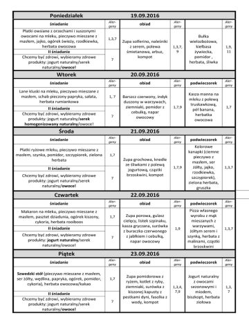 Poniedziałek śniadanie Płatki owsiane z orzechami i suszonymi owocami na mleku, pieczywo mieszane z masłem, jajko, ogórek świeży, rzodkiewka, herbata owocowa II śniadanie Chcemy być zdrowi, wybieramy zdrowe produkty: jogurt naturalny/serek naturalny/owoce! 19.09.2016 Alergeny 1,3,7 7 Wtorek śniadanie Lane kluski na mleku, pieczywo mieszane z masłem, schab pieczony papryka, sałata, herbata rumiankowa 1, 7 7 Środa śniadanie Płatki ryżowe mleku, pieczywo mieszane z masłem, szynka, pomidor, szczypiorek, zielona herbata Makaron na mleku, pieczywo mieszane z masłem, pasztet dziadunia, ogórek kiszony, cykoria, herbata rooiboos 7 1,9, 11 obiad Alergeny podwieczorek Alergeny Barszcz czerwony, indyk duszony w warzywach, ziemniaki, pomidor z cebulką, napar owocowy 1,7,9 Kasza manna na mleku z polewą truskawkową, pół banana, herbatka owocowa 1,7 obiad Alergeny podwieczorek Alergeny 1,7,9 Kolorowe kanapki (ciemne pieczywo z masłem, ser żółty, jajko, rzodkiewka, szczypiorek), zielona herbata, gruszka Zupa grochowa, knedle ze śliwkami z polewą jogurtową, cząstki brzoskwini, kompot 1,3,7 Alergeny podwieczorek Alergeny 1,9 Pizza własnego wyrobu z mąk mieszanych z warzywami, żółtym serem i szynką, herbata z malinami, cząstki brzoskwini 1,3,7 Alergeny podwieczorek Alergeny 1,3,4, 7,9 Jogurt naturalny z owocami sezonowymi i miodem, biszkopt, herbata ziołowa 1,3, 7 22.09.2016 Alergeny obiad 1,7 Zupa porowa, gulasz cielęcy, listek szpinaku, kasza gryczana, surówka z buraczka czerwonego z jabłkiem i cebulką, napar owocowy II śniadanie Chcemy być zdrowi, wybieramy zdrowe produkty: jogurt naturalny/serek naturalny/owoce! 1,3,7, 9 Bułka wielozbożowa, kiełbasa żywiecka, pomidor , herbata, śliwka 1,7 Czwartek śniadanie Alergeny 21.09.2016 Alergeny II śniadanie Chcemy być zdrowi, wybieramy zdrowe produkty: jogurt naturalny/serek naturalny/owoce! Zupa solferino, naleśniki z serem, polewa śmietanowa, arbuz, kompot Alergeny 20.09.2016 Alergeny II śniadanie Chcemy być zdrowi, wybieramy zdrowe produkty: jogurt naturalny/serek homogenizowany naturalny/owoce! obiad 7 Piątek 23.09.2016 śniadanie Alergeny Szwedzki stół (pieczywo mieszane z masłem, ser żółty, wędlina, papryka, ogórek, pomidor, cykoria), herbata owocowa/kakao 1,7 II śniadanie Chcemy być zdrowi, wybieramy zdrowe produkty: jogurt naturalny/serek naturalny/owoce! 7 obiad Zupa pomidorowa z ryżem, kotlet z ryby, ziemniaki, surówka z kiszonej kapusty z pestkami dyni, fasolka z wody, kompot Alergeny Podane w jadłospisie liczby oznaczają wymienione niżej alergeny SUBSTANCJE LUB PRODUKTY POWODUJĄCE ALERGIE LUB REAKCJE NIETOLERANCJI (wg załącznika II do ROZPORZĄDZENIA PARLAMENTU EUROPEJSKIEGO I RADY (UE) NR 1169/2011 z dnia 25 października 2011 r.) 1. Zboża zawierające gluten 2. Skorupiaki i produkty pochodne 3. Jaja i produkty pochodne 4. Ryby i produkty pochodne 5. Orzeszki ziemne (arachidowe) i produkty pochodne 6. Soja i produkty pochodne 7. Mleko i produkty pochodne 8. Orzechy 9. Seler i produkty pochodne 10. Gorczyca i produkty pochodne 11. Nasiona sezamu i produkty pochodne 12. Dwutlenek siarki i siarczyny w stężeniach powyżej 10 mg/kg lub 10 mg/litr w przeliczeniu na całkowitą zawartość SO2 dla produktów w postaci gotowej bezpośrednio do spożycia lub w postaci przygotowanej do spożycia zgodnie z instrukcjami wytwórców 13. Łubin i produkty pochodne 14. Mięczaki i produkty pochodne Gramatura posiłków: Śniadanie: Zupa mleczna 200 g Pieczywo 35 g Masło 6 g Wędlina/ser żółty 15 g Pomidor, ogórek 30 g Papryka, rzodkiewka, 20 g Napój 150 g II śniadanie: Owoce 80 – 100 g Warzywa 20-30 g Orzechy, ziarenka 5 g Sok świeży 130 g Obiad: Zupa 2502-300 g Kotlet mielony, schabowy, z piersi kurczaka 65 g. Klops 60 g Udko kurczaka – 85 g Mięso duszone bez panierki 55 g Gulasz, mięso razem z sosem 100 - 120 g Ziemniaki 150 g Ryż, kasza, makaron 80 -100 g Surówka 100 g Mizeria 120 g Warzywa gotowane z wody 70 g Dodatek warzywa (pasek papryki, krążek marchewki) – 30 g Podwieczorek: Pieczywo – 25 g. Masło – 4 g Wędlina – 15 g Pomidor, ogórek, papryka, rzodkiewka, 20 g Ciastko, biszkopt – 40 g Ciasto – 100 g Owoce – 50 g Sałatka – 70 g Placki ziemniaczane, racuchy – 100 g Budyń, kisiel – 120 g