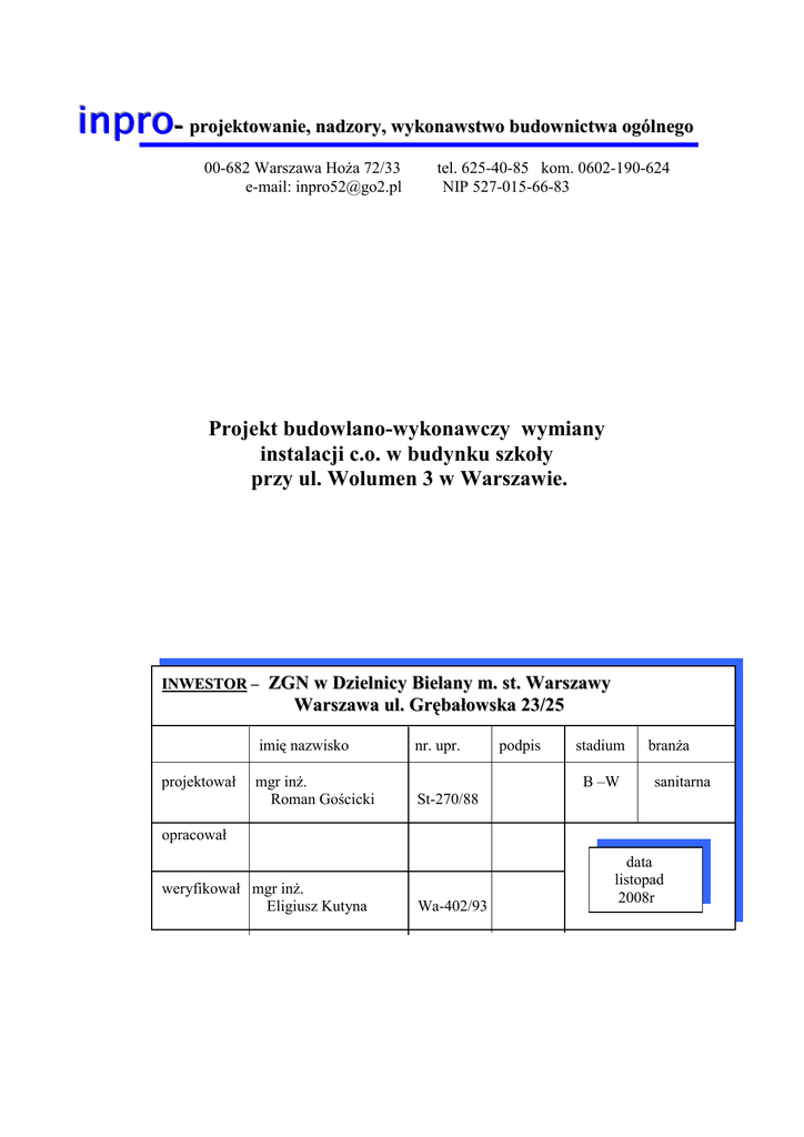inpro- projektowanie, nadzory, wykonawstwo budownictwa ogólnego 00-682 Warszawa HoŜa 72/33 e-mail: [email protected] tel. 625-40-85 kom. 0602-190-624 NIP 527-015-66-83 Projekt budowlano-wykonawczy wymiany instalacji c.o. w budynku szkoły przy ul. Wolumen 3 w Warszawie. INWESTOR – projektował ZGN w Dzielnicy Bielany m. st. Warszawy Warszawa ul. Grębałowska 23/25 imię nazwisko nr. upr. mgr inŜ. Roman Gościcki St-270/88 podpis stadium B –W branŜa sanitarna opracował weryfikował mgr inŜ. Eligiusz Kutyna Wa-402/93 data listopad 2008r Zawartość opracowania Część opisowa 1.0 - Podstawa opracowania. 2.0 - Zakres opracowania. 3.0 - Opis techniczny istniejącej instalacji c.o. 4.0 - Opis techniczny projektowanej instalacji c.o. 5.0 - Wytyczne wykonania i odbioru instalacji 6.0 – Zestawienie podstawowych materiałów. 7.0 - Informacja o „BIOZ” Część rysunkowa • - mapa sytuacyjno-wysokościowa • - rzut instalacji c.o. – piwnice • - rzut instalacji c.o. – parter • - rzut instalacji c.o. – piętro I • - rozwinięcie instalacji c.o. rys. nr 1 rys. nr 2 rys. nr 3 rys. nr 4 rys. nr 5 1:500 1:100 1:100 1:100 - OPIS TECHNICZNY 1.0 - Podstawa opracowania. - Zlecenie Inwestora - ZałoŜenia techniczne i eksploatacyjne uzgodnione z inwestorem. - Informacja o obiekcie wydana przez ZEC śoliborz z dnia 05. 11. 2009r - Protokóły załoŜeń techniczno-eksploatacyjnych SPEC - Obowiązujące normy i przepisy 2.0 - Zakres opracowania. Budynek podlega całkowitej termomodernizacji (ocieplenie budynku, wymiana okien, wymiana instalacji c.o.) Zgodnie z ustaleniami z Inwestorem projekt obejmuje całkowitą wymianę instalacji c.o. Celem umoŜliwienia wykonania instalacji przy jak najmniejszym zakłócaniu funkcjonowania budynku, oraz zmniejszenia kosztów inwestycji projektowaną instalację zaprojektowano „po istniejącym śladzie”. 3.0 - Opis techniczny istniejącej instalacji c.o. Dane ogólne obiektu : - całkowita kubatura budynku – 4984,0 m3 - zapotrzebowanie ciepła na cele c.o. wg ZEC – Qco =113,0 kW - maksymalne zapotrzebowanie ciepła na cele c.w.u. wg ZEC – Qc.w. max =113,0 kW - średnie zapotrzebowanie ciepła na cele c.w.u. wg ZEC – Qc.w. śr. = 52,0 kW Istniejąca instalacja c.o. zasilana jest z dwufunkcyjnego węzła cieplnego usytuowanego w piwnicy budynku. Budynek murowany, dwukondygnacyjny, częściowo podpiwniczony. Budynek posiada instalację c.o. Instalacja c.o. zasilana jest z rozdzielaczy usytuowanych w węŜle. Instalację c.o. systemu zamkniętego. Istniejąca instalacja c.o. wykonana jako dwururowa, pompowa z rozdziałem dolnym. Instalacja wykonana jest z rur stalowych czarnych ze szwem łączonych przez spawanie wg PN79/H/74244. Poziomy zasilające prowadzone w piwnicy i w kanale instalacyjnym wzdłuŜ ścian. Piony prowadzone po wierzchu ścian. U podstaw pionów brak podpionowych zaworów regulacyjnych. Poziomy prowadzone w piwnicy i kanale instalacyjnym zaizolowane cieplnie. Elementami grzejnymi są grzejniki Ŝeliwne członowe typu T-1. Odpowietrzenie instalacji poprzez odpowietrzniki automatyczne na ostatnich kondygnacjach. 4.0 - Opis techniczny projektowanej instalacji c.o. Istniejąca instalacja c.o. ulega całkowitej wymianie. Instalację wykonać z rur stalowych czarnych z usuniętym wypływem łączonych przez spawanie wg PN-79/H/74244 i świadectwem ZETOM. Wymieniana instalacja c.o. zasilana będzie z nowego dwufunkcyjnego węzła cieplnego. Węzeł cieplny wg osobnego opracowania. Zapotrzebowanie ciepła dla budynku obliczono zgodnie z normą PN-EN 12831:2006 programem KANozc 4.01 Temperatury wewnętrzne wg normy PN-82/B-02402. Norma na obliczanie współczynnika przenikania ciepła - PN-EN ISO 6946 Wyniki - Zestawienie przegród Symbol DCH DW DZ OK DBL PODŁ-GR STR SW6 SW36 SW12 SZ 36 SZ 50 Opis Stropodach wentylowany Drzwi wewnętrzne Drzwi zewnętrzne Okna Drzwi balkonowe Podłoga na gruncie Strop nad piwnicami Ściana wewnętrzna 6,0 cm Ściana wewnętrzna 36,0cm Ściana wewnętrzna 12,0cm Ściana zewnętrzna 36,0 cm Ściana zewnętrzna 50,0 cm U W/m2·K 0,211 5,100 2,500 1,800 1,800 0,285 0,682 2,477 1,309 2,056 0,236 0,286 Dane ogólne instalacji po wymianie: - całkowite zapotrzebowanie ciepła na cele c.o. - 80,027 kW - parametry projektowanej instalacji c.o. - 75/500C - wymagane ciśnienie dyspozycyjne na rozdzielaczach wg obliczeń – 10,0 kPa. Dane do obliczenia węzła cieplnego • parametry temperaturowe instalacji c.o. - 75/50°C • parametry temperaturowe instalacji c.w. - 60/5°C • zapotrzebowanie ciepła c.o. - Qco = 80,027 kW • zapotrzebowanie ciepła c.w. maksymalne - Qc.w.max =104,0 kW • zapotrzebowanie ciepła c.w. średnie - Qc.w.śr. = 52,0 kW • opory instalacji c.o. = 10kPa • opory instalacji c.w.u. = 10kPa • ciśnienie dopuszczalne w instalacji c.o. = 0,30 MPa • ciśnienie dopuszczalne w instalacji c.w.u. = 0,60 MPa • ciśnienie statyczne instalacji c.o. = 1,0 bar • pojemność wodna zładu = 1,26 m3 Instalacja projektowana systemu zamkniętego z rozdziałem dolnym, dwururowa, pompowa, z automatycznymi odpowietrznikami. Obliczenia hydrauliczne instalacji przy pomocy programu „Anko-Ami”. Przy doborze grzejników nie uwzględniano zysków ciepła od przewodów, a jedynie schłodzenie wody w przewodach. Prowadzenie rurociągów, ich średnice i nastawy zaworów w części rysunkowej opracowania: Projektowane grzejniki stalowe dwu i trzypłytowe typ VNH. Regulacja instalacji: • nowoprojektowane podpionowe zawory regulacyjne firmy Danfoss typ USV-I Pn=1,0 MPa t=1500C z nastawami podanymi na rysunkach • grzejnikowe zawory termostatyczne z głowicami i nastawami wstępnymi firmy Danfoss typ RDT-N z głowicą termostatyczną typ RTD Głowice zaworów termostatycznych w trakcie eksploatacji muszą być bezwzględnie odsłonięte (czujnik temperatury znajduje się w głowicy). Całość instalacji (włącznie z grzejnikami) dokładnie wypłukać, co powinno być potwierdzone prz