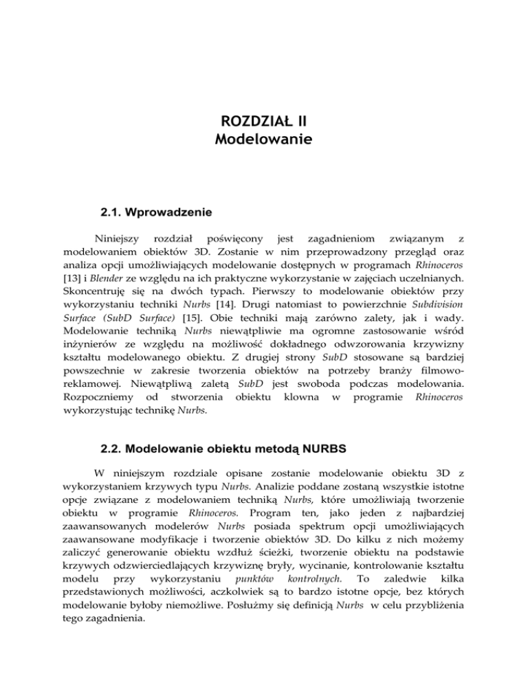 ROZDZIAŁ II Modelowanie 2.1. Wprowadzenie Niniejszy rozdział poświęcony jest zagadnieniom związanym z modelowaniem obiektów 3D. Zostanie w nim przeprowadzony przegląd oraz analiza opcji umożliwiających modelowanie dostępnych w programach Rhinoceros [13] i Blender ze względu na ich praktyczne wykorzystanie w zajęciach uczelnianych. Skoncentruję się na dwóch typach. Pierwszy to modelowanie obiektów przy wykorzystaniu techniki Nurbs [14]. Drugi natomiast to powierzchnie Subdivision Surface (SubD Surface) [15]. Obie techniki mają zarówno zalety, jak i wady. Modelowanie techniką Nurbs niewątpliwie ma ogromne zastosowanie wśród inżynierów ze względu na możliwość dokładnego odwzorowania krzywizny kształtu modelowanego obiektu. Z drugiej strony SubD stosowane są bardziej powszechnie w zakresie tworzenia obiektów na potrzeby branży filmoworeklamowej. Niewątpliwą zaletą SubD jest swoboda podczas modelowania. Rozpoczniemy od stworzenia obiektu klowna w programie Rhinoceros wykorzystując technikę Nurbs. 2.2. Modelowanie obiektu metodą NURBS W niniejszym rozdziale opisane zostanie modelowanie obiektu 3D z wykorzystaniem krzywych typu Nurbs. Analizie poddane zostaną wszystkie istotne opcje związane z modelowaniem techniką Nurbs, które umożliwiają tworzenie obiektu w programie Rhinoceros. Program ten, jako jeden z najbardziej zaawansowanych modelerów Nurbs posiada spektrum opcji umożliwiających zaawansowane modyfikacje i tworzenie obiektów 3D. Do kilku z nich możemy zaliczyć generowanie obiektu wzdłuż ścieżki, tworzenie obiektu na podstawie krzywych odzwierciedlających krzywiznę bryły, wycinanie, kontrolowanie kształtu modelu przy wykorzystaniu punktów kontrolnych. To zaledwie kilka przedstawionych możliwości, aczkolwiek są to bardzo istotne opcje, bez których modelowanie byłoby niemożliwe. Posłużmy się definicją Nurbs w celu przybliżenia tego zagadnienia. Krzywa B-sklejana: - Krzywa B-sklejana (B-spline) to taka krzywa, która składa się z kawałków krzywych wielomianowych (krzywych Beziera). - do zdefiniowania krzywej B-sklejanej potrzebny jest wielobok kontrolny i stopień krzywej - krzywa stopnia k zdefiniowana wielobokiem o n+1 wierzchołkach składa się z (n-k+1) segmentów - krzywa ma ciągłość rzędu (k-1) z wyjątkiem wielokrotnych węzłów wewnętrznych - przesunięcie wierzchołka wieloboku wpływa na kształt krzywej - Krzywa jest wypukła, jeżeli wielobok który ją definiuje jest wypukły - Aby przesunąć, przeskalować lub obrócić krzywą, należy również przesunąć, przeskalować lub obrócić wielobok, na którym jest opisana Wszystkie krzywe na obrazie zdefiniowane są tym samym wielobokiem. Różnią się stopniem. Krzywa jest: a) 1 stopnia; b) 2 stopnia; c) 3 stopnia; d) 4 stopnia; e) 5 stopnia; f) 6 stopnia Różne klasy ciągłości w łączeniu krzywych Beziera 3-go stopnia. G0 (=C0) – wieloboki mają tylko punkt wspólny G1 – boki wielokąta (czerwony i zielony) leżą na wspólnej prostej, lecz ich długości nie są równe C1 – oba boki leżą na tej samej prostej i są tej samej długosci Krzywa Nurbs: - Rational (niejednostajny) oznacza, że węzły mogą być rozmieszczone dowolnie. Poprzez modyfikację węzłów można zmienić kształt krzywej oraz zmniejszyć jej ciągłość. - Non Uniform oznacza, że punktom kontrolnym można przypisać tzw. wagi. Wartość wagi wybranego punktu kontrolnego wpływa na kształt krzywej, który może być modyfikowany bez konieczności zmiany położenia wierzchołka (punktu kontrolnego). Na obrazku powyżej czarnymi liniami został zaznaczony wielobok tworzący krzywą. Leżące na wieloboku kwadraty to punkty kontrolne, natomiast czarne kółka na krzywej to węzły. Na kształt krzywej Nurbs wpływają punkty kontrolne, węzły, wagi punktów kontrolnych oraz stopień wielomianów. Jest typem krzywej, który wykorzystywany jest przez inżynierów ze względu na wygodę w generowaniu obiektów. Praktyczność w korzystaniu z Nurbsów lub krzywych b-sklejanych zapewniają punkty kontrolne, dzięki którym możemy wpływać na kształt krzywej. 2.3. Rhinoceros Tematem tego przykładu będzie wymodelowanie przestrzennego modelu głowy klowna. Celowo posłużę się tutaj modelem organicznym. Modelowanie stanie się jeszcze bardziej wyrafinowane ze względu na stopień skomplikowania obiektu oraz umożliwi analizę wybranych opcji Rhinoceros'a. Przystępuję do tworzenia krzywej, która posłuży do wymodelowania głowy. Ważne jest to, aby stworzona krzywa w miarę możliwości wiernie przypominała kształt profilu głowy, którą mamy zamiar wymodelować. Niezbędna jest tutaj modyfikacja pozycji punktów kontrolnych w celu uzyskania jak najlepiej wyglądającego zarysu głowy. Następnie przystępuję do stworzenia kolejnych krzywych. Kopiuję pierwszą krzywą i przesuwamy punkty kontrolne każdej z nich tak, aby uzyskała pożądany kształt. W ten sposób uzyskuję kolejne przekroje naszej głowy, które mogę wykorzystać do zbudowania powierzchni opcją loft, czyli metodą rozpinania powierzchni na przekrojach. Po stworzeniu bryły głowy i modyfikacji pozycji punktów kontrolnych można przystąpić do formowania otworów na oczy i rogi. Wykorzystuję do tego krzywą, którą ”uwypuklam” korzystając z opcji extrude (wyciąganie), a następnie wycinam opcją trim otwór w opracowywanej głowie. Opcja project umożliwia projekcję krzywej na powierzchnię obiektu 3D. Stworzona krzywa po użyciu opcji project dopasowuje się swoim kształtem do krzywizny powierzchni, na jaką jest rzutowana. W zaawansowanym modelowaniu opcja project jest wykorzystywana na szeroką skalę. Jest ona niezastąpiona przy modelowaniu z wykorzystaniem krzywych typu Nurbs. Korzystając z opcji loft tworzę zęby wraz z kłami, przy czym kły powstają poprzez przejście kształtu okrągłego w punkt. Następnie przesuwam punkty tak, aby bryła przypominała ki