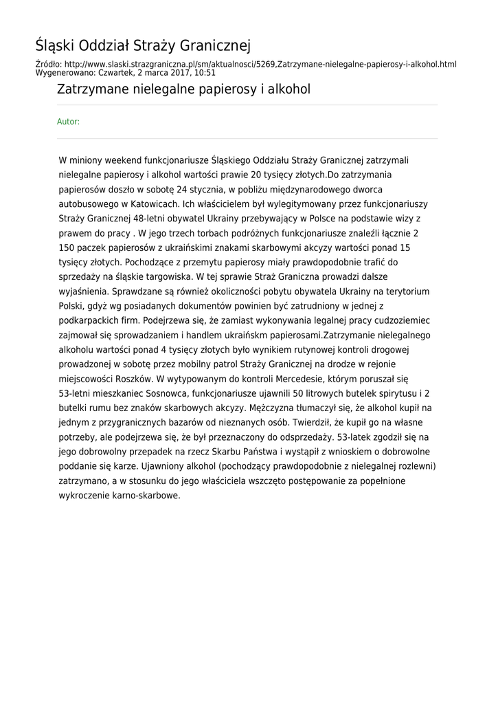 Śląski Oddział Straży Granicznej Źródło: http://www.slaski.strazgraniczna.pl/sm/aktualnosci/5269,Zatrzymane-nielegalne-papierosy-i-alkohol.html Wygenerowano: Czwartek, 2 marca 2017, 10:51 Zatrzymane nielegalne papierosy i alkohol Autor: W miniony weekend funkcjonariusze Śląskiego Oddziału Straży Granicznej zatrzymali nielegalne papierosy i alkohol wartości prawie 20 tysięcy złotych.Do zatrzymania papierosów doszło w sobotę 24 stycznia, w pobliżu międzynarodowego dworca autobusowego w Katowicach. Ich właścicielem był wylegitymowany przez funkcjonariuszy Straży Granicznej 48-letni obywatel Ukrainy przebywający w Polsce na podstawie wizy z prawem do pracy . W jego trzech torbach podróżnych funkcjonariusze znaleźli łącznie 2 150 paczek papierosów z ukraińskimi znakami skarbowymi akcyzy wartości ponad 15 tysięcy złotych. Pochodzące z przemytu papierosy miały prawdopodobnie trafić do sprzedaży na śląskie targowiska. W tej sprawie Straż Graniczna prowadzi dalsze wyjaśnienia. Sprawdzane są również okoliczności pobytu obywatela Ukrainy na terytorium Polski, gdyż wg posiadanych dokumentów powinien być zatrudniony w jednej z podkarpackich firm. Podejrzewa się, że zamiast wykonywania legalnej pracy cudzoziemiec zajmował się sprowadzaniem i handlem ukraińskm papierosami.Zatrzymanie nielegalnego alkoholu wartości ponad 4 tysięcy złotych było wynikiem rutynowej kontroli drogowej prowadzonej w sobotę przez mobilny patrol Straży Granicznej na drodze w rejonie miejscowości Roszków. W wytypowanym do kontroli Mercedesie, którym poruszał się 53-letni mieszkaniec Sosnowca, funkcjonariusze ujawnili 50 litrowych butelek spirytusu i 2 butelki rumu bez znaków skarbowych akcyzy. Mężczyzna tłumaczył się, że alkohol kupił na jednym z przygranicznych bazarów od nieznanych osób. Twierdził, że kupił go na własne potrzeby, ale podejrzewa się, że był przeznaczony do odsprzedaży. 53-latek zgodził się na jego dobrowolny przepadek na rzecz Skarbu Państwa i wystąpił z wnioskiem o dobrowolne poddanie się karze. Ujawniony alkohol (pochodzący prawdopodobnie z nielegalnej rozlewni) zatrzymano, a w stosunku do jego właściciela wszczęto postępowanie za popełnione wykroczenie karno-skarbowe.