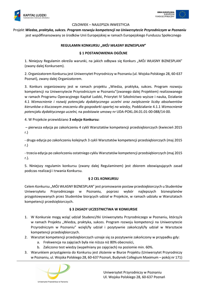 CZŁOWIEK – NAJLEPSZA INWESTYCJA Projekt Wiedza, praktyka, sukces. Program rozwoju kompetencji na Uniwersytecie Przyrodniczym w Poznaniu jest współfinansowany ze środków Unii Europejskiej w ramach Europejskiego Funduszu Społecznego REGULAMIN KONKURSU „MÓJ WŁASNY BIZNESPLAN” § 1 POSTANOWIENIA OGÓLNE 1. Niniejszy Regulamin określa warunki, na jakich odbywa się Konkurs „MÓJ WŁASNY BIZNESPLAN” (zwany dalej Konkursem). 2. Organizatorem Konkursu jest Uniwersytet Przyrodniczy w Poznaniu (ul. Wojska Polskiego 28, 60-637 Poznań), zwany dalej Organizatorem. 3. Konkurs organizowany jest w ramach projektu „Wiedza, praktyka, sukces. Program rozwoju kompetencji na Uniwersytecie Przyrodniczym w Poznaniu”(zwanego dalej Projektem) realizowanego w ramach Programu Operacyjnego Kapitał Ludzki, Priorytet IV Szkolnictwo wyższe i nauka, Działanie 4.1 Wzmocnienie i rozwój potencjału dydaktycznego uczelni oraz zwiększenie liczby absolwentów kierunków o kluczowym znaczeniu dla gospodarki opartej na wiedzy, Poddziałanie 4.1.1 Wzmocnienie potencjału dydaktycznego uczelni, na podstawie umowy nr UDA-POKL.04.01.01-00-088/14-00. 4. W Projekcie przewidziano 3 edycje Konkursu: – pierwsza edycja po zakończeniu 4 cykli Warsztatów kompetencji przedsiębiorczych (kwiecień 2015 r.) - druga edycja po zakończeniu kolejnych 3 cykli Warsztatów kompetencji przedsiębiorczych (maj 2015 r.) - trzecia edycja po zakończeniu ostatniego cyklu Warsztatów kompetencji przedsiębiorczych (maj 2015 r.). 5. Niniejszy regulamin konkursu (zwany dalej Regulaminem) jest zbiorem obowiązujących zasad podczas realizacji i trwania Konkursu. § 2 CEL KONKURSU Celem Konkursu „MÓJ WŁASNY BIZNESPLAN” jest promowanie postaw przedsiębiorczych u Studentów Uniwersytetu Przyrodniczego w Poznaniu, poprzez wybór najlepszych biznesplanów przygotowywanych przez Studentów biorących udział w Projekcie, w ramach udziału w Warsztatach kompetencji przedsiębiorczych. § 3 ZASADY UCZESTNICTWA W KONKURSIE 1. W Konkursie mogą wziąć udział Studenci/tki Uniwersytetu Przyrodniczego w Poznaniu, którzy/e w ramach Projektu „Wiedza, praktyka, sukces. Program rozwoju kompetencji na Uniwersytecie Przyrodniczym w Poznaniu” wzięli/ły udział i pozytywnie zakończyli/ły udział w Warsztacie kompetencji przedsiębiorczych. 2. Warsztat kompetencji przedsiębiorczych uznaje się za pozytywnie zakończony w przypadku gdy: a. Frekwencja na zajęciach była nie niższa niż 80% obecności, b. Zaliczono test wiedzy (wypełniany po zajęciach) na poziomie min. 60%. 3. Warunkiem przystąpienia do Konkursu jest złożenie w Biurze Projektu (Uniwersytet Przyrodniczy w Poznaniu, ul. Wojska Polskiego 28, 60-637 Poznań, Budynek Collegium Maximum – pokój nr 171) Uniwersytet Przyrodniczy w Poznaniu Ul. Wojska Polskiego 28, 60-637 Poznań CZŁOWIEK – NAJLEPSZA INWESTYCJA Projekt Wiedza, praktyka, sukces. Program rozwoju kompetencji na Uniwersytecie Przyrodniczym w Poznaniu jest współfinansowany ze środków Unii Europejskiej w ramach Europejskiego Funduszu Społecznego biznesplanu przygotowanego na podstawie informacji zdobytych podczas Warsztatów kompetencji przedsiębiorczych w terminach wyznaczonych przez Biuro projektu. a. Biznes plan powinien być przygotowany samodzielnie, złożony w formie papierowej i podpisany w sposób czytelny, b. Termin składania biznesplanów zostanie ogłoszony na stronie internetowej Projektu (http://www1.up.poznan.pl/wiedzarozwoj/) oraz na portalu facebook.com. § 4 ORGANIZACJA KONKURSU 1. Konkurs każdorazowo przebiega w następujących etapach: a. Złożenie przez Studenta/kę do Biura Projektu samodzielnie przygotowanego Biznesplanu w formie papierowej, szczegółowo opisującego zaplanowane przedsięwzięcie, w terminie opisanym w § 3 pkt. 3b. b. 15-minutowe wystąpienie przed Komisją Konkursową i zaprezentowanie swojego pomysłu na biznes w dowolnej formie (np. przy pomocy prezentacji multimedialnej, prezentacji prototypu, etc.). c. Ocena biznesplanów przez Komisję Konkursową (w skład której wejdą: Trener Warsztatów kompetencji przedsiębiorczych – praktyk biznesu oraz Przedstawiciel Centrum Innowacji i Transferu Technologii Uniwersytetu Przyrodniczego w Poznaniu oraz niezależny obserwator z Zespołu projektowego). i. Dokonując oceny przedłożonych prac Komisja Konkursowa kieruje się następującymi kryteriami: 1. Innowacyjność pomysłu na biznes. 2. Szanse powodzenia realizacji biznesu. 3. Jakość biznes planu. 4. Autoprezentacja biznesplanu ii. W ramach każdego kryterium Uczestnik Konkursu może uzyskać maksymalnie 5 punktów czyli 20 pkt. łącznie za cztery kryteria. d. Zamieszczenie informacji o wynikach Konkursu na stronie internetowej Projektu. § 5 NAGRODY 1. W ramach konkursu w każdej jego edycji zostaną nagrodzone 3 najlepsze biznesplany zaprezentowane przez Uczestników Konkursu. 2. Nagrody przewidziane w konkursie to: a. 1 miejsce – bon szkoleniowy b. 2 miejsce – bon szkoleniowy o niższej wartości lub zajęcia z coachem kariery c. 3 miejsce – podręczniki językowe/kursy na płytach CD/wybrane programy komputerowe 3. Lista nagród zostanie opublikowana na stronie internetowej Projektu. 4. Ze względu na czas trwania projektu bony szkoleniowe/zajęcia z coachem muszą zostać wykorzystane/zrealizowane do końca września 2015 r. § 7 POSTANOWIENIA KOŃCOWE 1. Niniejszy Regulamin jest dostępny na stronie internetowej Projektu Uniwersytet Przyrodniczy w Poznaniu Ul. Wojska Polskiego 28, 60-637 Poznań CZŁOWIEK – NAJLEPSZA INWESTYCJA Projekt Wiedza, praktyka, sukces. Program rozwoju kompetencji na Uniwersytecie Przyrodniczym w Poznaniu jest współfinansowany ze środków Unii Europejskiej w ramach Europejskiego Funduszu Społecznego 2. Organizator zastrzega sobie prawo do wprowadzania mian w niniejszym Regulaminie, informując o tym w komunikatach w zakładce „Aktualności” na tejże stronie internetowej. 3. Ewentualne odwołania 