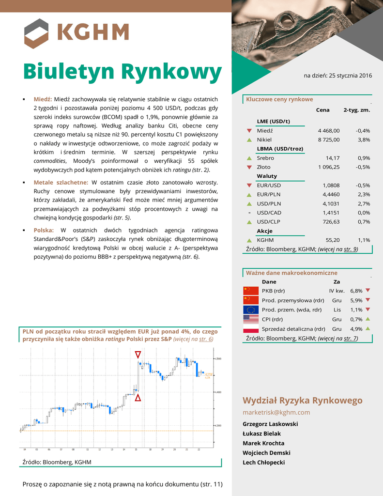Biuletyn Rynkowy Miedź: Miedź zachowywała się relatywnie stabilnie w ciągu ostatnich na dzień: 25 stycznia 2016 Kluczowe ceny rynkowe 2 tygodni i pozostawała poniżej poziomu 4 500 USD/t, podczas gdy Cena szeroki indeks surowców (BCOM) spadł o 1,9%, ponownie głównie za sprawą ropy naftowej. Według analizy banku Citi, obecne ceny czerwonego metalu są niższe niż 90. percentyl kosztu C1 powiększony o nakłady w inwestycje odtworzeniowe, co może zagrozić podaży w krótkim i średnim commodities, terminie. Moody’s W szerszej poinformował o perspektywie weryfikacji 55 rynku spółek wydobywczych pod kątem potencjalnych obniżek ich ratingu (str. 2). Metale szlachetne: W ostatnim czasie złoto zanotowało wzrosty. Ruchy cenowe stymulowane były przewidywaniami inwestorów, którzy zakładali, że amerykański Fed może mieć mniej argumentów przemawiających za podwyżkami stóp procentowych z uwagi na chwiejną kondycję gospodarki (str. 5). Polska: W ostatnich dwóch tygodniach agencja 2-tyg. zm. LME (USD/t) q Miedź 4 468,00 -0,4% p Nikiel 8 725,00 3,8% 14,17 0,9% 1 096,25 -0,5% q EUR/USD 1,0808 -0,5% EUR/PLN 4,4460 2,3% p USD/PLN 4,1031 2,7% USD/CAD 1,4151 0,0% p USD/CLP 726,63 0,7% 55,20 1,1% LBMA (USD/troz) p Srebro q Złoto Waluty p ratingowa Akcje Standard&Poor’s (S&P) zaskoczyła rynek obniżając długoterminową p KGHM wiarygodność kredytową Polski w obcej walucie z A- (perspektywa Źródło: Bloomberg, KGHM; (więcej na str. 9) pozytywna) do poziomu BBB+ z perspektywą negatywną (str. 6). Ważne dane makroekonomiczne Dane PKB (rdr) PLN od początku roku stracił względem EUR już ponad 4%, do czego przyczyniła się także obniżka ratingu Polski przez S&P (więcej na str. 6) Za IV kw. 6,8% q Prod. przemysłowa (rdr) Gru 5,9% q Prod. przem. (wda, rdr) Lis 1,1% q CPI (rdr) Gru 0,7% p Sprzedaż detaliczna (rdr) Gru 4,9% p Źródło: Bloomberg, KGHM; (więcej na str. 7) Wydział Ryzyka Rynkowego [email protected] Grzegorz Laskowski Łukasz Bielak Marek Krochta Wojciech Demski Źródło: Bloomberg, KGHM Proszę o zapoznanie się z notą prawną na końcu dokumentu (str. 11) Lech Chłopecki Biuletyn Rynkowy | 25 stycznia 2016 Metale bazowe i szlachetne | Pozostałe surowce Miedź Miedź zachowywała się relatywnie stabilnie w ciągu ostatnich 2 tygodni i pozostawała poniżej poziomu 4 500 USD/t, podczas gdy szeroki indeks surowców (BCOM) spadł o 1,9%, ponownie głównie za sprawą ropy naftowej. Według analizy banku Citi, obecne ceny czerwonego metalu są niższe niż 90. percentyl kosztu C1 powiększony o nakłady w inwestycje odtworzeniowe, co może zagrozić podaży w krótkim i średnim terminie. W szerszej perspektywie rynku commodities, Moody’s poinformował o weryfikacji 55 spółek wydobywczych pod kątem potencjalnych obniżek ich ratingu. Niskie ceny zagrażają podaży w krótkim i średnim terminie Malejące budżety na inwestycje odtworzeniowe oraz spadające ceny surowców towarzyszących zagrażają ambitnym planom producentów, by redukować koszty. Według analiz Citi, niektórzy wydobywcy w ubiegłym roku dostosowali swoje koszty do trendu cenowego, jednak dalsze ograniczanie nakładów odtworzeniowych może doprowadzić do zacofania technicznego, które niekorzystnie wpłynie na obecnie już słaby wzrost podaży w krótkim i średnim terminie. Pomimo 33-procentowego spadku nakładów odtworzeniowych 20% podaży na świecie notuje straty W poprzednich spadkowych cyklach, koszt C1 wraz z nakładami na inwestycje odtworzeniowe wyznaczały dolną granicę ceny miedzi – w latach 1991-94 oraz 1997-99 cena czerwonego metalu nie pozostawała długo poniżej tej sumy. Dane Wood Mackenzie sugerują, że poziom tych kosztów wynosi obecnie 4 950 USD/t, choć w zeszłym roku było to średnio 5 265 USD/t. Spadek ten wynika głównie z 33-procentowej obniżki nakładów odtworzeniowych: z 780 USD/t do 525 USD/t. Nawet jednak to załamanie się wydatków odtworzeniowych nie powstrzymuje 20% światowych producentów metalu przed notowaniem strat. Pomimo znaczącego ograniczania nakładów odtworzeniowych w kopalniach krajów rozwiniętych, dane Wood Mackenzie sugerują, że dalsze prawdopodobne cięcia spowodują kolejne ograniczenia produkcji – ze względów technicznych lub ekonomicznych. CRU International przewiduje, że globalna produkcja górnicza miedzi wzrośnie w tym roku jedynie o 0.5%, po wzroście o 3.0% w ubiegłym roku, natomiast produkcja rafinowanej postaci metalu zmniejszy się. Zakłócenia produkcji w 2015 r. wyniosły 9% i w 2016 r. również mają być wysokie Citi szacuje, że w 2015 r. niezrealizowana w stosunku do planów z początku roku produkcja miedzi wyniosła 9%, dużo powyżej zakładanego poziomu. Analitycy przewidują, że stopa zakłóceń podaży będzie wysoka również w bieżącym roku, także dlatego, że wiele ze znajdujących się w rudzie miedzi metali towarzyszących straciło na wartości, co zmniejsza zachętę do uważnego zarządzania kosztami operacyjnymi. Cięcia produkcji w tym roku już się w zasadzie zaczęły: Imperial Metals poinformowała, że jej kanadyjska kopalnia 2 / 11 Biuletyn Rynkowy | 25 stycznia 2016 Huckelberry, wytwarzająca 20 tys. ton metalu rocznie, zostanie zamknięta w ciągu najbliższych trzech miesięcy, a Freeport McMoRan potwierdził 75procentowe ograniczenie produkcji koncentratu w kopalni Sierrita od 18 stycznia. Z kolei First Quantum ogłosiła plany zwolnienia 730 z ok. 1500 pracowników w zambijskiej Sentinel, z powodu powtarzających się problemów z niedoborem energii elektrycznej. Ceny miedzi spadają szybciej niż suma 90. percentyla kosztu C1 i inwestycji odtworzeniowych (tys. USD/t) Źródło: Citi, KGHM Moody’s zweryfikuje ratingi 55 spółek górniczych By odzwierciedlić fundamentalną zmianę warunków w światowym sektorze wydobywczym, Moody’s zdecydował się na rewizję sytuacji finansowej 55 spółek górniczych, która zakończyć się mogę
