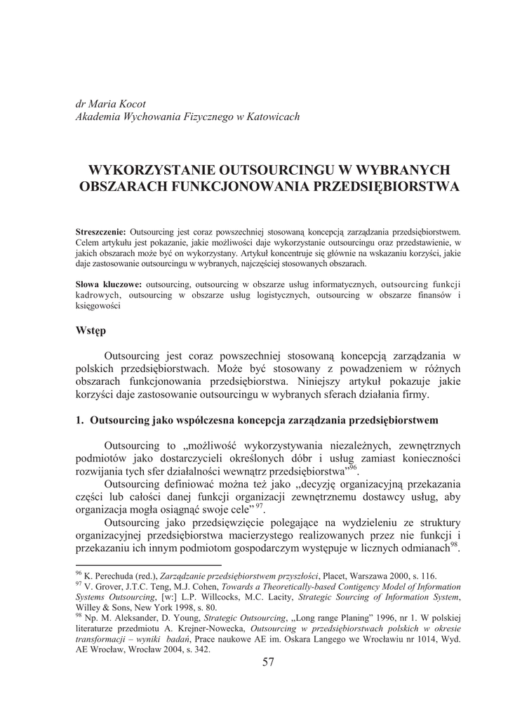 dr Maria Kocot Akademia Wychowania Fizycznego w Katowicach WYKORZYSTANIE OUTSOURCINGU W WYBRANYCH OBSZARACH FUNKCJONOWANIA PRZEDSIĘBIORSTWA Streszczenie: Outsourcing jest coraz powszechniej stosowaną koncepcją zarządzania przedsiębiorstwem. Celem artykułu jest pokazanie, jakie możliwości daje wykorzystanie outsourcingu oraz przedstawienie, w jakich obszarach może być on wykorzystany. Artykuł koncentruje się głównie na wskazaniu korzyści, jakie daje zastosowanie outsourcingu w wybranych, najczęściej stosowanych obszarach. Słowa kluczowe: outsourcing, outsourcing w obszarze usług informatycznych, outsourcing funkcji kadrowych, outsourcing w obszarze usług logistycznych, outsourcing w obszarze finansów i księgowości Wstęp Outsourcing jest coraz powszechniej stosowaną koncepcją zarządzania w polskich przedsiębiorstwach. Może być stosowany z powadzeniem w różnych obszarach funkcjonowania przedsiębiorstwa. Niniejszy artykuł pokazuje jakie korzyści daje zastosowanie outsourcingu w wybranych sferach działania firmy. 1. Outsourcing jako współczesna koncepcja zarządzania przedsiębiorstwem Outsourcing to „możliwość wykorzystywania niezależnych, zewnętrznych podmiotów jako dostarczycieli określonych dóbr i usług zamiast konieczności rozwijania tych sfer działalności wewnątrz przedsiębiorstwa”96. Outsourcing definiować można też jako ,,decyzję organizacyjną przekazania części lub całości danej funkcji organizacji zewnętrznemu dostawcy usług, aby organizacja mogła osiągnąć swoje cele” 97. Outsourcing jako przedsięwzięcie polegające na wydzieleniu ze struktury organizacyjnej przedsiębiorstwa macierzystego realizowanych przez nie funkcji i przekazaniu ich innym podmiotom gospodarczym występuje w licznych odmianach98. 96 K. Perechuda (red.), Zarządzanie przedsiębiorstwem przyszłości, Placet, Warszawa 2000, s. 116. V. Grover, J.T.C. Teng, M.J. Cohen, Towards a Theoretically-based Contigency Model of Information Systems Outsourcing, [w:] L.P. Willcocks, M.C. Lacity, Strategic Sourcing of Information System, Willey & Sons, New York 1998, s. 80. 98 Np. M. Aleksander, D. Young, Strategic Outsourcing, ,,Long range Planing” 1996, nr 1. W polskiej literaturze przedmiotu A. Krejner-Nowecka, Outsourcing w przedsiębiorstwach polskich w okresie transformacji – wyniki badań, Prace naukowe AE im. Oskara Langego we Wrocławiu nr 1014, Wyd. AE Wrocław, Wrocław 2004, s. 342. 97 57 Outsourcing postrzegany jest jako działanie polegające na przenoszeniu niektórych okresowych (powtarzanych), wewnętrznych elementów działalności firmy (organizacji) i uprawnień decyzyjnych, zewnętrznym podmiotom w formie kontraktu. Ponieważ działania firmy są okresowe i opierają się na kontrakcie, outsourcing wykracza poza wykorzystanie konsultantów. W praktyce nie tylko działania firmy są przenoszone, ale często także czynniki produkcji oraz uprawnienia decyzyjne (zarządzanie). Czynniki produkcji to zasoby, które pozwalają na prowadzenie działalności i obejmują ludzi, wyposażenie, sprzęt, technologię i inne aktywa. Uprawnienia decyzyjne są narzędziem umożliwiającym podejmowanie decyzji dotyczących określonych elementów przeniesionej działalności99. Przedsiębiorstwa stosują outsourcing głównie z powodów strategicznych, takich jak100: poprawa pozycji firmy, otrzymanie światowej klasy kompetencji, zwiększenie korzyści poprzez reinżynierię, zarządzanie ryzykiem, zdobycie umiejętności, osiągniecie elastyczności. Najczęściej wyróżniane kategorie celów i oczekiwane efekty outsourcingu przedstawia tabela 1. Tabela 1. Cele i oczekiwane efekty outsourcingu Grupa celów Cele strategiczne Cele rynkowe Cele ekonomiczne Cele organizacyjne Cele motywacyjne Oczekiwany efekt Koncentracja na problemach strategicznych Zwiększanie swobody strategicznej działalności Zwiększanie skuteczności i efektywności Zwiększanie elastyczności działalności Dostęp do know-how Poprawa pozycji konkurencyjnej Zwiększenie skali działalności Dywersyfikacja lub koncentracja działalności Zwiększenie przychodów Redukcja kosztów Poprawa wyników ekonomicznych Ograniczenie ryzyka ekonomicznego „Odchudzenie” struktury organizacyjnej Uproszczenie struktur i procesów organizacyjnych Obiektywizacja wyników ekonomicznych Upowszechnienie myślenia i działania ekonomicznego Rozwój przedsiębiorczości Silniejsza motywacja Źródło: M. Trocki, Outsourcing – metoda restrukturyzacji działalności gospodarczej, Wyd. PWE, Warszawa 2001, s. 52; www.placet.com.pl 99 M.F. Greaver, Strategic Outsourcing, A structural Approach Outsourcing Decision and Initiatives, Amacom, New York 1999, s. 3. 100 L. Beebe, B. Meyers, Outsourcing - Planning for Strategic Partnership, ,,The Sheridan Press” 1999, nr 1. 58 Można więc stwierdzić, iż wykorzystanie outsourcingu wiąże się z efektywniejszym zarządzaniem firmą, wyższą jakością usług oraz łatwiejszym dostępem do technologii i wiedzy. Dlatego też outsourcing jest chętnie stosowany w firmach w wielu obszarach. Najczęściej stosowane to: ę obszar usług informatycznych, funkcje działu personalnego, obszar logistyki, sfera finansów i księgowości. 2. Outsourcing w obszarze usług informatycznych Outsourcing w obszarze usług informatycznych (outsourcing IT, outsourcing systemów informatycznych, technologii informatycznych, informatyczny), definiowany jest jako dostarczenie kompleksowych rozwiązań e-biznesowych przez specjalistów z zewnątrz101. Outsourcing IT może być także rozumiany jako przejęcie przez firmę zewnętrzną obsługi określonych dziedzin działalności firmy, związanych z informatyką (wszystkich lub tylko wybranych obszarów). Inwestycje w technologię informatyczną oraz bieżące wydatki związane z obsługą infrastruktury informatycznej często stanowią znaczną część budżetu firmy. Zastosowane technologie informatyczne przez długi