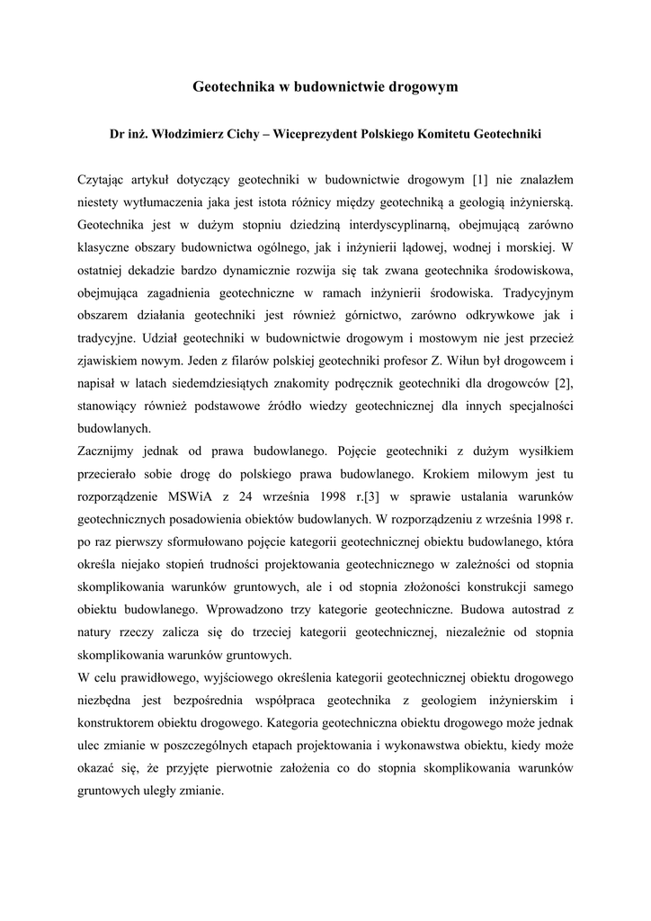 Geotechnika w budownictwie drogowym Dr inż. Włodzimierz Cichy – Wiceprezydent Polskiego Komitetu Geotechniki Czytając artykuł dotyczący geotechniki w budownictwie drogowym [1] nie znalazłem niestety wytłumaczenia jaka jest istota różnicy między geotechniką a geologią inżynierską. Geotechnika jest w dużym stopniu dziedziną interdyscyplinarną, obejmującą zarówno klasyczne obszary budownictwa ogólnego, jak i inżynierii lądowej, wodnej i morskiej. W ostatniej dekadzie bardzo dynamicznie rozwija się tak zwana geotechnika środowiskowa, obejmująca zagadnienia geotechniczne w ramach inżynierii środowiska. Tradycyjnym obszarem działania geotechniki jest również górnictwo, zarówno odkrywkowe jak i tradycyjne. Udział geotechniki w budownictwie drogowym i mostowym nie jest przecież zjawiskiem nowym. Jeden z filarów polskiej geotechniki profesor Z. Wiłun był drogowcem i napisał w latach siedemdziesiątych znakomity podręcznik geotechniki dla drogowców [2], stanowiący również podstawowe źródło wiedzy geotechnicznej dla innych specjalności budowlanych. Zacznijmy jednak od prawa budowlanego. Pojęcie geotechniki z dużym wysiłkiem przecierało sobie drogę do polskiego prawa budowlanego. Krokiem milowym jest tu rozporządzenie MSWiA z 24 września 1998 r.[3] w sprawie ustalania warunków geotechnicznych posadowienia obiektów budowlanych. W rozporządzeniu z września 1998 r. po raz pierwszy sformułowano pojęcie kategorii geotechnicznej obiektu budowlanego, która określa niejako stopień trudności projektowania geotechnicznego w zależności od stopnia skomplikowania warunków gruntowych, ale i od stopnia złożoności konstrukcji samego obiektu budowlanego. Wprowadzono trzy kategorie geotechniczne. Budowa autostrad z natury rzeczy zalicza się do trzeciej kategorii geotechnicznej, niezależnie od stopnia skomplikowania warunków gruntowych. W celu prawidłowego, wyjściowego określenia kategorii geotechnicznej obiektu drogowego niezbędna jest bezpośrednia współpraca geotechnika z geologiem inżynierskim i konstruktorem obiektu drogowego. Kategoria geotechniczna obiektu drogowego może jednak ulec zmianie w poszczególnych etapach projektowania i wykonawstwa obiektu, kiedy może okazać się, że przyjęte pierwotnie założenia co do stopnia skomplikowania warunków gruntowych uległy zmianie. 2 Posadowienie nasypów drogowych na średnio zagęszczonych, zagęszczonych i bardzo zagęszczonych gruntach niespoistych oraz na twardoplastycznych, półzwartych i zwartych gruntach spoistych nie stanowi dla projektantów dróg większych problemów, pod warunkiem prawidłowego uregulowania stosunków wodnych w podłożu konstrukcji drogi. Problemy zaczynają się w przypadku posadowień na gruntach organicznych, gruntach spoistych w stanie miękkoplastycznym i płynnym a także gruntach niespoistych w stanie luźnym. Istotne problemy stwarzają również grunty pęczniejące, zapadowe, obszary występowania zjawisk krasowych, aktywne tereny osuwisk itp. Pojęcie projektowania geotechnicznego zostało na początku lat dziewięćdziesiątych zdefiniowane przez autorów pierwszego projektu Eurokodu 7 „Geotechnical design”[4]. Projektowanie geotechniczne jest pojęciem znacznie wychodzącym poza zakres samych obliczeń posadowień konstrukcji drogowych. Prawidłowe projektowanie geotechniczne dróg i mostów wymaga bardzo ścisłej współpracy geotechników, konstruktorów dróg i geologów inżynierskich. Na rys. 1 przedstawiono schemat projektowania geotechnicznego, przedstawiający wzajemne powiązania poszczególnych elementów tego projektowania. Do podstawowych elementów projektowania geotechnicznego należą: a) prawo budowlane, normy i instrukcje projektowania, b) wiercenia oraz badania polowe i laboratoryjne gruntów, c) ustalenie obciążeń i geometrii układu konstrukcyjnego: konstrukcja budowlana – podłoże gruntowe, d) technologia wykonawstwa robót, e) model obliczeń konstrukcyjnych, f) zagadnienia ochrony środowiska w geotechnice, g) geosyntetyki. O tym, że istnieją liczne, bardziej lub mniej skomplikowane zależności między tymi elementami projektowania geotechnicznego nie trzeba nikogo przekonywać. Najważniejszymi elementami tego schematu są wpływy przyjętego modelu obliczeniowego, rodzaju obciążeń działających na podłoże, ograniczeń ruchu konstrukcji, sposobu wykonawstwa i oczywiście norm i instrukcji na sposób badań laboratoryjnych i polowych gruntu. We współczesnej geotechnice drogowej niemożliwe jest prawidłowe rozpoznanie podłoża gruntowego bez wcześniejszych, bardzo szczegółowych uzgodnień między geotechnikiem, geologiem inżynierskim i konstruktorem obiektu drogowego. Niestety praktyka w tej dziedzinie w Polsce pozostawia wiele do życzenia. Projekt badań geologiczno- 3 inżynierskich nie jest uzgadniany z projektantem konstrukcji drogowych, a tym bardziej geotechnikiem, jeżeli projektant drogi zaprosi takiego do współpracy. Rys.1. Projektowanie geotechniczne Bardzo istotną rolę odgrywają w projektowaniu geotechnicznym badania wstępne podłoża gruntowego. Projekt badań wstępnych powinien być uzgodniony z posiadającym odpowiednie doświadczenie geotechnikiem, który jest w stanie określić strefę wzajemnego oddziaływania konstrukcji z podłożem gruntowym. W ten sposób uniknie się wielu projektów badań podłoża gruntowego, w których głębokość wierceń przyjmuje się na miarę możliwości 4 przedsiębiorstwa geologicznego, a nie rzeczywistych potrzeb projektowania geotechnicznego konstrukcji drogowej. Jako przykład można podać wiercenia do 3 lub 4 m głębokości w przypadku posadowień nasypów drogowych o wysokości przekraczającej 10.0 m. Zdarza się, że wiercenia te nie sięgają nawet spągu gruntów słabych. Jeszcze gorzej to wygląda w przypadku konieczności posadowienia fundamentu przyczółka na 20 metrowych palach. Stąd bardzo często występuje