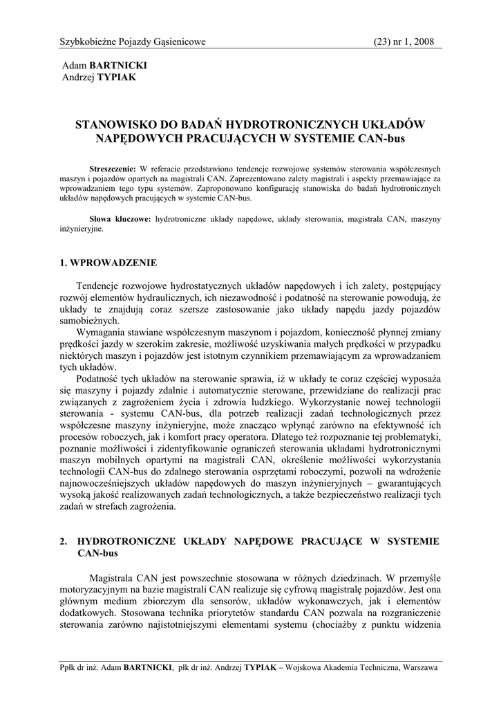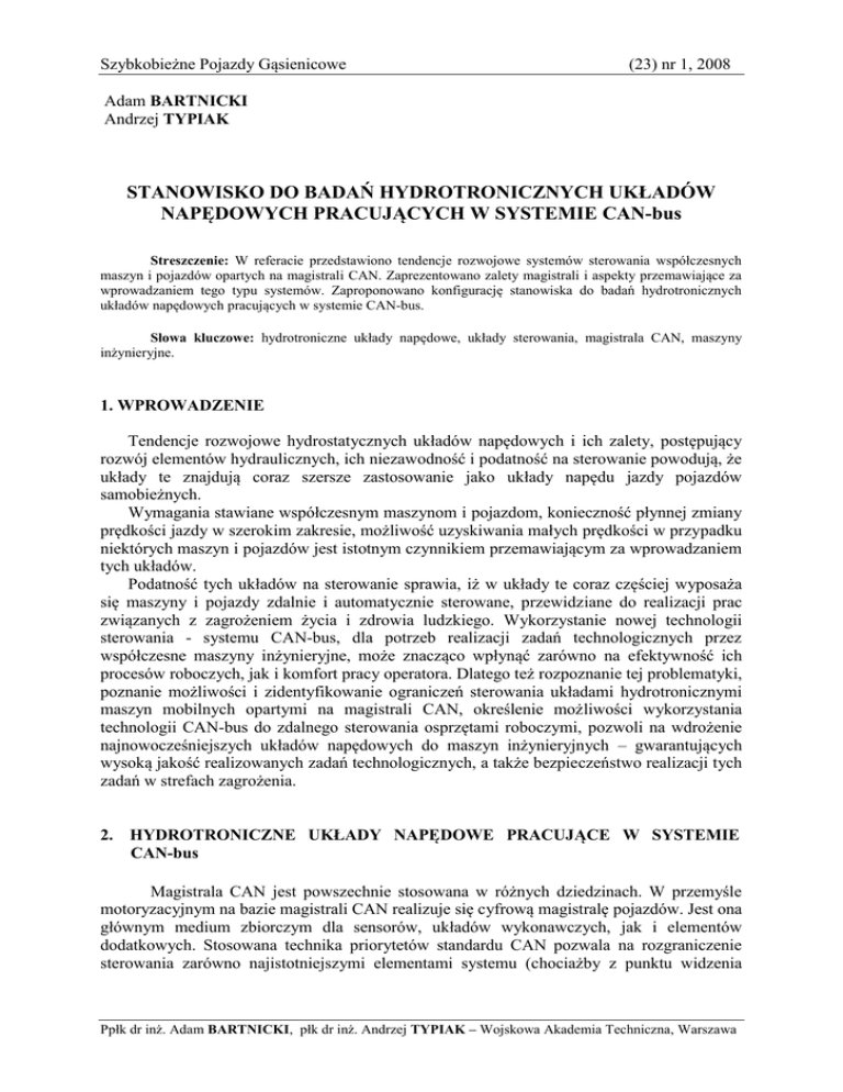 Szybkobieżne Pojazdy Gąsienicowe (23) nr 1, 2008 Adam BARTNICKI Andrzej TYPIAK STANOWISKO DO BADAŃ HYDROTRONICZNYCH UKŁADÓW NAPĘDOWYCH PRACUJĄCYCH W SYSTEMIE CAN-bus Streszczenie: W referacie przedstawiono tendencje rozwojowe systemów sterowania współczesnych maszyn i pojazdów opartych na magistrali CAN. Zaprezentowano zalety magistrali i aspekty przemawiające za wprowadzaniem tego typu systemów. Zaproponowano konfigurację stanowiska do badań hydrotronicznych układów napędowych pracujących w systemie CAN-bus. Słowa kluczowe: hydrotroniczne układy napędowe, układy sterowania, magistrala CAN, maszyny inżynieryjne. 1. WPROWADZENIE Tendencje rozwojowe hydrostatycznych układów napędowych i ich zalety, postępujący rozwój elementów hydraulicznych, ich niezawodność i podatność na sterowanie powodują, że układy te znajdują coraz szersze zastosowanie jako układy napędu jazdy pojazdów samobieżnych. Wymagania stawiane współczesnym maszynom i pojazdom, konieczność płynnej zmiany prędkości jazdy w szerokim zakresie, możliwość uzyskiwania małych prędkości w przypadku niektórych maszyn i pojazdów jest istotnym czynnikiem przemawiającym za wprowadzaniem tych układów. Podatność tych układów na sterowanie sprawia, iż w układy te coraz częściej wyposaża się maszyny i pojazdy zdalnie i automatycznie sterowane, przewidziane do realizacji prac związanych z zagrożeniem życia i zdrowia ludzkiego. Wykorzystanie nowej technologii sterowania - systemu CAN-bus, dla potrzeb realizacji zadań technologicznych przez współczesne maszyny inżynieryjne, może znacząco wpłynąć zarówno na efektywność ich procesów roboczych, jak i komfort pracy operatora. Dlatego też rozpoznanie tej problematyki, poznanie możliwości i zidentyfikowanie ograniczeń sterowania układami hydrotronicznymi maszyn mobilnych opartymi na magistrali CAN, określenie możliwości wykorzystania technologii CAN-bus do zdalnego sterowania osprzętami roboczymi, pozwoli na wdrożenie najnowocześniejszych układów napędowych do maszyn inżynieryjnych – gwarantujących wysoką jakość realizowanych zadań technologicznych, a także bezpieczeństwo realizacji tych zadań w strefach zagrożenia. 2. HYDROTRONICZNE UKŁADY NAPĘDOWE PRACUJĄCE W SYSTEMIE CAN-bus Magistrala CAN jest powszechnie stosowana w różnych dziedzinach. W przemyśle motoryzacyjnym na bazie magistrali CAN realizuje się cyfrową magistralę pojazdów. Jest ona głównym medium zbiorczym dla sensorów, układów wykonawczych, jak i elementów dodatkowych. Stosowana technika priorytetów standardu CAN pozwala na rozgraniczenie sterowania zarówno najistotniejszymi elementami systemu (chociażby z punktu widzenia Ppłk dr inż. Adam BARTNICKI, płk dr inż. Andrzej TYPIAK – Wojskowa Akademia Techniczna, Warszawa Adam BARTNICKI, Andrzej TYPIAK zapewnienia bezpieczeństwa), jak i elementami mniej odpowiedzialnymi, spełniającymi często funkcje dodatkowe, poprawiające komfort poruszania się pojazdem. Postępujący rozwój współczesnych maszyn roboczych oraz ich układów sterowania powoduje powszechniejsze stosowanie układów hydraulicznych sterowanych elektronicznie. Umożliwiają one precyzyjne sterowanie ruchami elementów wykonawczych maszyny, proporcjonalnie do wysterowania dźwigni joysticka, a także automatyzację jej pracy. Coraz częściej układy te buduje się w oparciu o technologię CAN-bus. Jest to możliwe dzięki dostosowaniu elementów wykonawczych hydrostatycznych układów napędowych do funkcjonowania w sieci CAN. Na rynku można znaleźć wielu producentów, oferujących maszyny robocze wyposażone w tego typu aplikacje. Przykładem takiej konstrukcji może być maszyna ROPA Euro-MAUS 3 niemieckiej firmy ROPA Fahrzeug- und Maschinenbau GmbH (Rys.1). Jest to doczyszczarko-ładowarka buraków cukrowych, w której sterowanie i kontrola maszyny odbywa się z udziałem 3 komputerów pokładowych komunikujących się z terminalem za pośrednictwem systemu CAN-bus. Operator maszyny informowany jest w ten sposób o wszystkich zdarzeniach dotyczących maszyny, co powoduje znaczne jego odciążenie i zachowanie pełnej zdolności koncentracji. Rys.1. Doczyszczarko-ładowarka ROPA Euro-MAUS 3 Dzięki nowoczesnemu systemowi CAN-bus znajdującemu się w Euro-MAUS 3 możliwe jest zarówno kontrolowanie stanu technicznego maszyny, jak również dokonanie niezbędnych zmian i ustawień parametrów procesu technologicznego podczas jej pracy. Innym przykładem wykorzystania systemu CAN-bus w maszynach roboczych jest podziemna maszyna górnicza RTB-14 oferowana przez firmę Ruda Trading International z Katowic (Rys.2). Ten samojezdny wóz strzelniczy przeznaczony jest między innymi do realizacji prac związanych z zakładaniem ładunków materiału wybuchowego w podwyższonych wyrobiskach górniczych. RTB-14 powstał na bazie przegubowego podwozia RUDA TRUCK (RT), które jest wielofunkcyjnym podwoziem zaprojektowanym do pracy w najcięższych warunkach kopalnianych i stanowi bazę dla szerokiej gamy wozów do pracy w górnictwie podziemnym. Rys.2. Maszyna górnicza RTB-14 2 Stanowisko do badań hydrotronicznych układów napędowych pracujących w systemie CAN Monitorowanie stanu i pomiar parametrów pracy głównych układów maszyny odbywają się z wykorzystaniem technologii CAN-bus z dwoma jednostkami CPU. Informacje wyświetlane są na kolorowym panelu LCD, na który przesyłane są również obrazy z dwóch kamer umieszczonych z przodu i tyłu maszyny. Sterowanie pojazdem może odbywać się zarówno z pulpitu umieszczonego w kabinie operatora, jak również z kosza wysięgnika, przy czym komendy sterowania generowane z kosza mają wyższy priorytet. W ten sposób nadrzędne decyzje sterujące podejmuje operator znajdujący się w koszu wysięgnika. Dodatkową odporność systemu CAN-bus na zakłócenia procesu sterowania i diagnostyki uzyskano dzięki zastosowaniu technologii świat