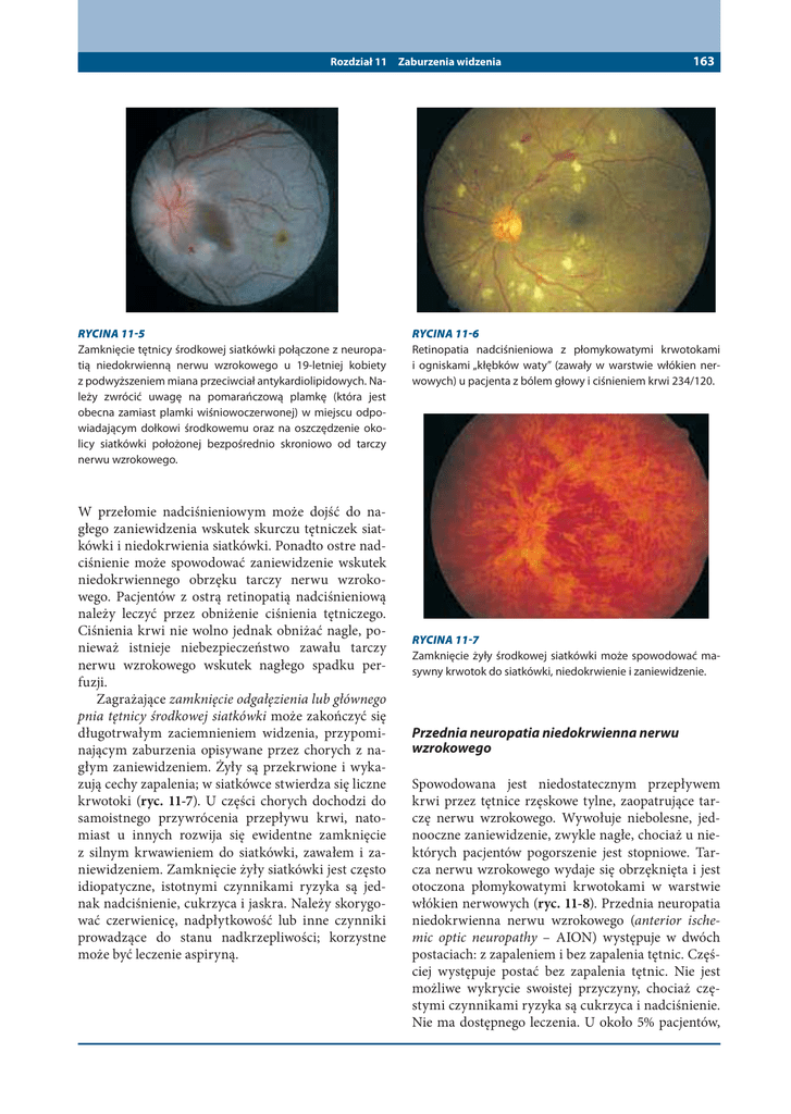 Rozdział 11 RYCINA 11-5 Zamknięcie tętnicy środkowej siatkówki połączone z neuropatią niedokrwienną nerwu wzrokowego u 19-letniej kobiety z podwyższeniem miana przeciwciał antykardiolipidowych. Należy zwrócić uwagę na pomarańczową plamkę (która jest obecna zamiast plamki wiśniowoczerwonej) w miejscu odpowiadającym dołkowi środkowemu oraz na oszczędzenie okolicy siatkówki położonej bezpośrednio skroniowo od tarczy nerwu wzrokowego. W przełomie nadciśnieniowym może dojść do nagłego zaniewidzenia wskutek skurczu tętniczek siatkówki i niedokrwienia siatkówki. Ponadto ostre nadciśnienie może spowodować zaniewidzenie wskutek niedokrwiennego obrzęku tarczy nerwu wzrokowego. Pacjentów z ostrą retinopatią nadciśnieniową należy leczyć przez obniżenie ciśnienia tętniczego. Ciśnienia krwi nie wolno jednak obniżać nagle, ponieważ istnieje niebezpieczeństwo zawału tarczy nerwu wzrokowego wskutek nagłego spadku perfuzji. Zagrażające zamknięcie odgałęzienia lub głównego pnia tętnicy środkowej siatkówki może zakończyć się długotrwałym zaciemnieniem widzenia, przypominającym zaburzenia opisywane przez chorych z nagłym zaniewidzeniem. Żyły są przekrwione i wykazują cechy zapalenia; w siatkówce stwierdza się liczne krwotoki (ryc. 11-7). U części chorych dochodzi do samoistnego przywrócenia przepływu krwi, natomiast u innych rozwija się ewidentne zamknięcie z silnym krwawieniem do siatkówki, zawałem i zaniewidzeniem. Zamknięcie żyły siatkówki jest często idiopatyczne, istotnymi czynnikami ryzyka są jednak nadciśnienie, cukrzyca i jaskra. Należy skorygować czerwienicę, nadpłytkowość lub inne czynniki prowadzące do stanu nadkrzepliwości; korzystne może być leczenie aspiryną. Zaburzenia widzenia 163 RYCINA 11-6 Retinopatia nadciśnieniowa z płomykowatymi krwotokami i ogniskami „kłębków waty” (zawały w warstwie włókien nerwowych) u pacjenta z bólem głowy i ciśnieniem krwi 234/120. RYCINA 11-7 Zamknięcie żyły środkowej siatkówki może spowodować masywny krwotok do siatkówki, niedokrwienie i zaniewidzenie. Przednia neuropatia niedokrwienna nerwu wzrokowego Spowodowana jest niedostatecznym przepływem krwi przez tętnice rzęskowe tylne, zaopatrujące tarczę nerwu wzrokowego. Wywołuje niebolesne, jednooczne zaniewidzenie, zwykle nagłe, chociaż u niektórych pacjentów pogorszenie jest stopniowe. Tarcza nerwu wzrokowego wydaje się obrzęknięta i jest otoczona płomykowatymi krwotokami w warstwie włókien nerwowych (ryc. 11-8). Przednia neuropatia niedokrwienna nerwu wzrokowego (anterior ischemic optic neuropathy – AION) występuje w dwóch postaciach: z zapaleniem i bez zapalenia tętnic. Częściej występuje postać bez zapalenia tętnic. Nie jest możliwe wykrycie swoistej przyczyny, chociaż częstymi czynnikami ryzyka są cukrzyca i nadciśnienie. Nie ma dostępnego leczenia. U około 5% pacjentów, 164 Część II Objawy kliniczne chorób neurologicznych Zapalenie nerwu wzrokowego RYCINA 11-8 Przednia neuropatia nerwu wzrokowego z powodu zapalenia tętnicy skroniowej u 78-letniej kobiety, ze zblednięciem tarczy nerwu wzrokowego, krwotokiem, zaniewidzeniem, bólami mięśni; OB 86 mm/godz. zwłaszcza u osób powyżej 60. roku życia, rozwija się postać AION z zapaleniem tętnic: w połączeniu z olbrzymiokomórkowym zapaleniem tętnicy (skroniowej). Rozpoznanie AION z zapaleniem tętnic należy ustalić w trybie pilnym, co upoważnia do niezwłocznego włączenia glukokortykosteroidów w dużych dawkach w celu zapobieżenia ślepocie drugiego oka. Mogą być obecne objawy zespołu bólu wielomięśniowego z wysokim OB; oprócz OB podwyższone jest wtedy także stężenie białka C-reaktywnego. U pacjentów z zaniewidzeniem i podejrzeniem AION z zapaleniem tętnic obowiązuje biopsja tętnicy skroniowej w celu potwierdzenia rozpoznania. Glukokortykoidy należy włączyć natychmiast, nie czekając na wyniki biopsji. Rozpoznanie AION z zapaleniem tętnic w przypadku ujemnego wyniku biopsji tętnicy skroniowej jest wątpliwe, ale takie przypadki się zdarzają. Jest to częsta choroba zapalna nerwu wzrokowego. W badaniu klinicznym Optic Neuritis Treatment Trial (ONTT; badanie leczenia zapalenia nerwu wzrokowego) średni wiek pacjentów wyniósł 32 lata; 77% z nich stanowiły kobiety; u 92% obecny był ból oka (zwłaszcza przy ruchach gałek ocznych), zaś u 35% stwierdzano obrzęk tarczy nerwu wzrokowego. U większości pacjentów zmiana typu demielinizacji zlokalizowana była pozagałkowo, zaś dno oka we wstępnym badaniu wyglądało prawidłowo (ryc. 11-9), chociaż w ciągu kolejnych miesięcy stopniowo rozwijało się zblednięcie tarczy nerwu wzrokowego. Po jednorazowym epizodzie zapalenia nerwu wzrokowego u wszystkich pacjentów dochodzi do stopniowego odzyskania wzroku, nawet bez leczenia. Reguła ta jest tak pewna, że brak poprawy widzenia po pierwszym napadzie zapalenia nerwu wzrokowego podważa pierwotne rozpoznanie. Leczenie wysokimi dawkami metyloprednizolonu dożylnie (250 mg co sześć godzin przez trzy dni) nie zmienia ostatecznej ostrości wzroku (mierzonej sześć miesięcy po epizodzie), lecz powrót funkcji wzroku następuje szybciej. U części pacjentów zapalenie nerwu wzrokowego pozostaje objawem izolowanym, w badaniu ONTT wykazano jednak, że pięcioletnie skumulowane prawdopodobieństwo rozwoju klinicznie pewnego stwardnienia rozsianego (sclerosis multiplex – SM) po zapaleniu nerwu wzrokowego wynosi 30%. U pacjentów z dwiema lub więcej niż dwiema plakami demielinizacyjnymi w badaniu za pomocą rezonansu magnetycznego (MRI) mózgu pięcioletnie ryzyko zachorowania na SM rośnie do 45%; dowiedziono, że leczenie interferonem (IFN) β-1a opóźnia rozwój dodatkowych zmian i chroni przed ewolucją do SM. Tylna neuropatia niedokrwienna nerwu wzrokowego Jest to rzadka przyczyna ostrego zaniewidzenia, spowodowana połączeniem ciężkiej niedokrwis