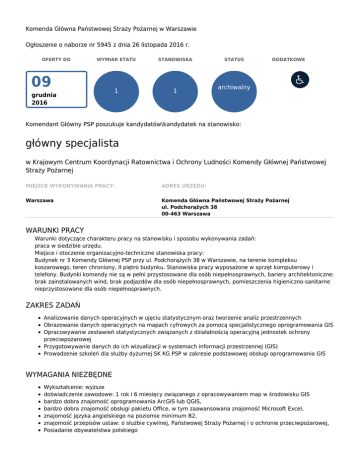 Komenda Główna Państwowej Straży Pożarnej w Warszawie Ogłoszenie o naborze nr 5945 z dnia 26 listopada 2016 r. OFERTY DO WYMIAR ETATU STANOWISKA 1 1 09 grudnia 2016 STATUS DODATKOWE archiwalny Komendant Główny PSP poszukuje kandydatów\kandydatek na stanowisko: główny specjalista w Krajowym Centrum Koordynacji Ratownictwa i Ochrony Ludności Komendy Głównej Państwowej Straży Pożarnej MIEJSCE WYKONYWANIA PRACY: ADRES URZĘDU: Warszawa Komenda Główna Państwowej Straży Pożarnej ul. Podchorążych 38 00-463 Warszawa WARUNKI PRACY Warunki dotyczące charakteru pracy na stanowisku i sposobu wykonywania zadań: praca w siedzibie urzędu. Miejsce i otoczenie organizacyjno-techniczne stanowiska pracy: Budynek nr 3 Komendy Głównej PSP przy ul. Podchorążych 38 w Warszawie, na terenie kompleksu koszarowego, teren chroniony, II piętro budynku. Stanowiska pracy wyposażone w sprzęt komputerowy i telefony. Budynki komendy nie są w pełni przystosowane dla osób niepełnosprawnych, bariery architektoniczne: brak zainstalowanych wind, brak podjazdów dla osób niepełnosprawnych, pomieszczenia higieniczno-sanitarne nieprzystosowane dla osób niepełnosprawnych. ZAKRES ZADAŃ Analizowanie danych operacyjnych w ujęciu statystycznym oraz tworzenie analiz przestrzennych Obrazowanie danych operacyjnych na mapach cyfrowych za pomocą specjalistycznego oprogramowania GIS Opracowywanie zestawień statystycznych związanych z działalnością operacyjną jednostek ochrony przeciwpożarowej Przygotowywanie danych do ich wizualizacji w systemach informacji przestrzennej (GIS) Prowadzenie szkoleń dla służby dyżurnej SK KG PSP w zakresie podstawowej obsługi oprogramowania GIS WYMAGANIA NIEZBĘDNE Wykształcenie: wyższe doświadczenie zawodowe: 1 rok i 6 miesięcy związanego z opracowywaniem map w środowisku GIS bardzo dobra znajomość oprogramowania ArcGIS lub QGIS, bardzo dobra znajomość obsługi pakietu Office, w tym zaawansowana znajomość Microsoft Excel, znajomość języka angielskiego na poziomie minimum B2, znajomość przepisów ustaw: o służbie cywilnej, Państwowej Straży Pożarnej i o ochronie przeciwpożarowej, Posiadanie obywatelstwa polskiego Korzystanie z pełni praw publicznych Nieskazanie prawomocnym wyrokiem za umyślne przestępstwo lub umyślne przestępstwo skarbowe WYMAGANIA DODATKOWE Wykształcenie: wyższe kierunek geodezja i kartografia DOKUMENTY I OŚWIADCZENIA NIEZBĘDNE Życiorys/CV i list motywacyjny Kopie dokumentów potwierdzających spełnienie wymagania niezbędnego w zakresie wykształcenia kopie dokumentów potwierdzających wymagane doświadczenie zawodowe i posiadane kwalifikacje (świadectwa pracy, zaświadczenia o zatrudnieniu, referencje odnośnie pracy wykonywanej na podstawie umowy cywilno prawnej wraz z okresami pracy) Oświadczenie o posiadaniu obywatelstwa polskiego albo kopia dokumentu potwierdzającego posiadanie polskiego obywatelstwa Oświadczenie o wyrażeniu zgody na przetwarzanie danych osobowych do celów naboru Oświadczenie o korzystaniu z pełni praw publicznych Oświadczenie o nieskazaniu prawomocnym wyrokiem za umyślne przestępstwo lub umyślne przestępstwo skarbowe DOKUMENTY I OŚWIADCZENIA DODATKOWE kopia dokumentu potwierdzającego niepełnosprawność - w przypadku kandydatek/kandydatów, zamierzających skorzystać z pierwszeństwa w zatrudnieniu w przypadku, gdy znajdą się w gronie najlepszych kandydatek/kandydatów Kopie dokumentów potwierdzających spełnienie wymagania dodatkowego w zakresie wykształcenia TERMINY I MIEJSCE SKŁADANIA DOKUMENTÓW Dokumenty należy złożyć do: 09 grudnia 2016 r. Decyduje data: stempla pocztowego / osobistego dostarczenia oferty do urzędu Miejsce składania dokumentów: Prosimy przesłać na adres: Komenda Główna Państwowej Straży Pożarnej Biuro Kadr i Organizacji ul. Podchorążych 38 00-463 Warszawa lub składać osobiście: w siedzibie Urzędu przy ul. Podchorążych 38 w Warszawie, w Kancelarii Ogólnej, w godzinach pracy: 8.15 do 16.15. INNE INFORMACJE: W miesiącu poprzedzającym datę upublicznienia ogłoszenia wskaźnik zatrudnienia osób niepełnosprawnych w urzędzie, w rozumieniu przepisów o rehabilitacji zawodowej i społecznej oraz zatrudnianiu osób niepełnosprawnych, nie wynosi co najmniej 6%. 1) Na kopercie i w liście motywacyjnym prosimy dopisać CKR – główny specjalista. W ofercie należy podać dane kontaktowe – adres do korespondencji, adres e-mail i numer telefonu. 2) Oferty otrzymane po terminie nie będą rozpatrywane. 3) Uwaga! Weryfikacja spełnienia przez kandydatów wymagań formalnych dokonana zostanie na podstawie dokumentów wymienionych w części „dokumenty i oświadczenia niezbędne”. W związku z tym podkreślamy, że kompletne aplikacje to takie, które zawierają wszystkie wymagane dokumenty i własnoręcznie podpisane oświadczenia. 4) Przekazanie dokumentów wymienionych w części „dokumenty i oświadczenia dodatkowe” nie jest obowiązkowe, jednak będą one podstawą przeprowadzenia oceny spełnienia wymagań dodatkowych przez kandydatów. 5) Planowane techniki i metody naboru: - test wiedzy, - ćwiczenie praktyczne w oprogramowaniu GIS, - rozmowa kwalifikacyjna. 6) Kandydaci zakwalifikowani do poszczególnych etapów selekcji zostaną powiadomieni o ich terminie telefonicznie lub pocztą elektroniczną. Osoby, których oferty zostaną rozpatrzone negatywnie, nie będą informowane. 7) Dokumenty kandydatów ujętych w protokole naboru przechowuje się przez okres 3 miesięcy od zakończenia procedury naboru zaś dokumenty pozostałych kandydatów przez okres 14 dni. 8) Oferty kandydatów niewyłonionych możliwe są do odebrania w ciągu 14 dni od dnia opublikowania wyniku naboru. Po upływie w/w terminów, dokumenty są komisyjnie niszczone. 9) Mnożnik kwoty bazowej dla stanowiska – 2,343. 10) Dodatkowe informacje: 22 523-33-33 (mł. bryg. Marek Marzec). Legenda Pierwszeństwo dla osób z niepełnospraw