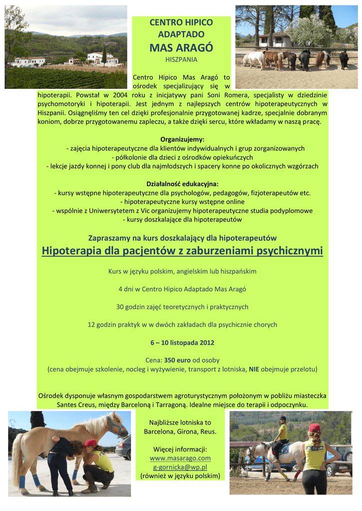 CENTRO HIPICO ADAPTADO MAS ARAGÓ HISZPANIA Centro Hipico Mas Aragó to ośrodek specjalizujący się w hipoterapii. Powstał w 2004 roku z inicjatywy pani Soni Romera, specjalisty w dziedzinie psychomotoryki i hipoterapii. Jest jednym z najlepszych centrów hipoterapeutycznych w Hiszpanii. Osiągnęliśmy ten cel dzięki profesjonalnie przygotowanej kadrze, specjalnie dobranym koniom, dobrze przygotowanemu zapleczu, a także dzięki sercu, które wkładamy w naszą pracę. Organizujemy: - zajęcia hipoterapeutyczne dla klientów indywidualnych i grup zorganizowanych - półkolonie dla dzieci z ośrodków opiekuńczych - lekcje jazdy konnej i pony club dla najmłodszych i spacery konne po okolicznych wzgórzach Działalność edukacyjna: - kursy wstępne hipoterapeutyczne dla psychologów, pedagogów, fizjoterapeutów etc. - hipoterapeutyczne kursy wstępne online - wspólnie z Uniwersytetem z Vic organizujemy hipoterapeutyczne studia podyplomowe - kursy doszkalające dla hipoterapeutów Zapraszamy na kurs doszkalający dla hipoterapeutów Hipoterapia dla pacjentów z zaburzeniami psychicznymi Kurs w języku polskim, angielskim lub hiszpańskim 4 dni w Centro Hipico Adaptado Mas Aragó 30 godzin zajęć teoretycznych i praktycznych 12 godzin praktyk w w dwóch zakładach dla psychicznie chorych 6 – 10 listopada 2012 Cena: 350 euro od osoby (cena obejmuje szkolenie, nocleg i wyżywienie, transport z lotniska, NIE obejmuje przelotu) Ośrodek dysponuje własnym gospodarstwem agroturystycznym położonym w pobliżu miasteczka Santes Creus, między Barceloną i Tarragoną. Idealne miejsce do terapii i odpoczynku. Najbliższe lotniska to Barcelona, Girona, Reus. Więcej informacji: www.masarago.com [email protected] (również w języku polskim) Szczegółowy program kursu: Hipoterapia dla pacjentów z zaburzeniami psychicznymi BLOK I: TEORIA (10 GODZIN) 1. Definicja hipoterapii. 2. Zaburzenia psychiczne a hipoterapia. - Podstawowe zaburzenia psychiczne, definicje, charakterystyka i cele terapii: *autyzm *schizofrenia *zaburzenia psychotyczne *zaburzenie obsesyjno – kompulsywne *inne - Metody pracy : *struktura sesji terapeutycznej *podejście psycho-motoryczne do hipoterapii * horsemanship – jako metoda treningu konia do terapii i metoda pracy hipoterapeuty BLOK II: PRAKTYKA (20 GODZIN) 1. 12 godzin praktyk i obserwacji hipoterapii w dwóch zakładach dla psychicznie chorych (Centro de Salud Mental Marinada i Centro de Salud Mental Villablanca) 2. Praktyka w Centro Hipico Adaptado Mas Aragó - Horsemanship: Round Pen Techniques, Gruond Work Techniques. - Woltyżerka terapeutyczna Więcej informacji: www.masarago.com [email protected] (również w języku polskim)