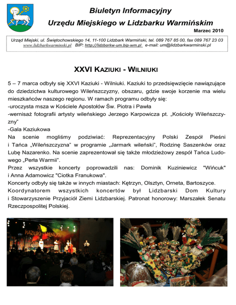 Biuletyn Informacyjny Urzędu Miejskiego w Lidzbarku Warmińskim Marzec 2010 Urząd Miejski, ul. Świętochowskiego 14, 11-100 Lidzbark Warmiński, tel. 089 767 85 00, fax 089 767 23 03 www.lidzbarkwarminski.pl BIP: http://lidzbarkw-um.bip-wm.pl e-mail: [email protected] XXVI KAZIUKI - WILNIUKI 5 – 7 marca odbyły się XXVI Kaziuki - Wilniuki. Kaziuki to przedsięwzięcie nawiązujące do dziedzictwa kulturowego Wileńszczyzny, obszaru, gdzie swoje korzenie ma wielu mieszkańców naszego regionu. W ramach programu odbyły się: -uroczysta msza w Kościele Apostołów Św. Piotra i Pawła -wernisaŜ fotografii artysty wileńskiego Jerzego Karpowicza pt. „Kościoły Wileńszczyzny” -Gala Kaziukowa Na scenie mogliśmy podziwiać: Reprezentacyjny Polski Zespół Pieśni i Tańca „Wileńszczyzna” w programie „Jarmark wileński”, Rodzinę Saszenków oraz Lubę Nazarenko. Na scenie zaprezentował się takŜe młodzieŜowy zespół Tańca Ludowego „Perła Warmii”. Przez wszystkie koncerty poprowadzili nas: Dominik Kuziniewicz "Wińcuk" i Anna Adamowicz "Ciotka Franukowa". Koncerty odbyły się takŜe w innych miastach: Kętrzyn, Olsztyn, Orneta, Bartoszyce. Koordynatorem wszystkich koncertów był Lidzbarski Dom Kultury i Stowarzyszenie Przyjaciół Ziemi Lidzbarskiej. Patronat honorowy: Marszałek Senatu Rzeczpospolitej Polskiej. 2 INFORMACJA O DZIAŁALNOŚCI REFERATU GEODEZJI I GOSPODARKI NIERUCHOMOŚCIAMI URZĘDU MIEJSKIEGO 40,20m2, 1. W miesiącu lutym 2010 roku na tablicy kowej połoŜonego ogłoszeń w Urzędzie Miejskim oraz na stro- w zabytkowej kamienicy w centrum miasta nach internetowych BIP ukazały się wykazy przy ul. Plac Wolności 3/4. nieruchomości przeznaczonych do sprzeda- 3. Sprzedano trzy lokale mieszkalne na rzecz najemców. Ŝy: - budynki mieszkalne – oficyny (pow. uŜytko- 4. Oddano w uŜytkowanie wieczyste: wa 94,61m2, 145,81m2) przeznaczone do - w formie bezprzetargowej, działkę nr 158/4 remontu, połoŜone w centrum miasta przy ul. zabudowaną garaŜem połoŜoną przy Konstytucji 3 Maja nr 14A i nr 16A oznaczo- ul. Lipowej, ne numerami 76/32 pow.59m2 - w formie bezprzetargowej, działkę nr 111/1 o i 76/46 o pow.119m2. na lepsze zagospodarowanie juŜ posiadanej - działki przy ul. Kard. Stef. Wyszyńskiego, nieruchomości połoŜoną przy ul. Pięknej, przeznaczone do sprzedaŜy na rzecz uŜyt- - w formie przetargu ustnego ograniczonego, kownika wieczystego, oznaczone numerami trzy działki zabudowane domkami letnisko161, 160/11 i 162/3 o ogólnej wymi w Ośrodku wypoczynkowym Kłębowo, 2 - w formie przetargu ustnego nieograniczone- pow. 1557m . - następnych 56 połoŜonych go, działek działkę nr 18/4 w Ośrodku wypoczynkowym Kłębowo, zabu- z przeznaczeniem na usługi połoŜoną przy dowanych domkami letniskowymi. ul. Dąbrowskiego. 2. Ogłoszono przetargi ustne nieograniczone 5. Rozstrzygnięto przetarg i wyłoniono wykona zbycie nieruchomości: -przedwojennego budynku nawców, na sporządzenie mieszkalnego operatów szacunkowych nieruchomości za- przy ul. Dębowej 6 połoŜonego w urokliwym budowanych, na określenie wartości gruntów zakątku miasta, nieopodal Wysokiej Bramy, oraz na wykonanie podziałów geodezyjnych na działce nr 40/32 o pow.492m2. Budynek na 2010 rok. o pow. uŜytkowej 93,34m2, przeznaczony do 6. remontu. Informujemy zainteresowanych o moŜliwości nabycia w uŜytkowanie wieczy- - budynku parterowego po byłej kotłowni przy ste działki przeznaczonej na usługi, połoŜoul. Polnej połoŜonego na obrzeŜach miasta, nej przy ul. J. Dąbrowskiego oznaczonej nr na działce nr 10/18 o pow. 222m2, przezna- 18/5 o powierzchni 2377m2. czonego do adaptacji na cele mieszkalne. - wolnego lokalu mieszkalnego o pow. uŜyt- 3 Uchwała Nr LI/373/10 Rady Miejskiej w Lidzbarku Warmińskim z dnia 17 lutego 2010 roku w sprawie podziału miasta Lidzbarka Warmińskiego na okręgi wyborcze dla wyboru Rady Miejskiej w Lidzbarku Warmińskim oraz ustalenie liczby wybieranych radnych w kaŜdym okręgu. Na podstawie art. 18 ust. 2 pkt 15 ustawy z dnia 8 marca 1990 roku o samorządzie gminnym (tekst jednolity Dz. U. z 2001 r. Nr 142, poz. 1591 zm. Dz. U. z 2002 r. Nr 23, poz. 220, Nr 62, poz. 558, Nr 113, poz. 984, Nr 153, poz. 1271, Nr 214, poz. 1806 z 2003 r. Nr 80, poz. 717, Nr 162, poz. 1568, z 2004 r. Nr 102, poz. 1055, Nr 116 poz. 1203, z 2005 r. Nr 172, poz. 1441, z 2006 r. Nr 17, poz. 128, Nr 181, poz.1337 z 2007 r. Nr 48, poz.327, Nr 138, poz.974, Nr 173, poz.1218 z 2008 r. Nr 180, poz.1111, Nr 223, poz. 1458 z 2009 r. Nr 52, poz.420, Nr 157, poz. 1241), art. 92 ustawy z dnia 16 lipca 1998 roku - Ordynacja Wyborcza do rad gmin , rad powiatów i sejmików województw (t.j. Dz. U. z 2003 r. Nr 159, poz. 1547, zm. Dz. U. z 2004 r. Nr 25, poz. 219, Nr 102, poz. 1055, Nr 167, poz. 1760, z 2005 r. Nr 175. poz. 1457, z 2006 r. Nr 17, poz. 128, Nr 34, poz. 242, Nr 146, poz. 1055, Nr 159, poz. 1127, Nr 218, poz. 1592, z 2007 r. Nr 25, poz. 162, Nr 48, poz. 327, Nr 112, poz. 766, z 2008 r. Nr 96, poz. 607, Nr 180, poz. 1111) Rada Miejska w Lidzbarku Warmińskim po uwzględnieniu wniosku Burmistrza uchwala, co następuje: § 1. Ustala się podział miasta Lidzbarka Warmińskiego na okręgi wyborcze dla wyboru Rady Miejskiej w Lidzbarku Warmińskim oraz liczbę wybieranych radnych w kaŜdym okręgu. Podział miasta na okręgi wyborcze oraz liczba wybieranych radnych stanowi załącznik Nr 1 do Uchwały. § 2. Tracą moc: 1) Uchwała Nr XLII/295/2002 Rady Miejskiej w Lidzbarku Warmińskim z dnia 5 lipca 2002 roku w sprawie podziału miasta Lidzbarka Warmińskiego na okręgi wyborcze dla wyboru Rady Miejskiej w Lidzbarku Warmińskim oraz ustalenie liczby wybieranych radnych w kaŜdym okręgu. 2) Uchwała Nr LI/309/06 Rady Miejskiej w Lidzbarku Warmińskim z dnia 30 sierpnia 2006 roku w sprawie zmiany uchwały w sprawie podziału miasta Lidzbarka Warmińskiego na okręgi wyborcze dla wyboru Rady Miejskiej w Lidzbarku Warmińskim oraz ustalenie