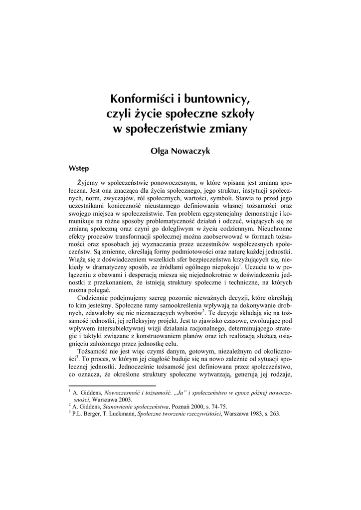 Konformiści i buntownicy, czyli życie społeczne szkoły w społeczeństwie zmiany Olga Nowaczyk Wstęp Żyjemy w społeczeństwie ponowoczesnym, w które wpisana jest zmiana społeczna. Jest ona znacząca dla życia społecznego, jego struktur, instytucji społecznych, norm, zwyczajów, ról społecznych, wartości, symboli. Stawia to przed jego uczestnikami konieczność nieustannego definiowania własnej tożsamości oraz swojego miejsca w społeczeństwie. Ten problem egzystencjalny demonstruje i komunikuje na różne sposoby problematyczność działań i odczuć, wiążących się ze zmianą społeczną oraz czyni go dolegliwym w życiu codziennym. Nieuchronne efekty procesów transformacji społecznej można zaobserwować w formach tożsamości oraz sposobach jej wyznaczania przez uczestników współczesnych społeczeństw. Są zmienne, określają formy podmiotowości oraz naturę każdej jednostki. Wiążą się z doświadczeniem wszelkich sfer bezpieczeństwa krzyżujących się, niekiedy w dramatyczny sposób, ze źródłami ogólnego niepokoju1. Uczucie to w połączeniu z obawami i desperacją miesza się niejednokrotnie w doświadczeniu jednostki z przekonaniem, że istnieją struktury społeczne i techniczne, na których można polegać. Codziennie podejmujemy szereg pozornie nieważnych decyzji, które określają to kim jesteśmy. Społeczne ramy samookreślenia wpływają na dokonywanie drobnych, zdawałoby się nic nieznaczących wyborów2. Te decyzje składają się na tożsamość jednostki, jej refleksyjny projekt. Jest to zjawisko czasowe, ewoluujące pod wpływem intersubiektywnej wizji działania racjonalnego, determinującego strategie i taktyki związane z konstruowaniem planów oraz ich realizacją służącą osiągnięciu założonego przez jednostkę celu. Tożsamość nie jest więc czymś danym, gotowym, niezależnym od okoliczno3 ści . To proces, w którym jej ciągłość buduje się na nowo zależnie od sytuacji społecznej jednostki. Jednocześnie tożsamość jest definiowana przez społeczeństwo, co oznacza, że określone struktury społeczne wytwarzają, generują jej rodzaje, 1 A. Giddens, Nowoczesność i tożsamość. „Ja” i społeczeństwo w epoce późnej nowoczesności, Warszawa 2003. 2 A. Giddens, Stanowienie społeczeństwa, Poznań 2000, s. 74-75. 3 P.L. Berger, T. Luckmann, Społeczne tworzenie rzeczywistości, Warszawa 1983, s. 263. 388 Olga Nowaczyk które dają się obserwować w życiu codziennym. Według Bergera i Luckmanna jest to całość względnie stała, choć współoddziałująca ze światem społecznym, który zamieszkuje. Jest nie tyle wynikiem okoliczności, ile efektem sytuacji przeżytych wcześniej4. Powstanie tożsamości jednostkowej jest uwarunkowane wystąpieniem „wzajemnego odzwierciedlenia”, zdaniem Luckmanna, swoistą syntezą, subiektywnym odzwierciedleniem instytucjonalnego porządku społeczeństwa5. 1. Opozycja konformizm – bunt jako wymiar tożsamości Współcześnie istnieje wiele form i wymiarów tożsamości. Najbardziej interesujący jest jej wymiar oparty na opozycji konformizm-bunt. Jest to ściśle socjologiczny aspekt omawianego zjawiska. Odnosi się bowiem do tożsamości charakteryzowanej ze względu na formę relacji podmiotu ze światem społecznym i wykorzystuje elementy znanej typologii sposobów indywidualnego przystosowania Roberta K. Mertona. Tutaj jest rozpatrywana jako zjawisko zlokalizowane, mieszczące się w pewnym typie ładu społecznego. Podstawowe cechy tożsamości odczytujemy w związku z tym przez odniesienie jej do konstruktywnych wartości tego ładu. Konformizm i bunt stanowią bowiem skrajnie różne postacie przystosowania do życia w społeczeństwie. Konformizm, przesądzający o trwałości ładu społecznego, uwarunkowany jest powszechnością skutecznych procesów internalizacji trwałych wartości oraz wzorów osobowych właściwych porządkowi społecznemu i składających się na repertuar identyfikacji tożsamościowych jednostki. Natomiast bunt występuje na wyraźnie innej płaszczyźnie. Stanowi przejściową reakcję, zmierzającą do zinstytucjonalizowania nowych celów i nowych metod, które mają się stać wspólną własnością innych członków społeczeństwa. Chodzi tu raczej o usiłowania zmiany istniejącej struktury kulturowej i społecznej niż o ulokowanie tych wysiłków wewnątrz tej struktury. W przypadku buntu bez trudu dostrzegamy jednak znaczny niekiedy potencjał tendencji postulujących powoływanie nowych tożsamości, wspierających się na systemowych wartościach konkurencyjnych wobec dominujących (konformistycznych) podstaw ładu społecznego6. Te dwa wymiary tożsamości wzajemnie ze sobą konkurują. Może to przypominać przeciągnie liny. Wygra silniejszy i on będzie dyktował warunki życia społecznego. „Buntownicy” i „konformiści” okopują się w specyficznych przestrzeniach społecznych: świadomościowych, symbolicznych oraz rzeczowych. Lokują się one w każdej sferze życia i stanowią swoiste enklawy społeczne. Odwołując się do koncepcji tożsamości można stwierdzić, że mechanizmy tożsamości społecznej włączają jednostkę świadomościowo w pewne struktury, z innych zaś wyłączają ją, przy czym owo wyłączenie jest równie ważne jak jej włączenie do struktur identy 4 Z. Bokszański, Tożsamość jednostki, „Kultura i Społeczeństwo” 1989, nr 2, s. 228. Tamże. 6 Z. Bokszański, Tożsamość zbiorowa, Warszawa 2008. 5 Konformiści i buntownicy, czyli życie społeczne szkoły w społeczeństwie zmiany 389 fikacji społecznej7. Dany obszar społeczny wyodrębnia się z otoczenia dzięki świadomościowej strukturalizacji dokonywanej przez jednostkę rozpoznającą siebie i świat społeczny. W tym sensie można mówić o enklawach społecznych. Podstawą wyodrębnienia się enklawy jest poczucie odrębności funkcjonujące w świadomości społecznej jej uczestników. Al