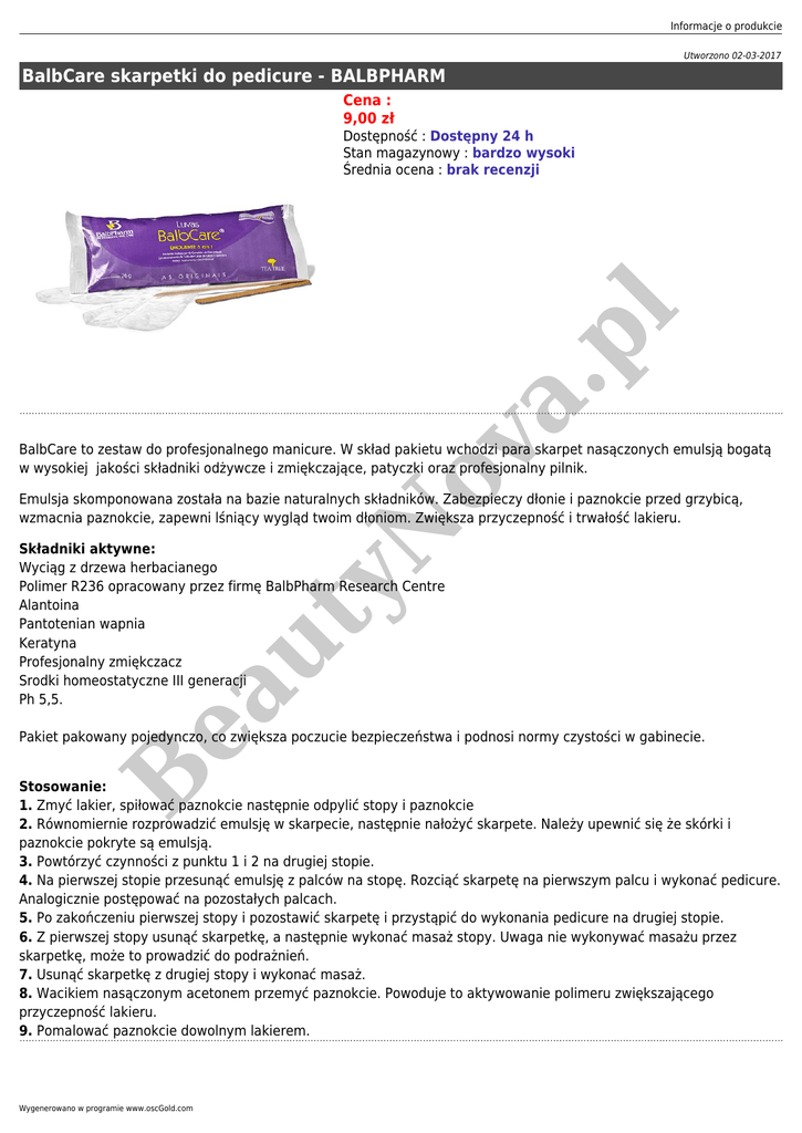 Informacje o produkcie Utworzono 02-03-2017 BalbCare skarpetki do pedicure - BALBPHARM Cena : 9,00 zł ov a. pl Dostępność : Dostępny 24 h Stan magazynowy : bardzo wysoki Średnia ocena : brak recenzji BalbCare to zestaw do profesjonalnego manicure. W skład pakietu wchodzi para skarpet nasączonych emulsją bogatą w wysokiej jakości składniki odżywcze i zmiękczające, patyczki oraz profesjonalny pilnik. yN Emulsja skomponowana została na bazie naturalnych składników. Zabezpieczy dłonie i paznokcie przed grzybicą, wzmacnia paznokcie, zapewni lśniący wygląd twoim dłoniom. Zwiększa przyczepność i trwałość lakieru. ea ut Składniki aktywne: Wyciąg z drzewa herbacianego Polimer R236 opracowany przez firmę BalbPharm Research Centre Alantoina Pantotenian wapnia Keratyna Profesjonalny zmiękczacz Srodki homeostatyczne III generacji Ph 5,5. B Pakiet pakowany pojedynczo, co zwiększa poczucie bezpieczeństwa i podnosi normy czystości w gabinecie. Stosowanie: 1. Zmyć lakier, spiłować paznokcie następnie odpylić stopy i paznokcie 2. Równomiernie rozprowadzić emulsję w skarpecie, następnie nałożyć skarpete. Należy upewnić się że skórki i paznokcie pokryte są emulsją. 3. Powtórzyć czynności z punktu 1 i 2 na drugiej stopie. 4. Na pierwszej stopie przesunąć emulsję z palców na stopę. Rozciąć skarpetę na pierwszym palcu i wykonać pedicure. Analogicznie postępować na pozostałych palcach. 5. Po zakończeniu pierwszej stopy i pozostawić skarpetę i przystąpić do wykonania pedicure na drugiej stopie. 6. Z pierwszej stopy usunąć skarpetkę, a następnie wykonać masaż stopy. Uwaga nie wykonywać masażu przez skarpetkę, może to prowadzić do podrażnień. 7. Usunąć skarpetkę z drugiej stopy i wykonać masaż. 8. Wacikiem nasączonym acetonem przemyć paznokcie. Powoduje to aktywowanie polimeru zwiększającego przyczepność lakieru. 9. Pomalować paznokcie dowolnym lakierem. Wygenerowano w programie www.oscGold.com